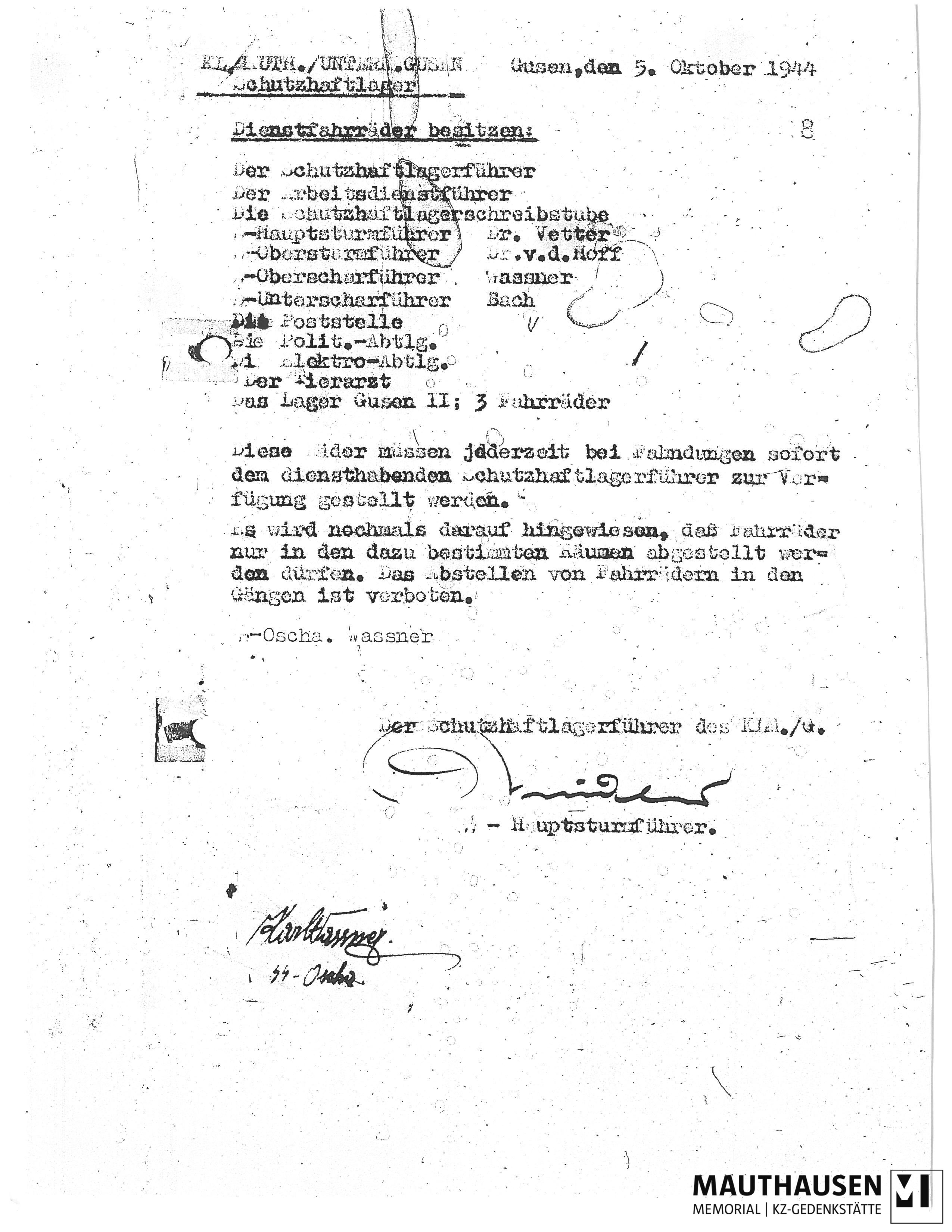 Anweisung des Schutzhaftlagerführers im KZ Gusen Karl Wassner über die Verwendung von Dienstfahrrädern des SS-Personals