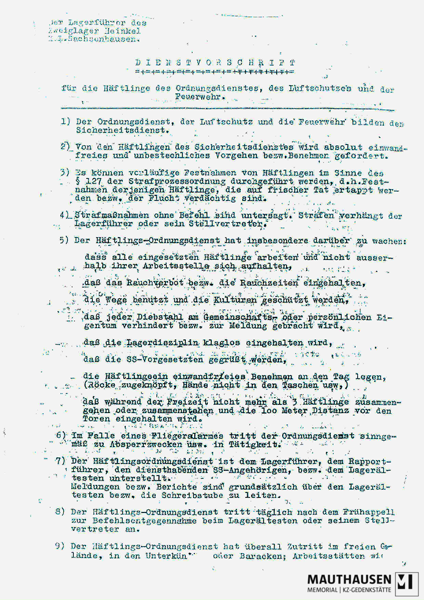 Dienstvorschrift für Häftlinge des Ordnungsdienstes, des Luftschutzes und der Feuerwehr für die Heinkel Werke des KL Sachsenhausen