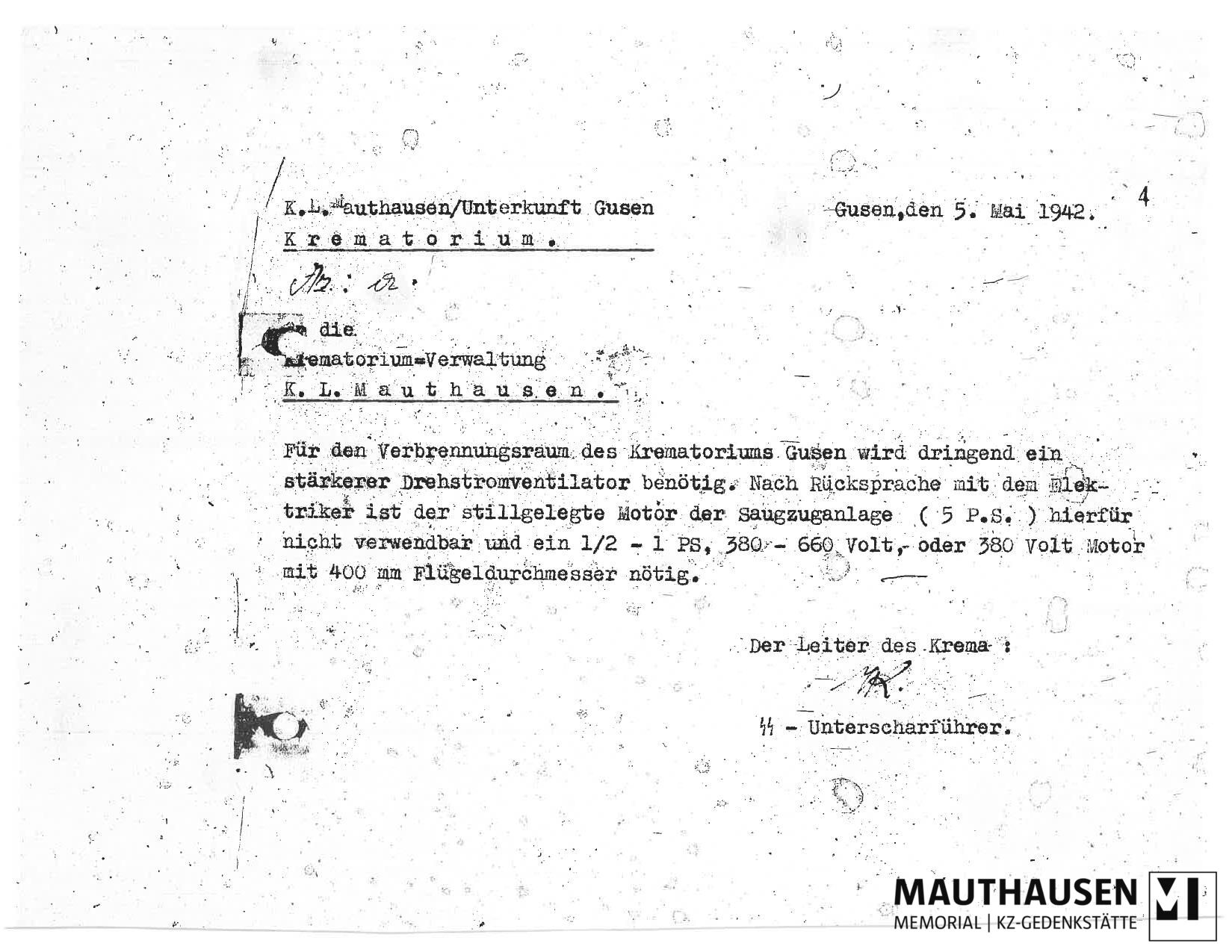 TitleSchreiben des Leiters des Krematoriums Gusen an die Krematoriumsverwaltung Mauthausen betreffend Anforderung eines stärkeren Drehstromventilators