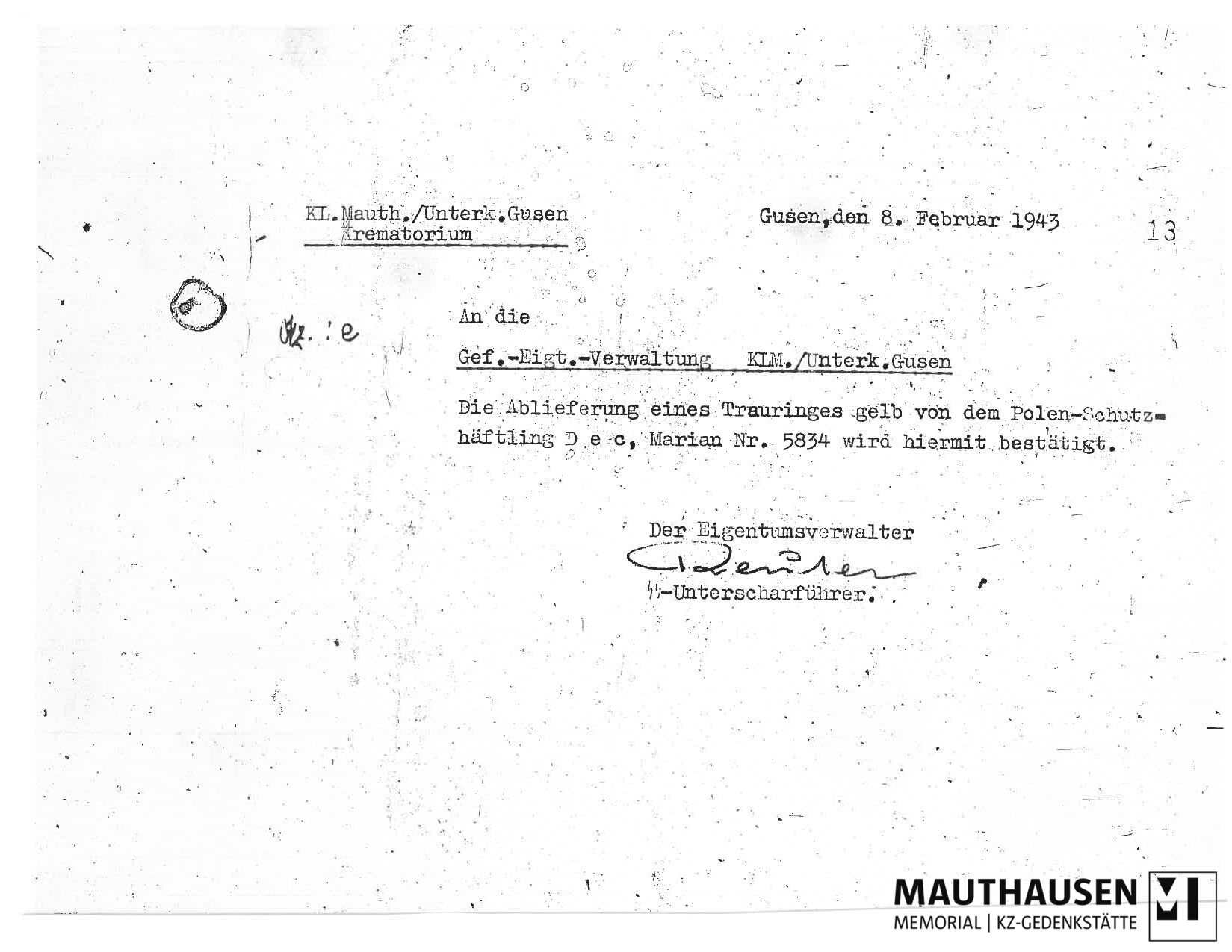 Korrespondenz zwischen dem Krematorium Gusen und der Gefangenen-Eigentumsverwaltung KLM/Unterkunft Gusen betreffend Ablieferung des Traurings eines verstorbenen polnischen Schutzhäftlings