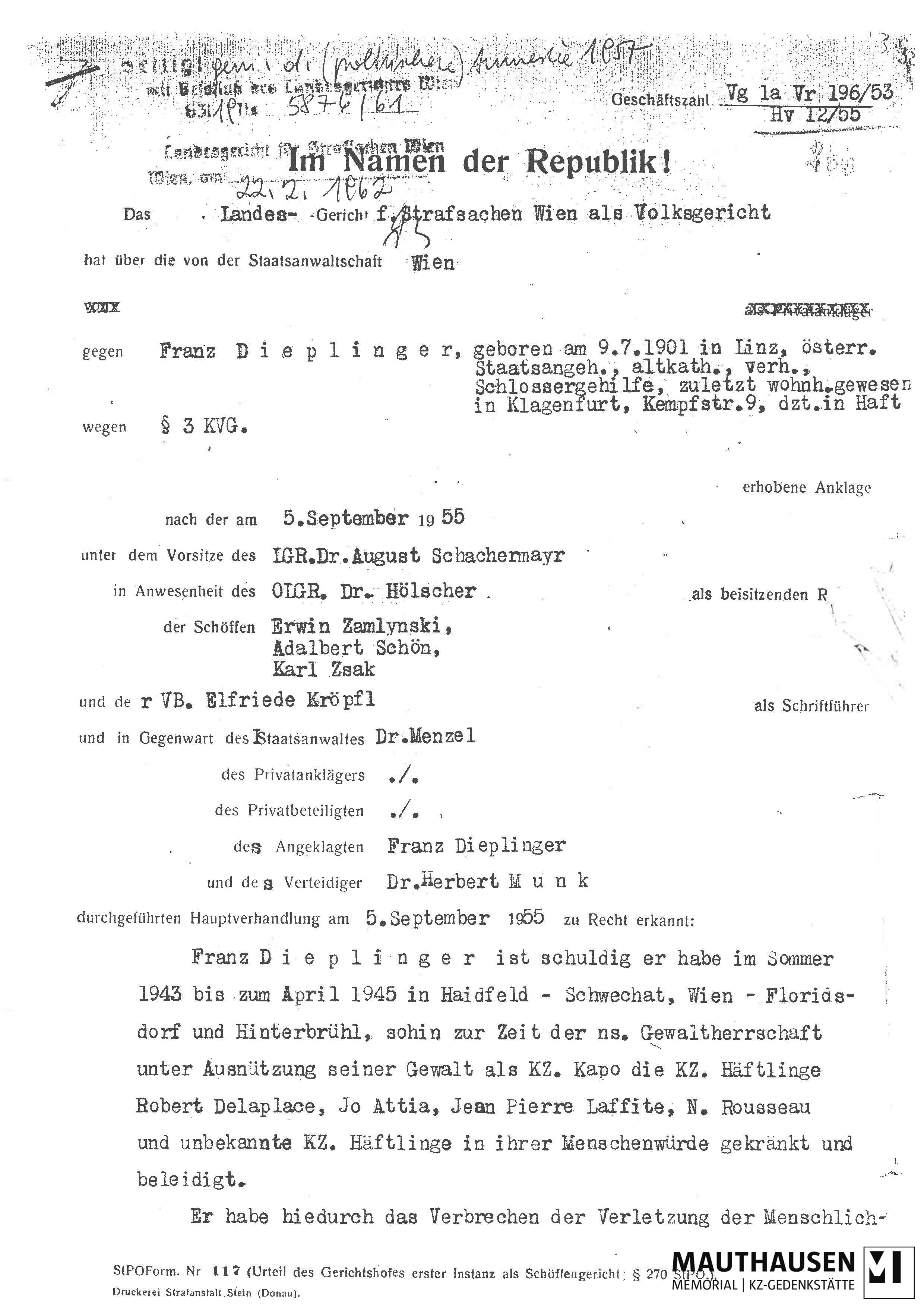 Content descriptionVg8Vr781/55 Band II; Urteilsspruch im Strafverfahren gegen Franz Dieplinger. Wien, 5.9.1955. Dieplinger wurde wegen Verletzung der Menschlichkeit und der Menschenwürde zu 6 Monaten Kerker verurteilt., Schwechat Floridsdorf Hinterbrühl