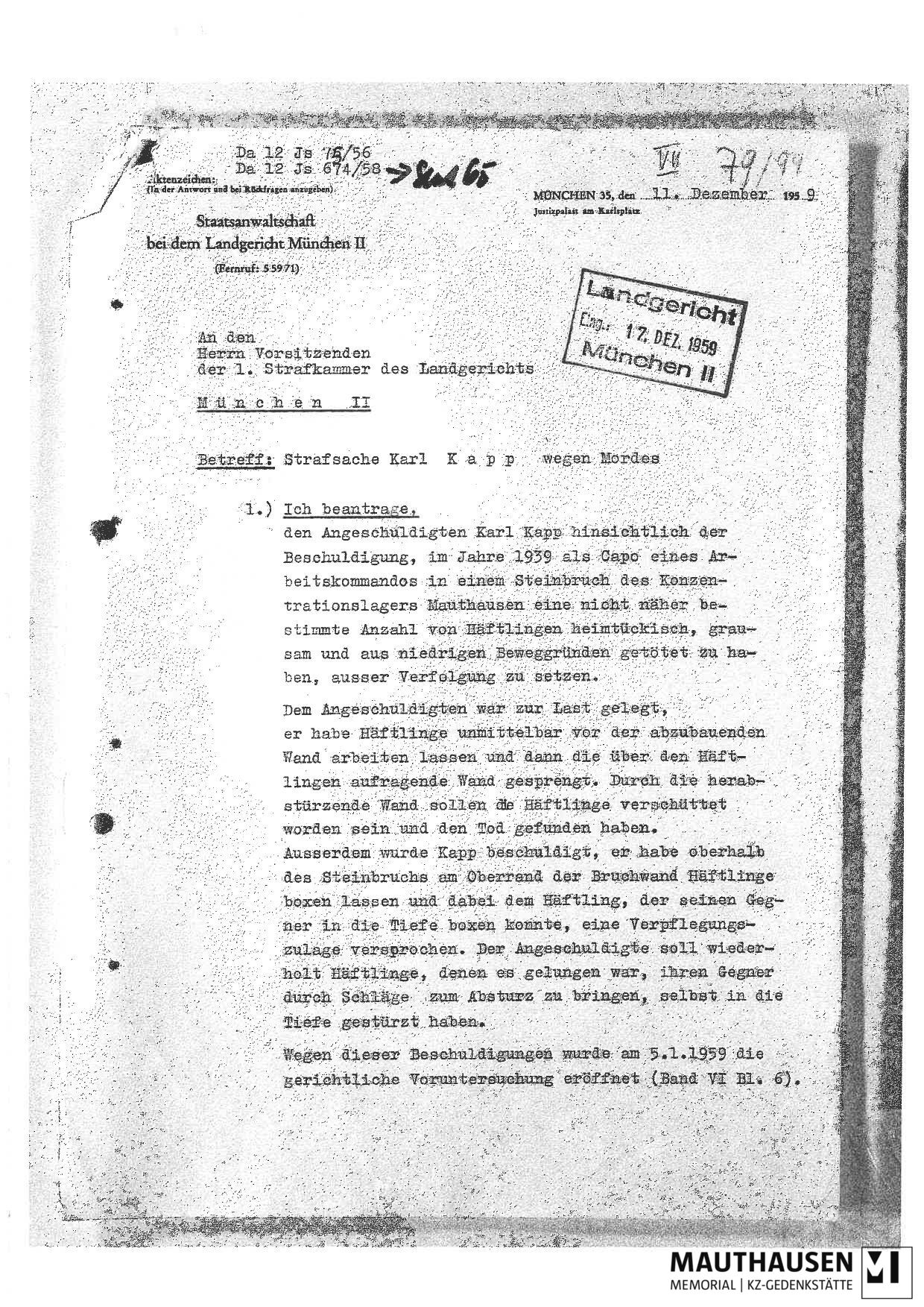 Strafverfahren gegen Karl Kapp, politischer Häftling in Dachau, Buchenwald und auch kurze Zeit in Mauthausen. Anklageschrift, Zeugeneinvernahme, Verhandlungsniederschrift und Urteilsschreiben.