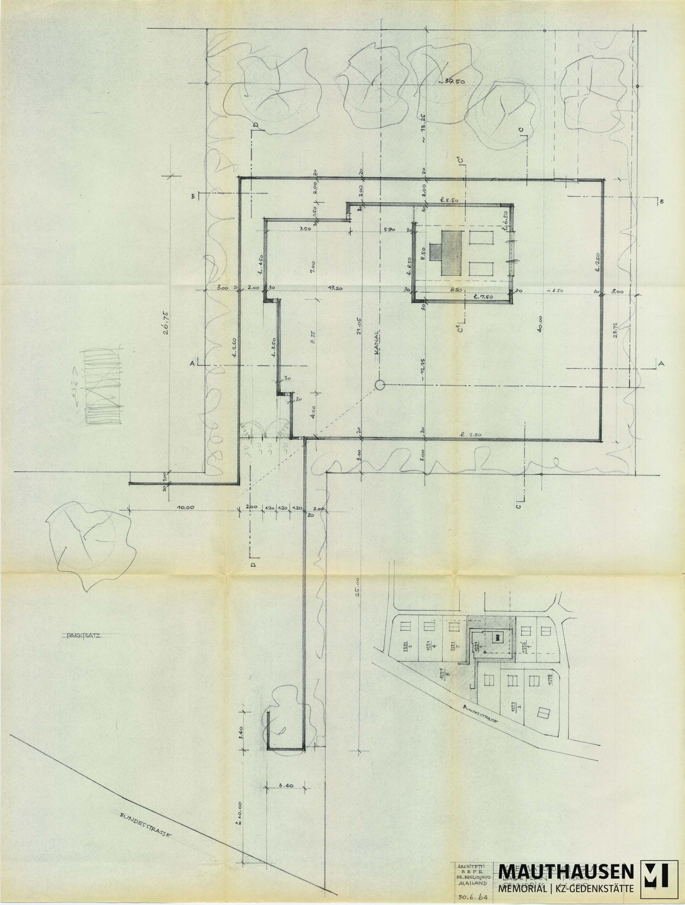 Content descriptionGrundriss (1:100) und Lageplan (1:1000) Krematorium Gusen; am 9. Juni 1997 von der Amicale, Paris (Jean Gavard) an Frau Martha Gammer übergeben, Amicale de Mauthausen, Paris