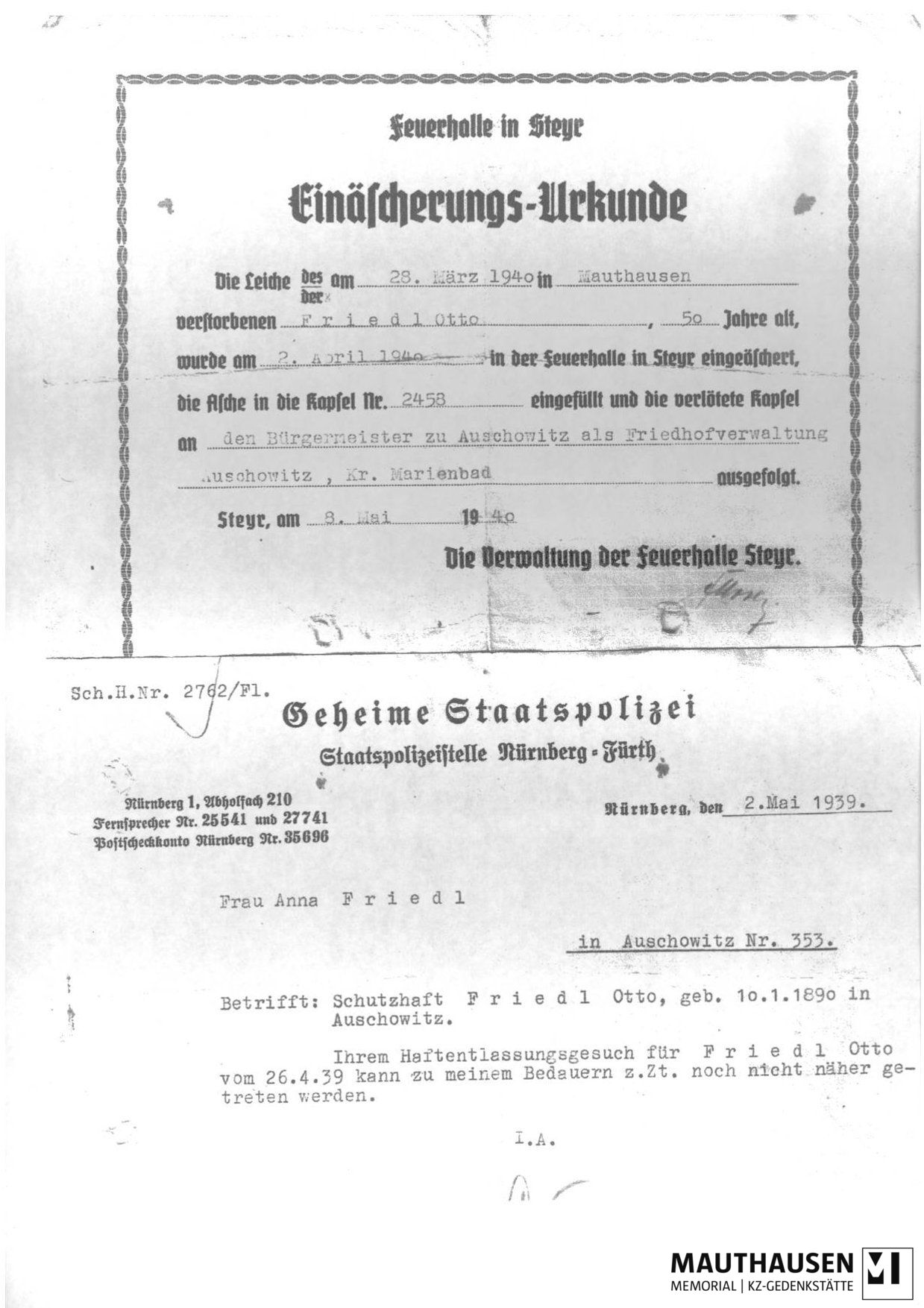 Content descriptionHäftlingspost vom 03.03.1940 von Häftling Otto Friedl; Einäscherungsurkunde ausgestellt von der Verwaltung der Feuerhalle in Steyr vom 8. Mai 1940; Schreiben der Gestapo Nürnberg an Frau Anna Friedl betreffend der Haftentlassung von Otto Friedl, der nicht, ehem. Häftlinge und Angehörige