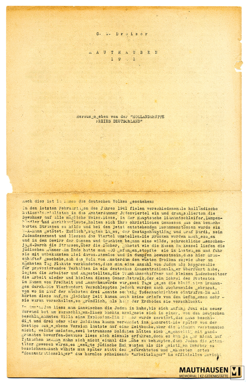Content description„Mauthausen 1941“. Hektografierte Flugschrift in deutscher Sprache (4 Digitalisate) sowie maschinengeschriebener Text mit handschriftliche Korrekturen in niederländischer Sprache (20 Digitalisate), verfasst von G.W. Dreiser (Pseudonym von Grete Weil), herausgegeben von der Holland-Gruppe „Freies Deutschland“, u.a. über das Schicksal der 400 jüdischen Männer, die im Februar 1941 in Amsterdam zusammengetrieben und nach Mauthausen deportiert wurden. Die Druckschrift wurde 1944 als illegales Flugblatt in den Niederlanden produziert und verteilt. Der Ehemann von Grete, Edgar Weil, wurde im Juni 1941 bei einer "Judenrazzia" in Amsterdam festgenommen und am 17. September 1941 in Mauthausen ermordet.