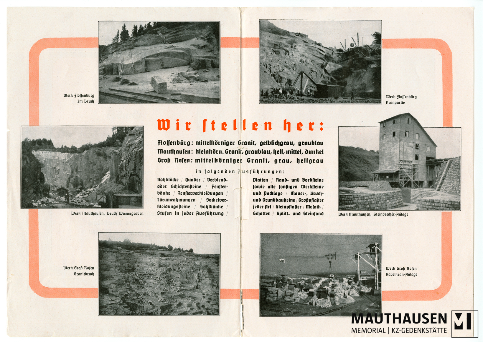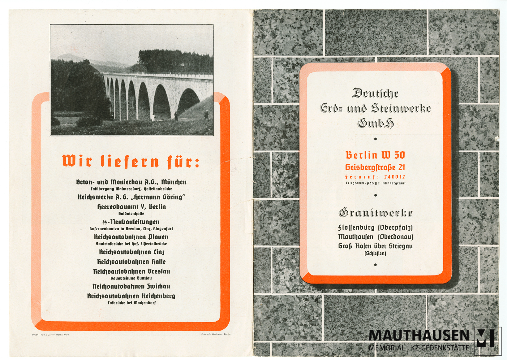 Content descriptionWerbeprospekt der Deutschen Erd- und Steinwerke GmbH (DESt) für die Produkte der Granitwerke Flossenbürg, Mauthausen und Groß-Rosen. Im Prospekt sind Fotografien des Steinbruchs Wiener Graben sowie der dortigen Steinbrecheranlage abgedruckt, ebenso der eine Fotografie der Holledaubrücke, einer Talbrücke der Reichsautobahn zwischen München und Nürnberg (heute A 9).
