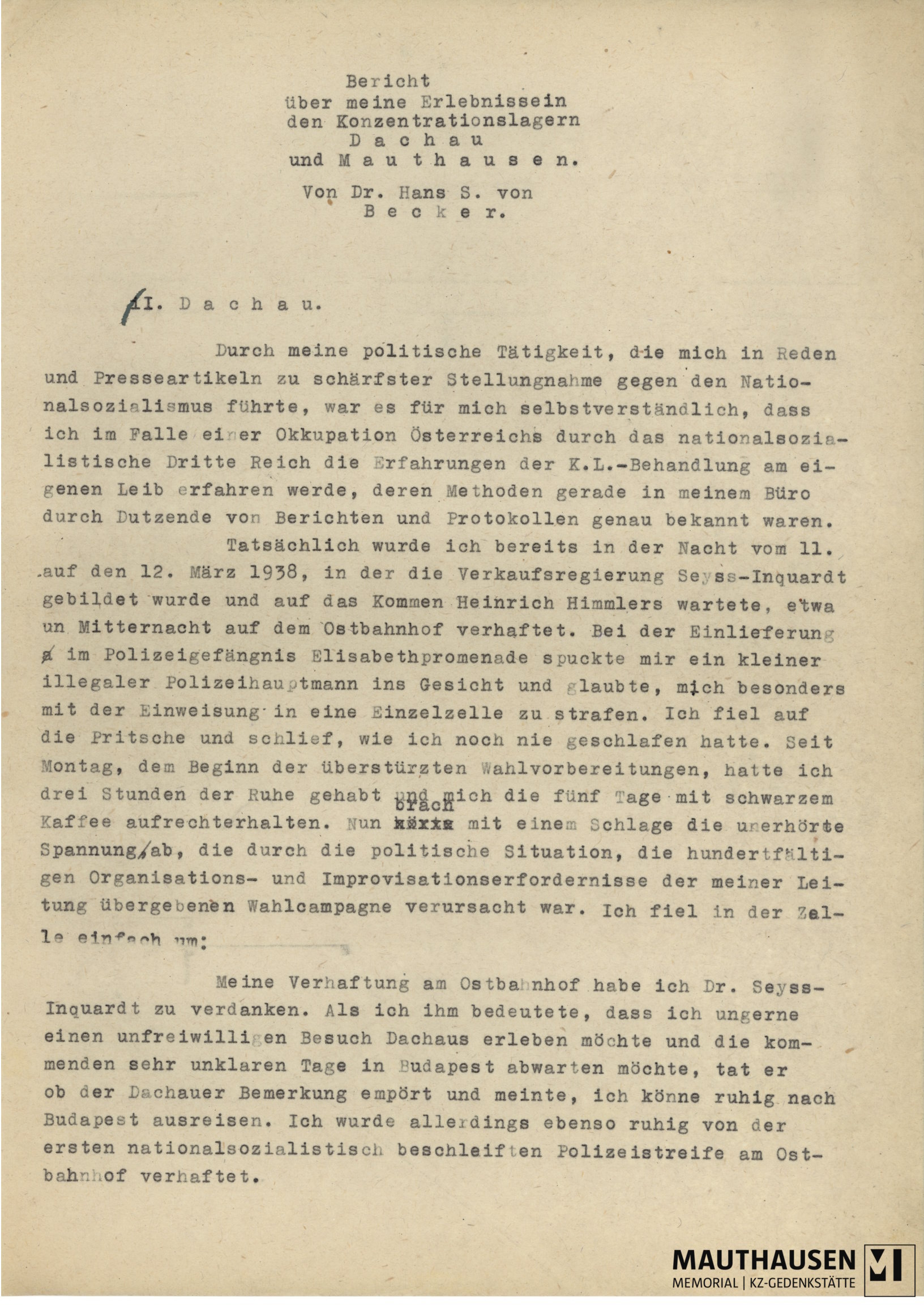 Sammlung Hans von Becker. Erinnerungsbericht aus dem KZ Mauthausen und Dachau.