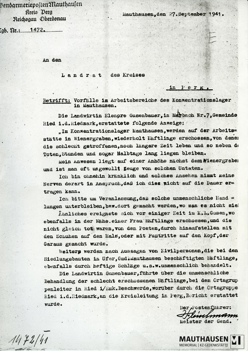 Content descriptionBericht des Gendarmeriepostenführers Fleischmann an den Landrat des Kreises Perg betreffend "Vorfälle im Arbeitsbereiche des Konzentrationslager in Mauthausen". Der Bericht gibt die Beschwerden der Landwirtin Elenore Gusenbauer über Erschießungen und Misshandlungen im Bereich des Steinbruchs Wiener Graben und des KZ Gusen wieder; siehe auch Z/01/85