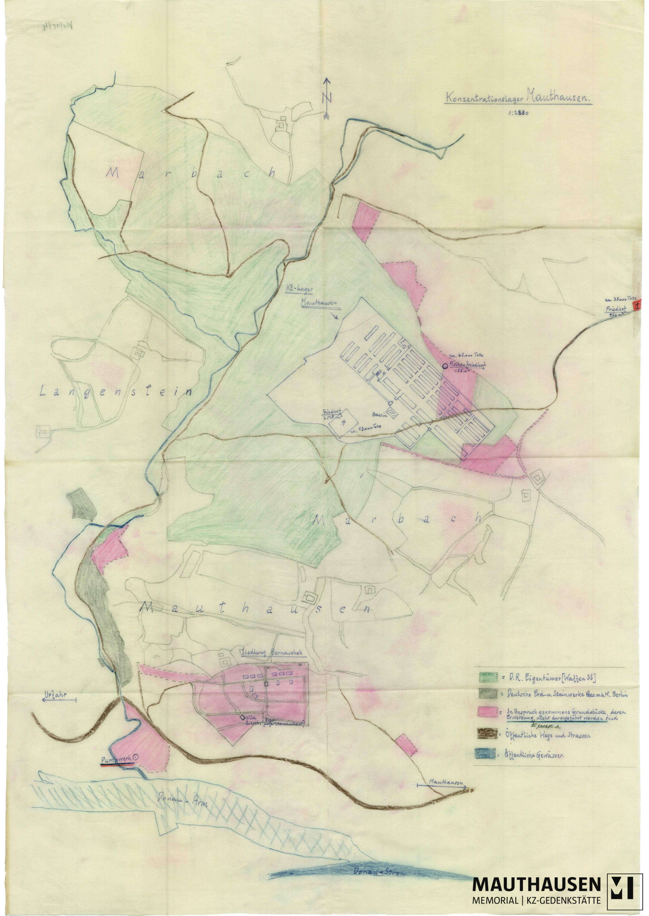 Lageplan KZ Mauthausen; Eigentumsverhältnisse Marbach, Langenstein und Mauthausen, Gedenk- und Mahnstätte Mauthausen