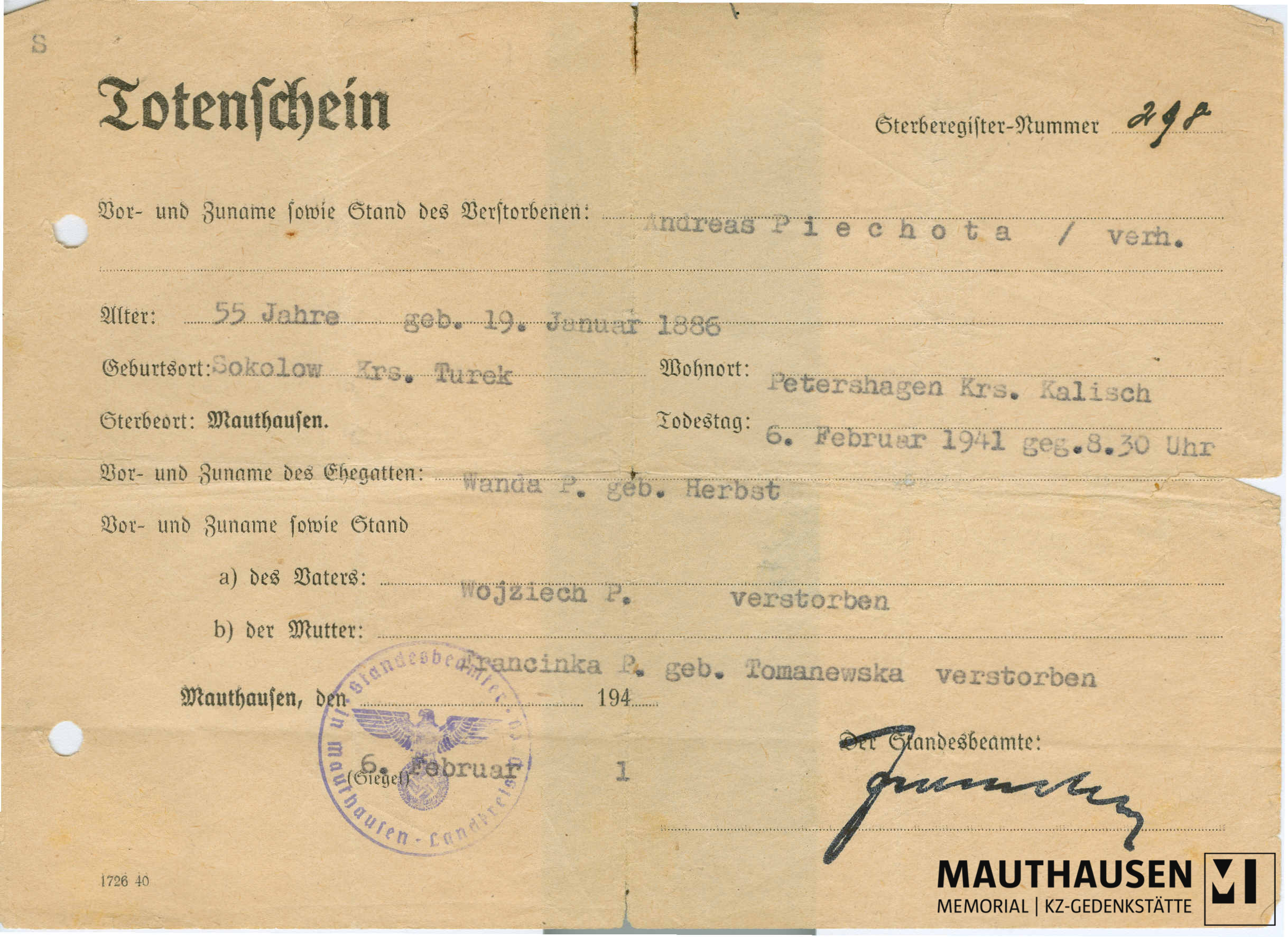 Totenschein, amtsärztlichen Befundung des SS-Standortarztes Mauthausen und eine Postkarte von Andrzej Piechota (HNr. 6265).