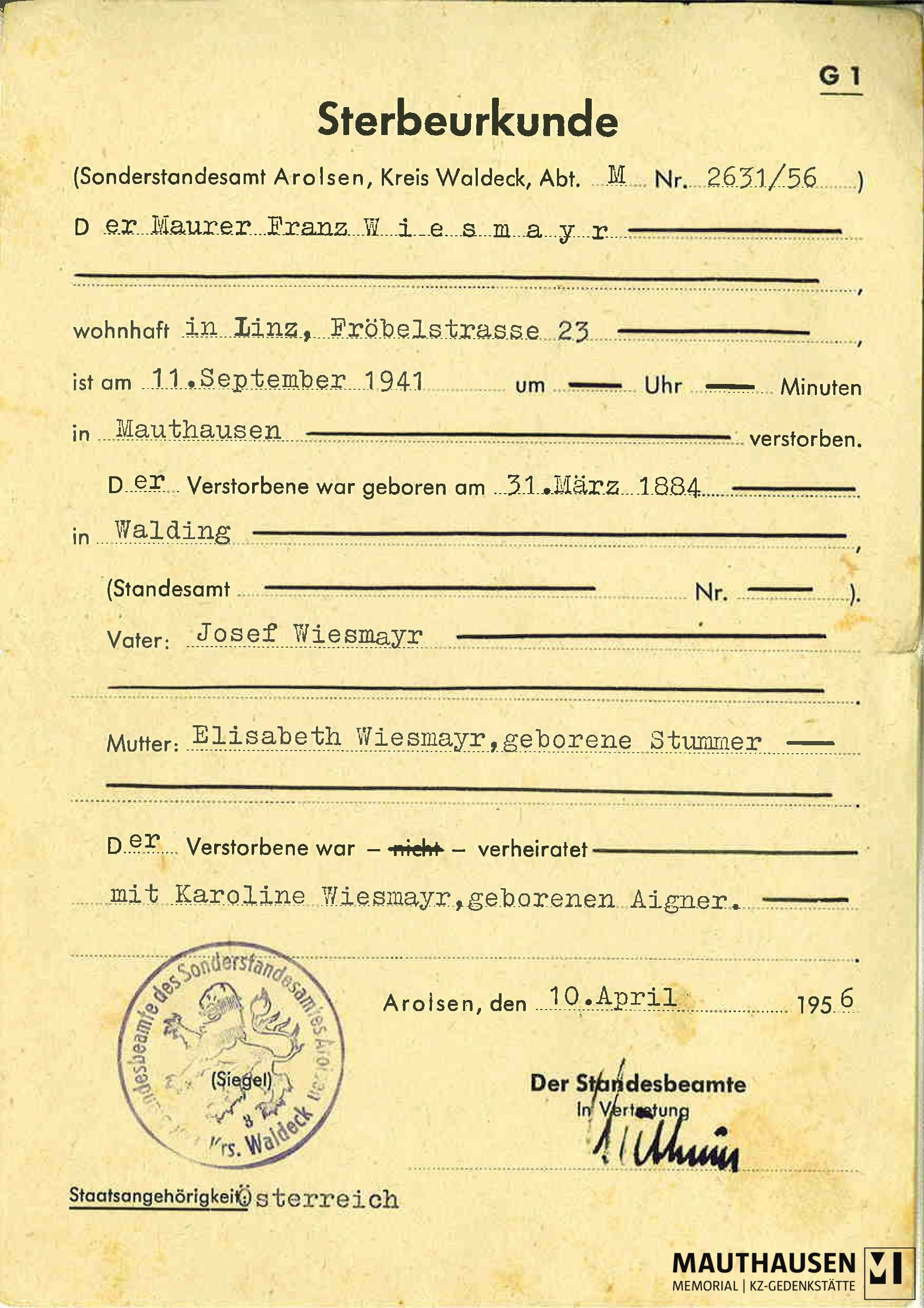 Sterbeurkunde von von Franz Wiesmayr (Hnr. 859), sowie die Abschrift der Benachrichtigung über seinen Tod an seine Frau.