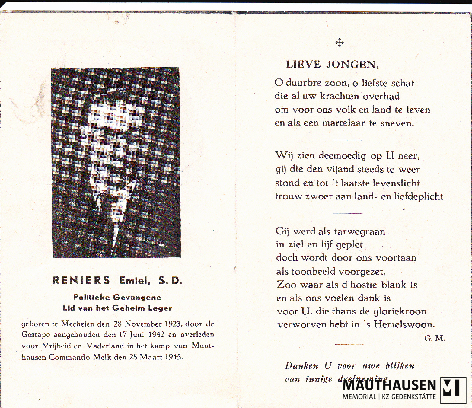 Partezettel über den Tod des ehem. Häftlings Emiel Reniers (Hnr. 99541).