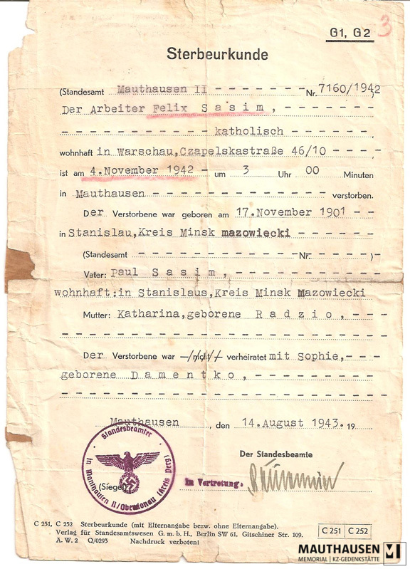 InhaltsbeschreibungSterbeurkunde von Felix Sasim, ausgestellt vom Standesamt Mauthausen; Schreiben über die Einäscherung von der Kommandantur an Sophie Sasim., ehem. Häftlinge und Angehörige