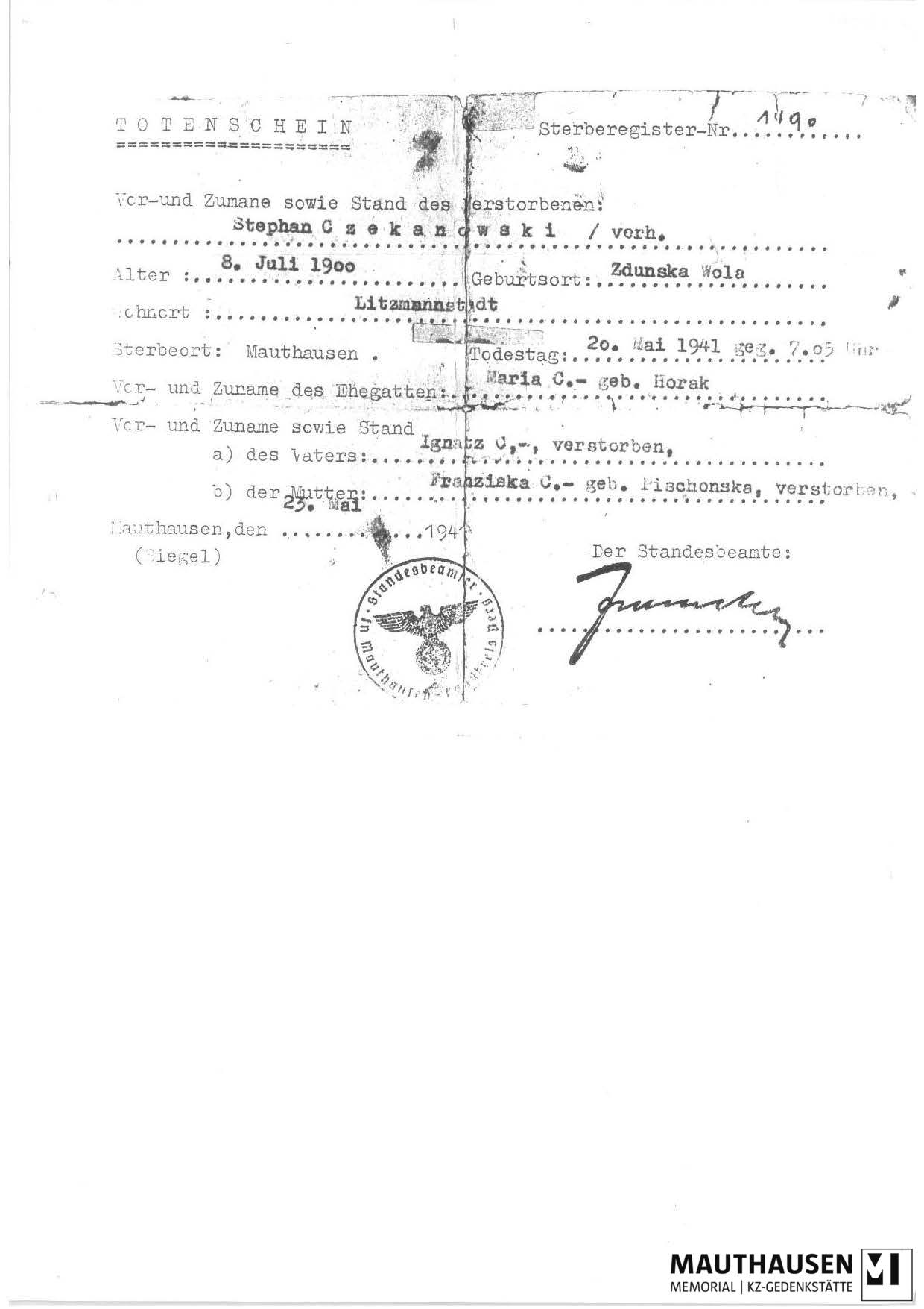 Totenschein und Briefe von Czekanowski Stefan (Gusen 6081).
