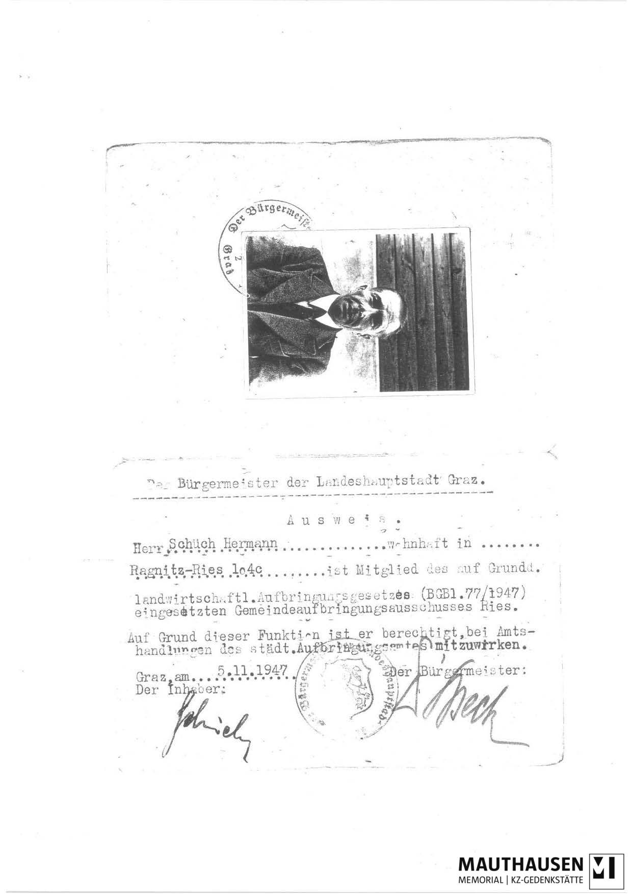 Content descriptionInformationen über Hermann Schüch (108276): 1 Foto vom 7./8. Mai 1949 an der KZ Gedenkstätte Mauthausen, Kundmachung der Hinrichtung von Karl Drews und Karl Weiß, KPÖ-Ausweis von 1947, Ausweis vom KZ-Verband, Zuerkennung zusätzlicher Lebensmittelmarken, Notizzetteln, Lagerbriefe zwischen Hermann und seiner Frau Stefanie Schüch, Schreiben von Stefanie Schüch an die Lagerleitung; Liste mit Häftlingsnummern (Schienenbieger, Hilfscapos), ehem. Häftlinge und Angehörigen