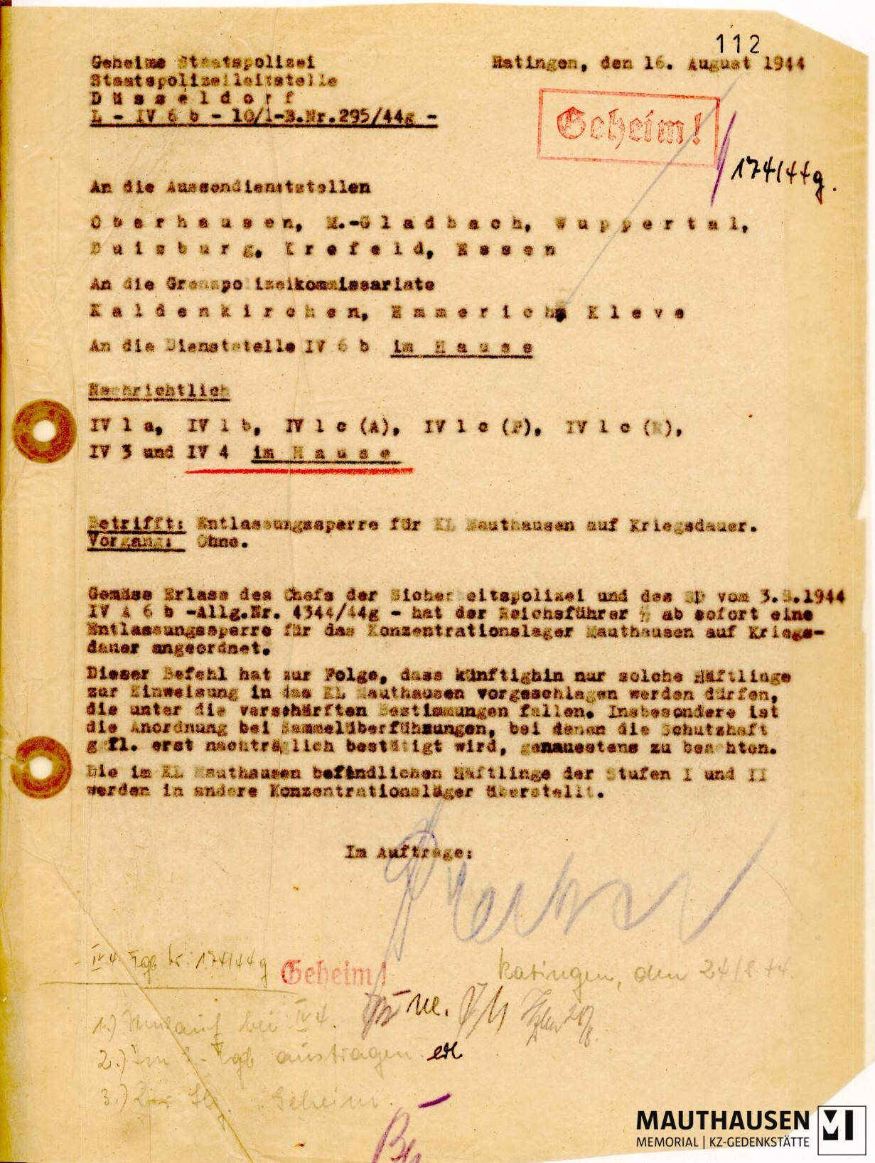 TitleErlass über Entlassungssperre im KZ Mauthausen