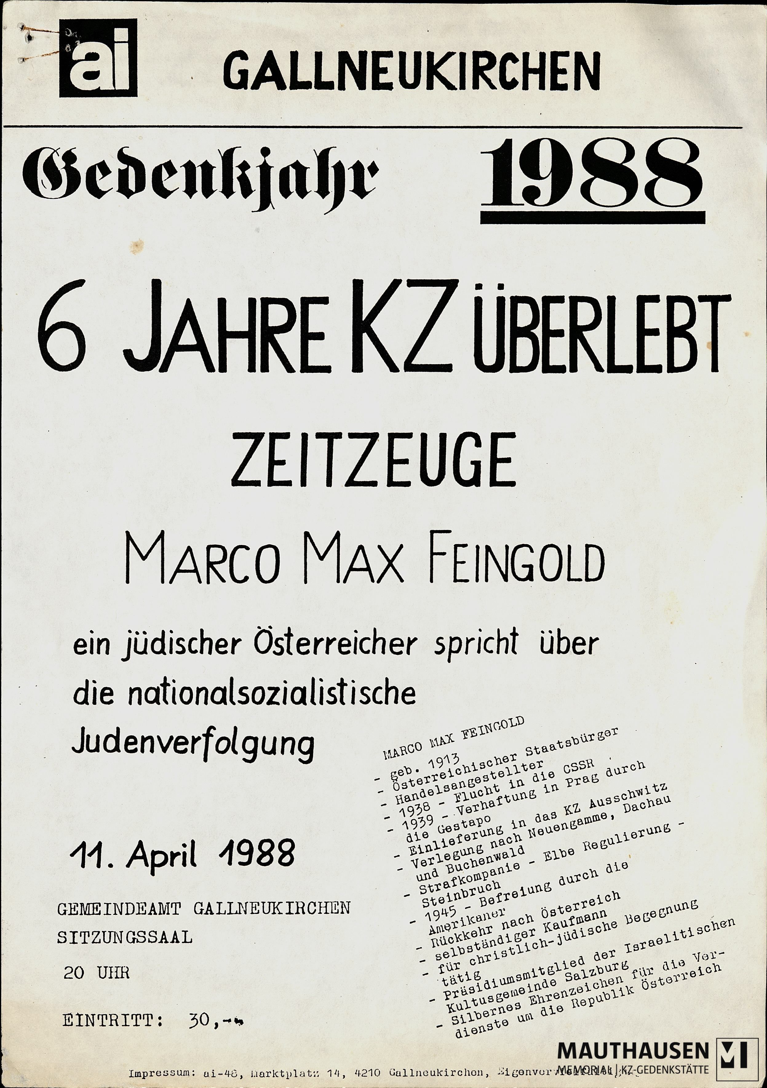 Content descriptionAmnesty International hat eine Veranstaltung im Gedenkjahr 1988 in Gallneukirchen organisiert und hierzu den Zeitzeugen Marco Max Feingold eingladen, am 11. April 1988. Korrespondenz mit und Lebenslauf von Feingold., Befreiungs- und Gedenkfeiern