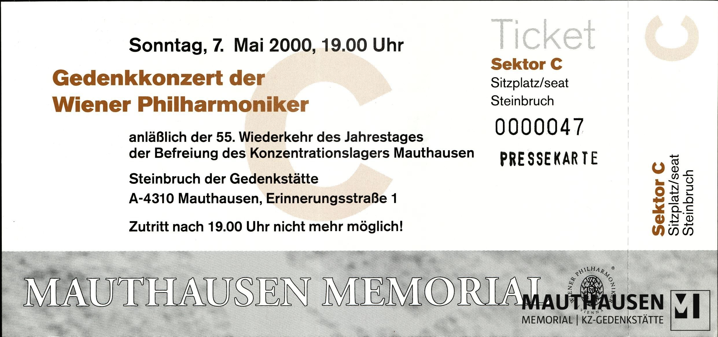Content descriptionKarte für das Konzert der Wiener Philharmoniker im Steinbruch der KZ Gedenkstätte Mauthausen am 7. Mai 2000., Gedenkveranstaltung