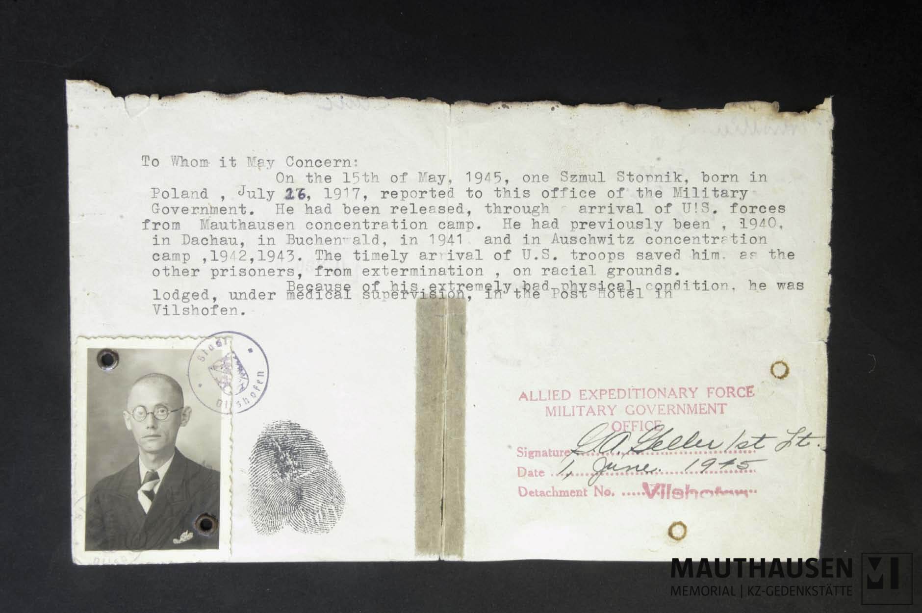 Content descriptionSchreiben der Alliierten Behörde über Haft und Befreiung von Szmul Stonnik (Samuel Stopnik 124383) vom 11. Juni 1945; Bericht über Aufnahme von Szmul Stopnik im Deutschen Militärlazarett Deggendorf vom 9. Juni 1945; Haftbestätigung der KZ-Betreuungsstelle Vilshofen; Lagerpost Mauthausen von Roman Wojcik (21725)