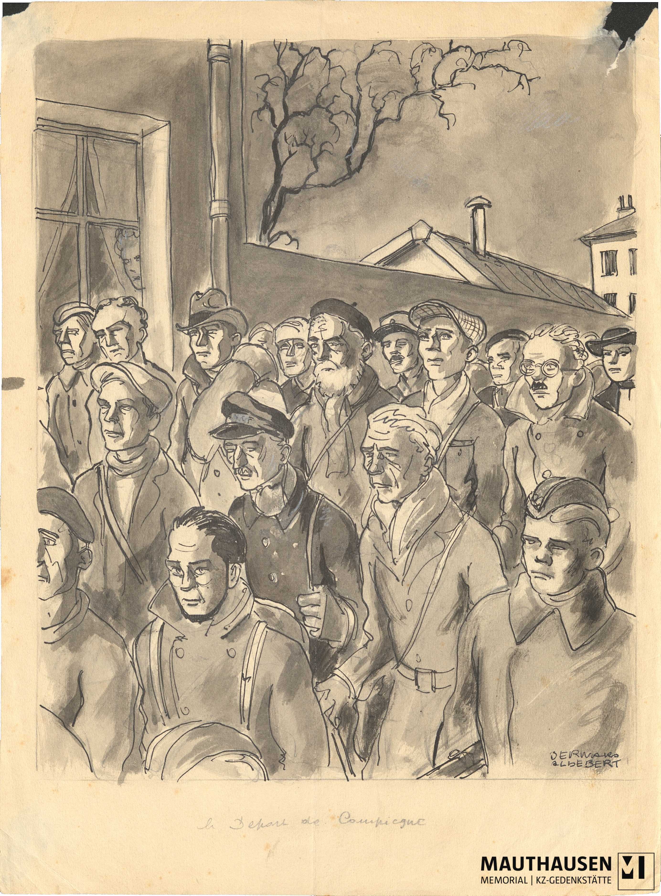 "Le Depart de Compiegne", Zeichnung des französischen Künstlers Bernard Aldebert, die das Leben der Häftlinge im KLM und in Gusen zeigen
