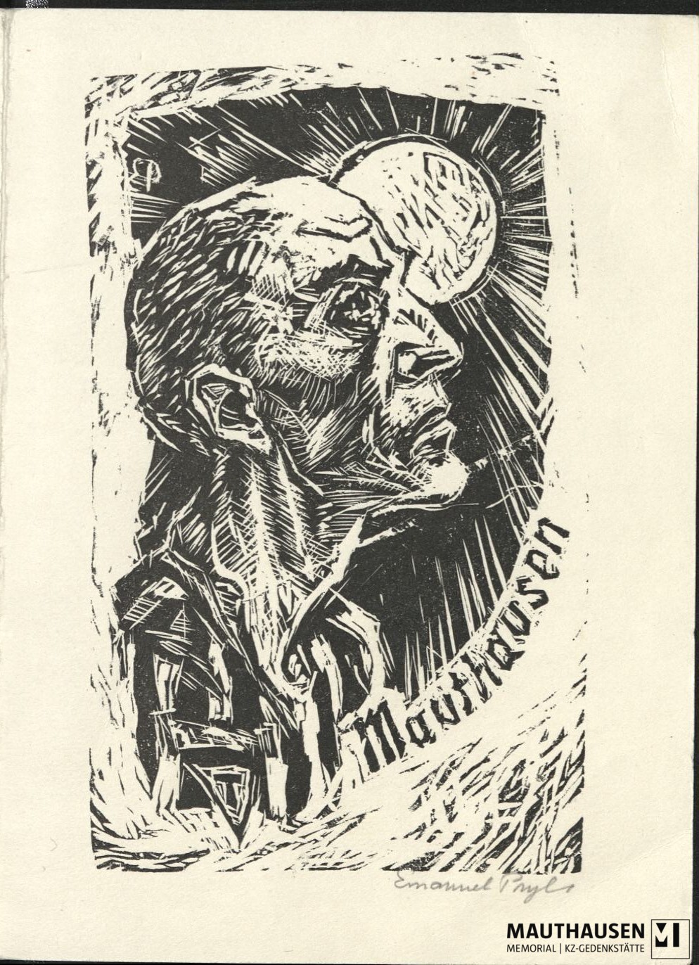 Content descriptionZeichnung (Linolschnitt) von Emanuel Pryl, bedruckt auf einer Einladung zu einem Treffen der Präsidentschaftskanzlei mit Vertretern des Internationalen Mauthausen Komitees