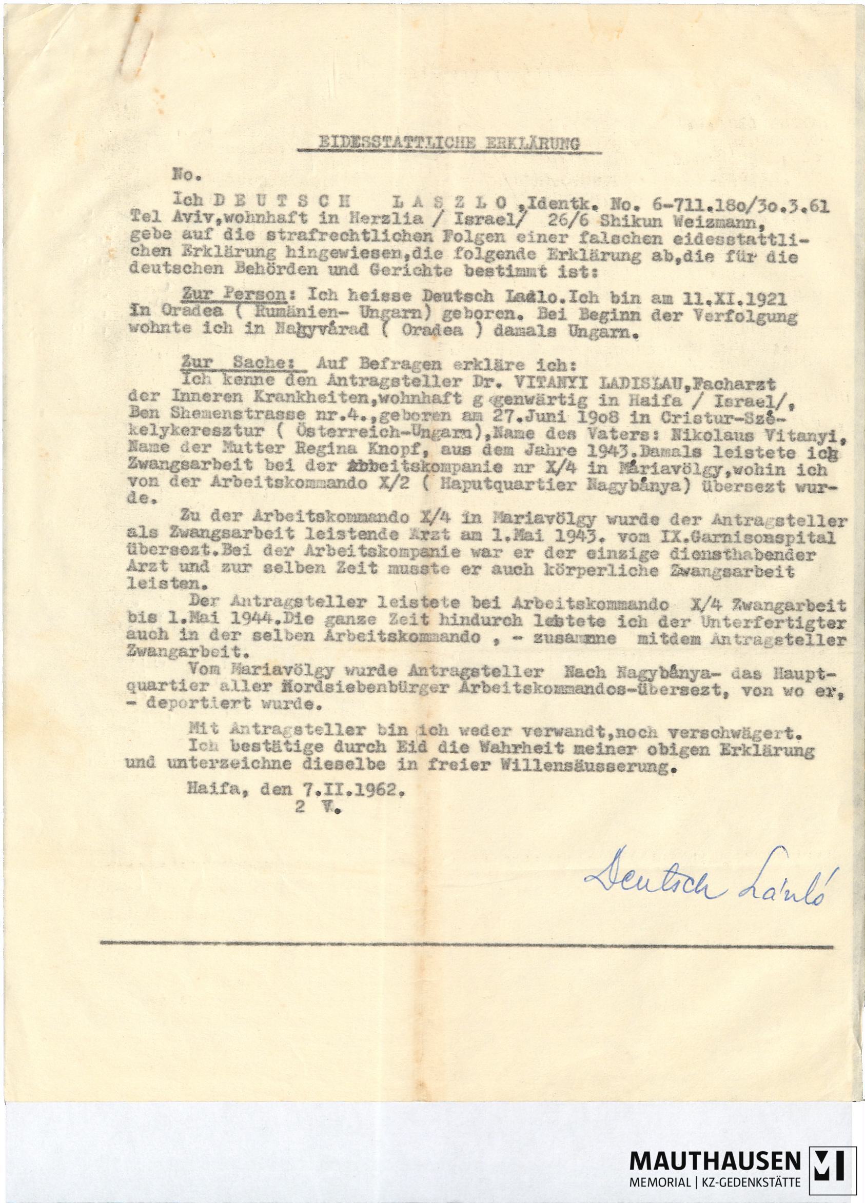 Content descriptionEidesstattliche Erklärung von Laszlo Deutsch zu Dr. Vitanyi Lasislau Zeit im Arbeitskommando X/4 im Mai 1944.