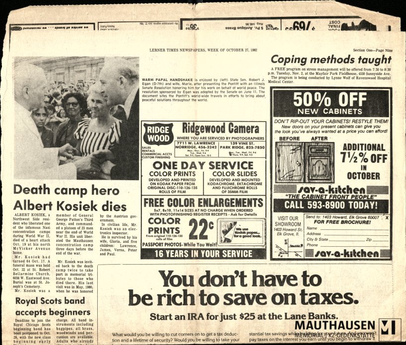 Content descriptionZeitungsbericht über das Ableben von Albert J. Kosiek am 17. Oktober 1982. Lerner Times Newspapers vom 27. Oktober 1982.