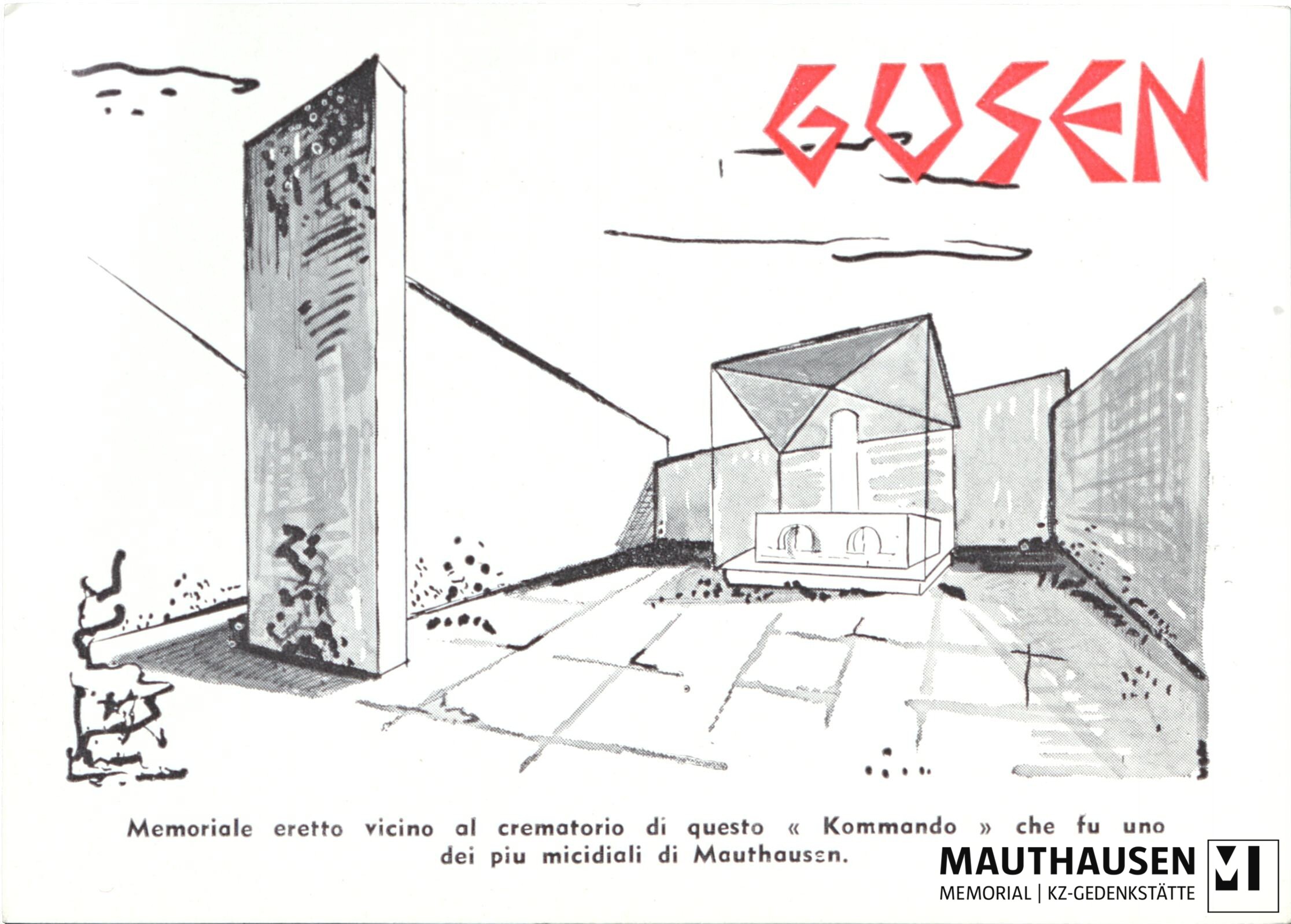 Content descriptionAnsichtskarte: Entwurfszeichnung für das Memorial de Gusen, "Gusen, campo di sterminio … partecipate: 100 Lire" - Spendenaufruf für das Memorial