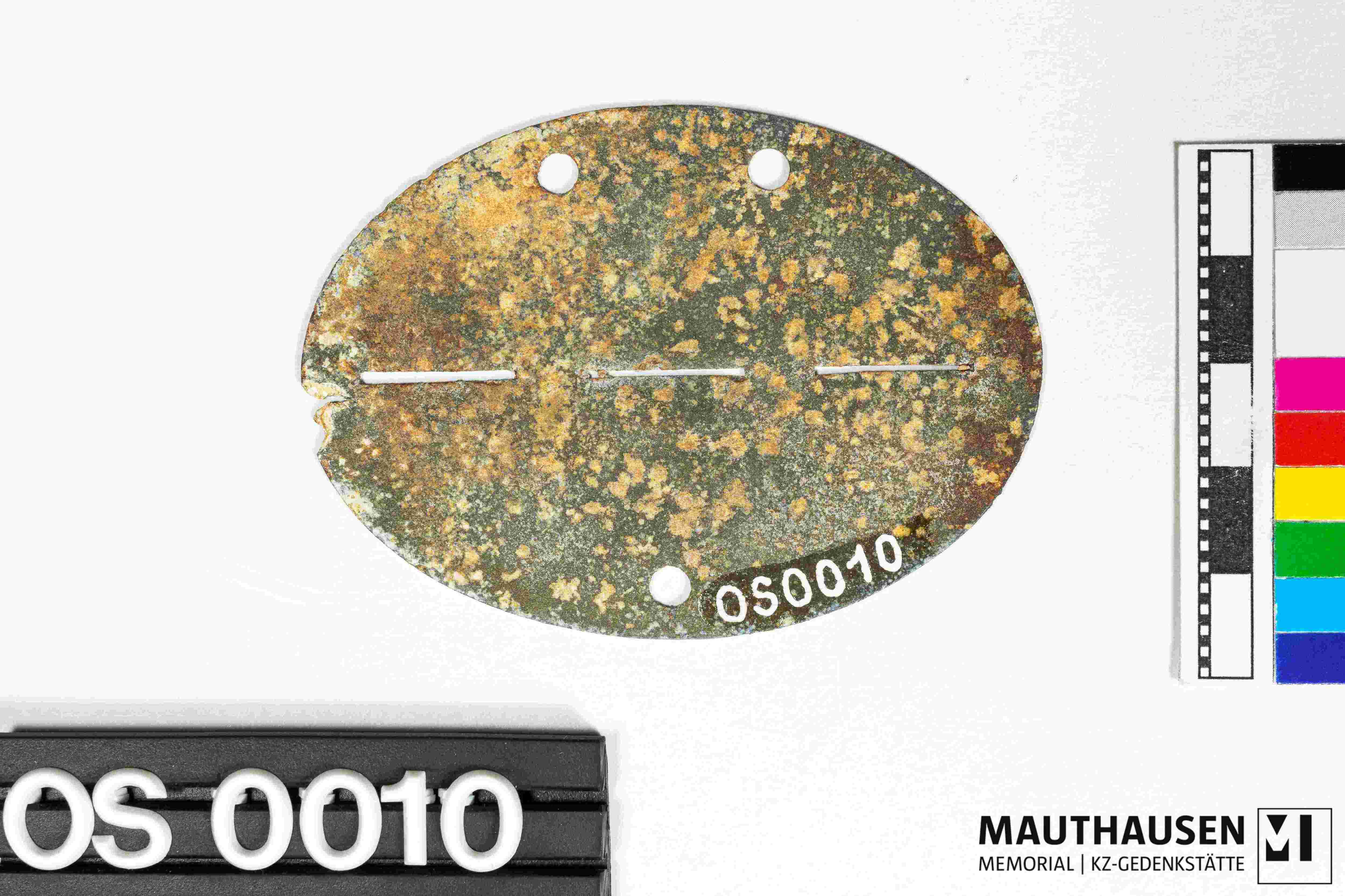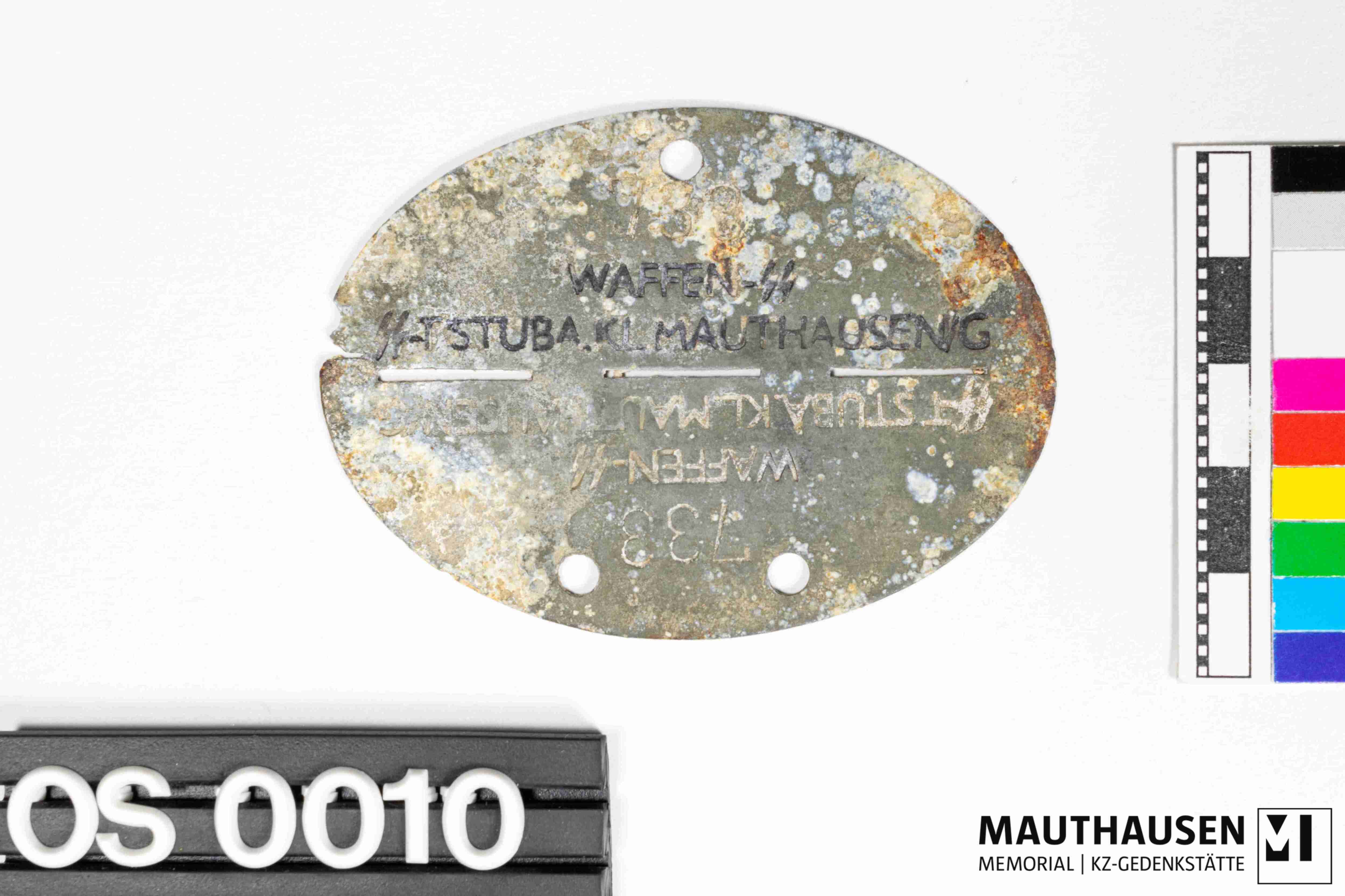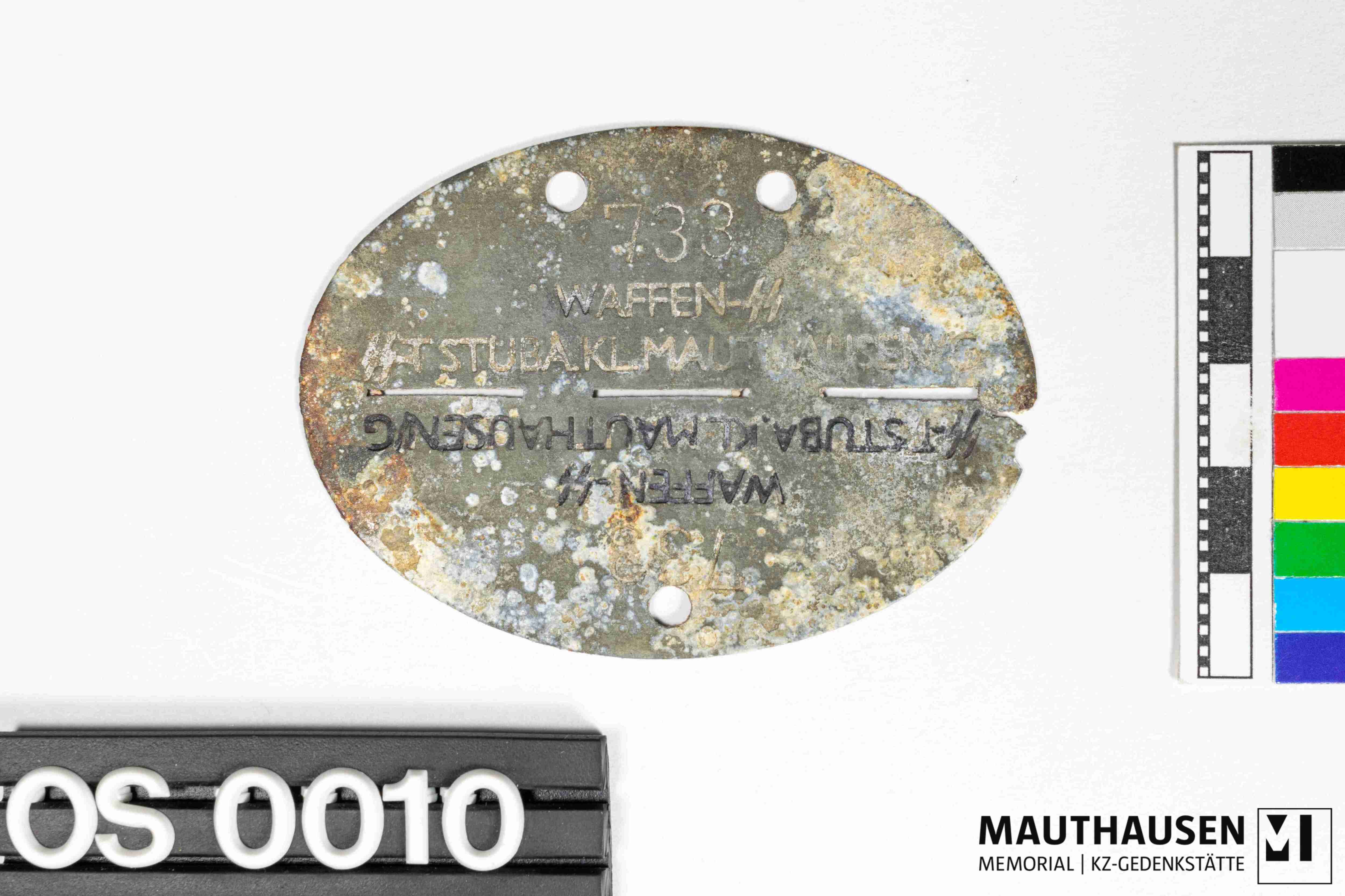 Erkennungsmarke eines SS-Mannes; Elliptische Form mit der Prägung 733, darunter "WAFFEN-SS", darunter "SS-T STUBA. KL MAUTHAUSEN/G"; Metall beidseitig bereits stark angegriffen.