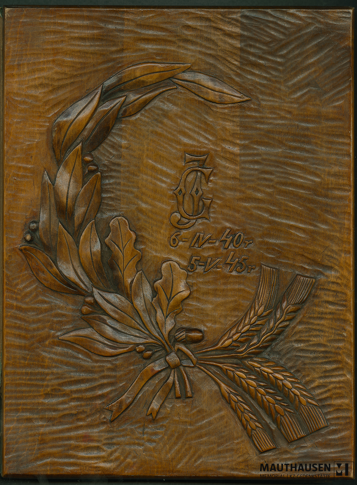 DescriptionAlbumeinband aus Holz. Auf der Vorderseite (Albumeinband) sind die Initialen des Albumautors („J“ und „G“) sowie die Dauer seiner Inhaftierung geschnitzt: „6-IV-40r“ und „5-V-45r“ (6. April 1940 bis 5. Mai 1945). Diese Angaben sind von einem halboffenen Kranz umrahmt, bestehend aus Eich- und Lorbeerblättern, Eicheln und Ähren. Der Einband hat sich im Laufe der Jahre nach außen gewölbt.