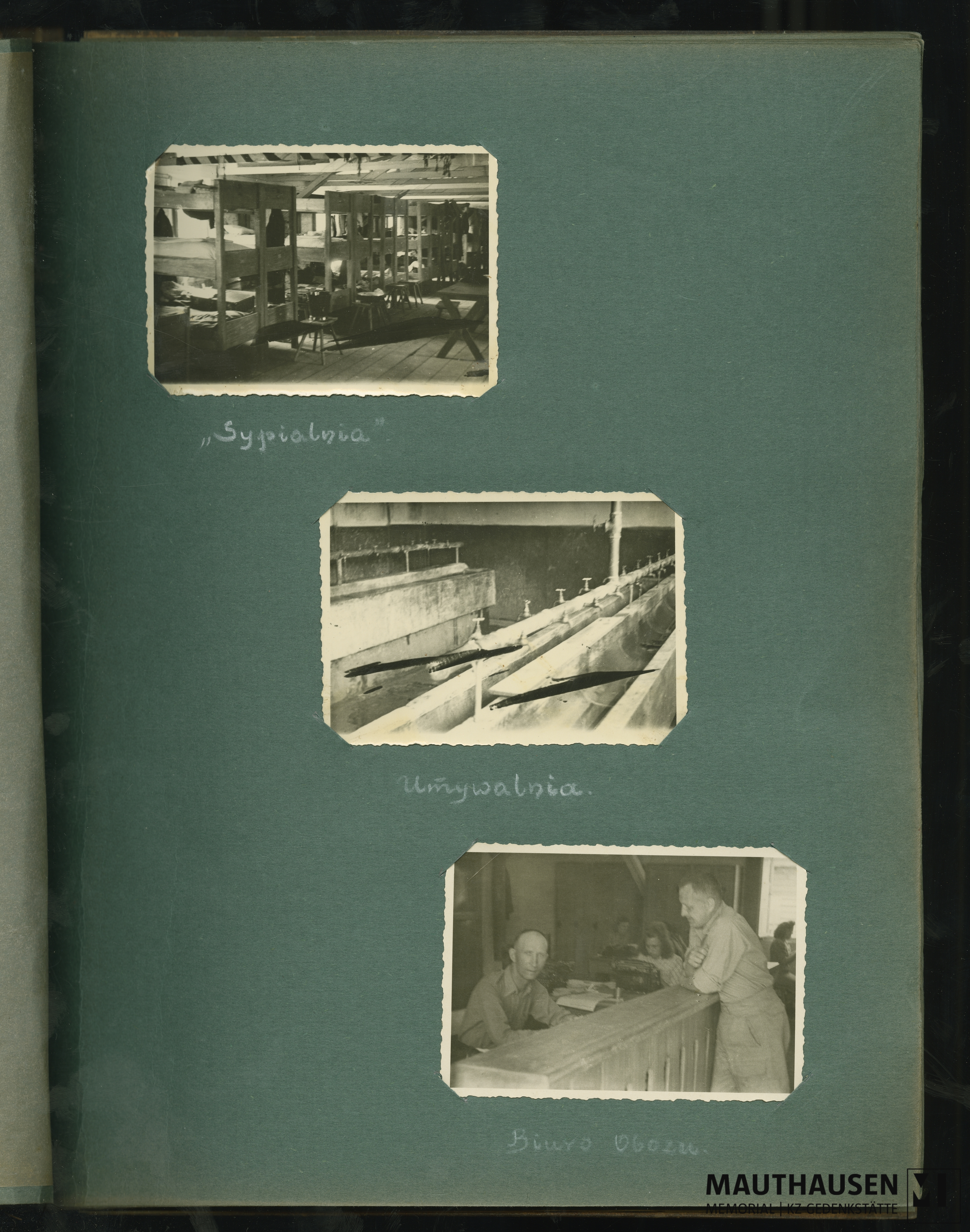 DescriptionAlbumblatt mit drei Fotografien: Die Seite fünf im Album gibt Einblicke in verschiedene Räume des Alltags im KZ: Foto eins (links oben): Innenaufnahme einer Häftlingsbaracke mit Stockbetten. Bildunterschrift: Ein „Schlafraum“ („‚Sypialnia‘“). Innenaufnahme eines Waschraums. Die Bildunterschrift: Ein Waschraum („Umywalnia“). Innenaufnahme des Lagerbüros, nach der Befreiung. Ein Mann sitzt hinter einem Tresen und blickt in die Kamera, vor dem Tresen ihm zugewandt lehnt eine weitere männliche Person. Im Hintergrund arbeiten Frauen an Schreibtischen. Die Bildunterschrift: Das Lagerbüro („Biuro Obozu“).