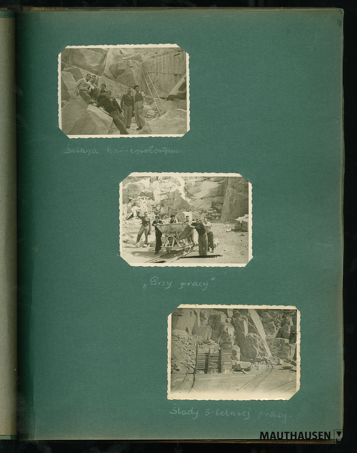 DescriptionAlbumblatt mit drei Fotografien: Foto eins (links oben): Sechs Männer, Überlebende des KZ, haben sich um große Granitbruchsteine gruppiert und posieren für die Kamera. Bis auf eine Person im Vordergrund blicken alle anderen in die Kamera. Im Bildhintergrund ist eine Leiter zu sehen, die an eine Steinwand gelehnt ist. Das Foto hat die Bildunterschrift: Eine Steinbruchwand („Ściana kamieniołomu“). Foto zwei (mittig): Dieselbe Gruppe stellt eine Arbeitsszene nach. Fünf Männer schieben eine Lore über eine Feldbahn, während ein weiterer Mann lächelnd rechts im Hintergrund steht. Er hält einen Stock in der rechten Hand und blickt auf die Arbeitenden. Bildunterschrift: „Bei der Arbeit“ („‚Przy pracy‘“). Das dritte Foto auf dem Albumblatt (links unten) bildet einen menschenleeren Steinbruch ab. Feldbahnen, Arbeitswerkzeug (eine Schaufel) sowie eine Bretterwand (vermutlich eine Schutzwand für Sprengungen) verweisen auf den Arbeitsplatz. Bildunterschrift: Spuren (von) fünf Jahre langer Arbeit („Ślady 5-letnicj pracy.“)