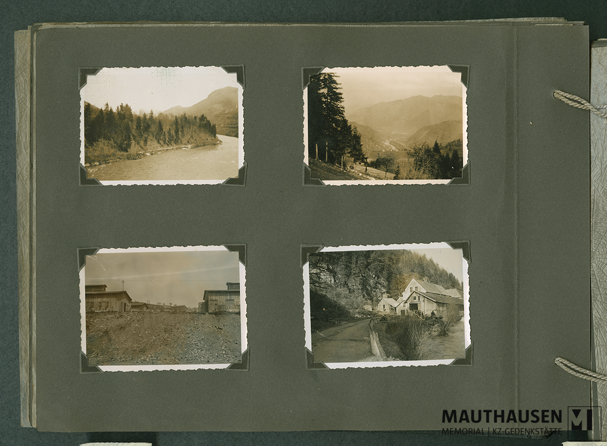 DescriptionAlbumblatt mit vier Fotografien: 1. Blick auf die Enns. 2. Blick auf das Ennstal 3. Blick von unten auf Baracken. 4. Landstraße an Fluss, im Hintergrund Häuser/Hof.