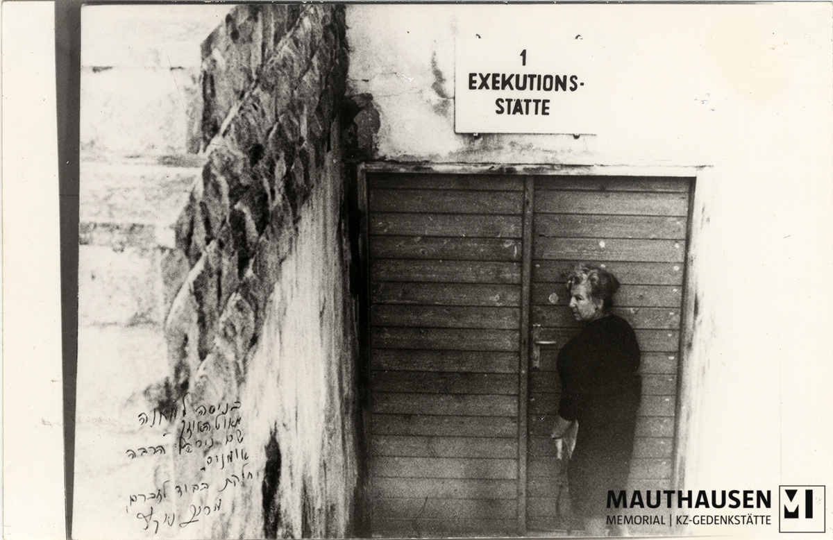 KZ Gedenkstätte Mauthausen: Miriam Novitch steht vor der verschlossenen Tür zur ehemaligen Hinrichtungsstätte.