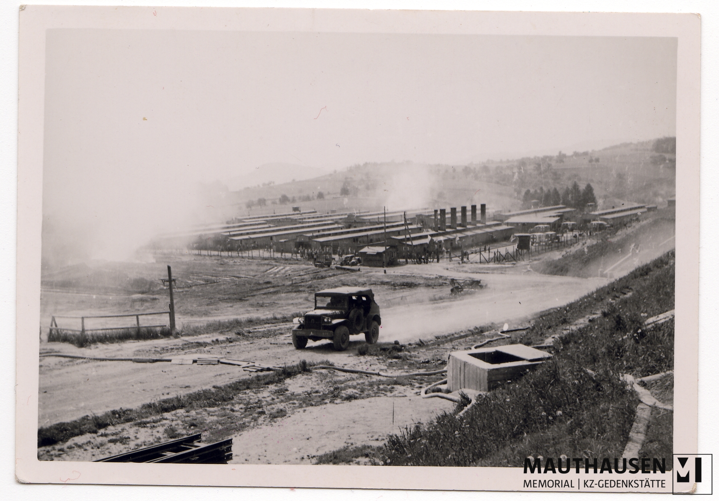 DescriptionBlick auf das „Russenlager“ bzw. „Sanitätslager“. Im hinteren Bereich des „Sanitätslagers“ sind Krankenwägen zu erkennen, mit denen die besonders kranken und geschwächten Überlebenden in saubere Baracken verlegt wurden. Im Vordergrund fährt ein Jeep der US Army über die Straße. Am Boden sind Schläuche zu erkennen, mit denen vermutlich Wasser von der Donau herangepumpt wurde.