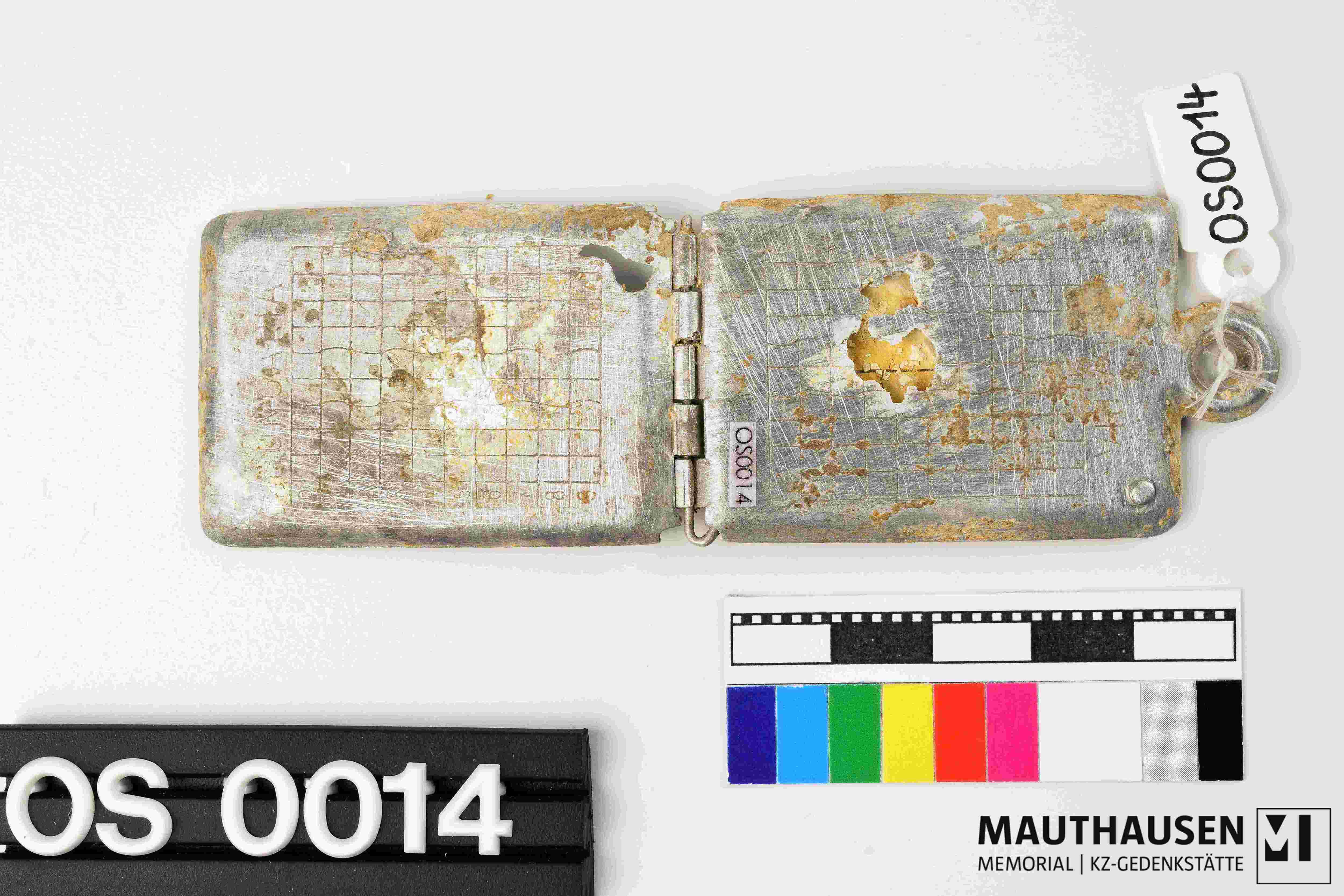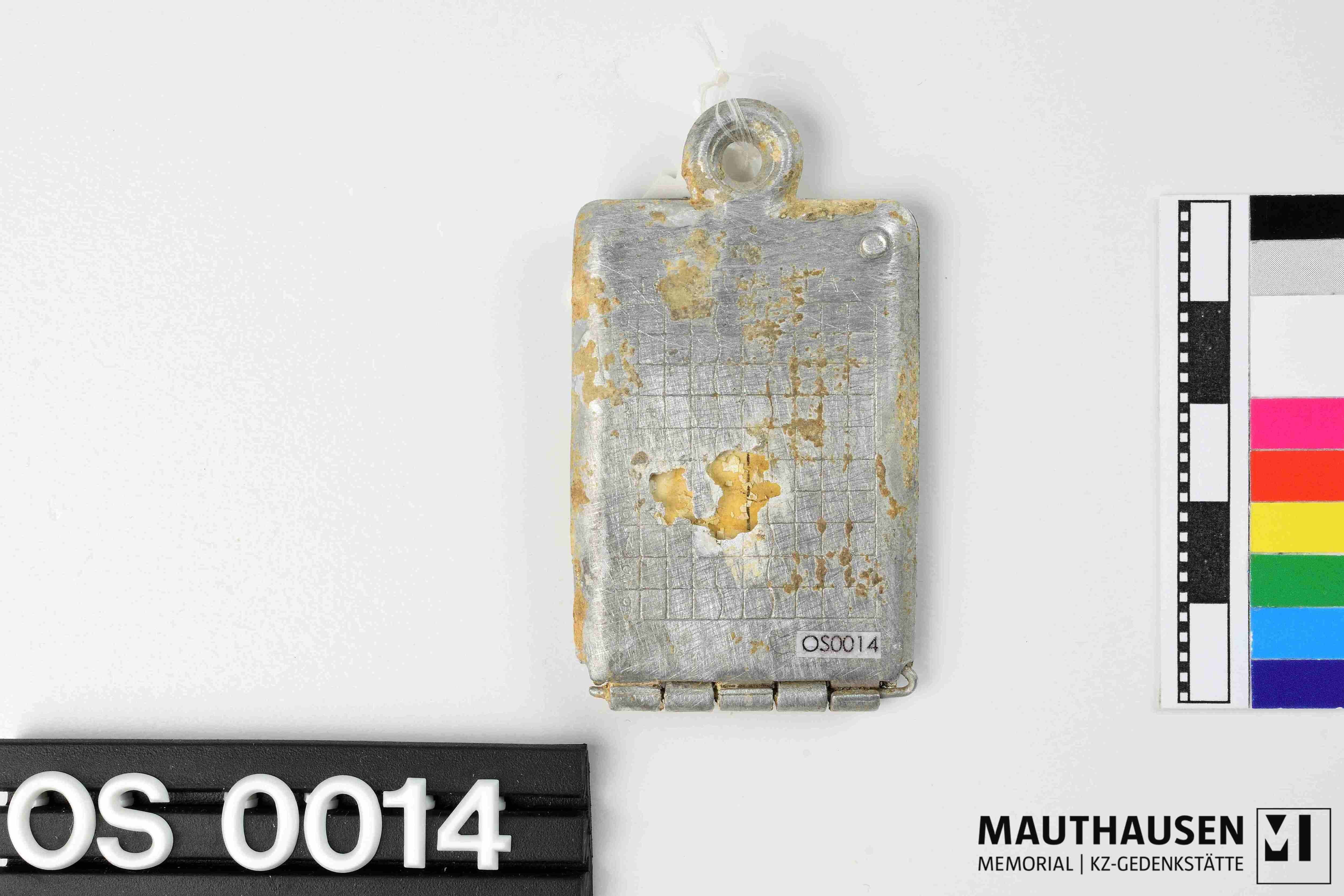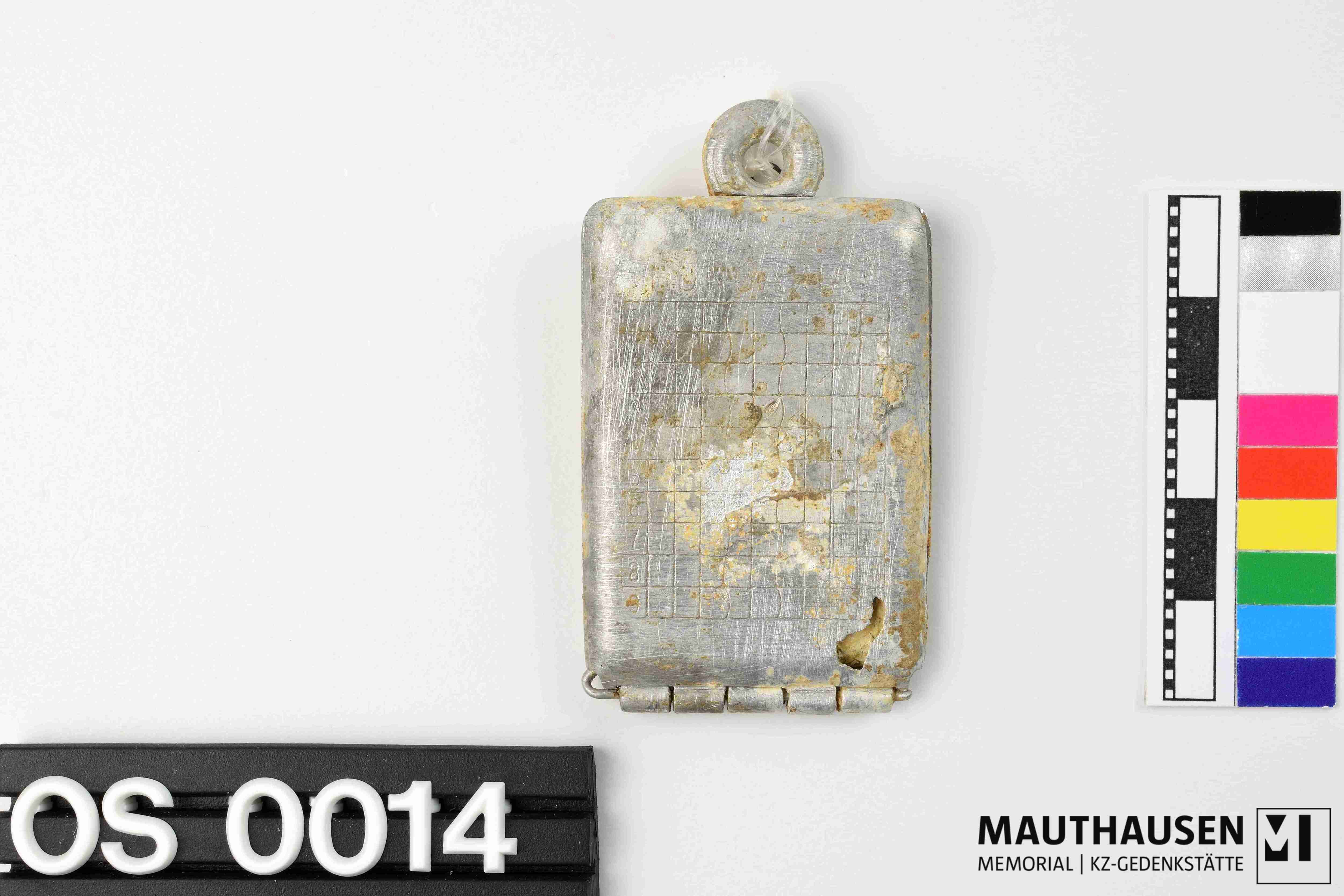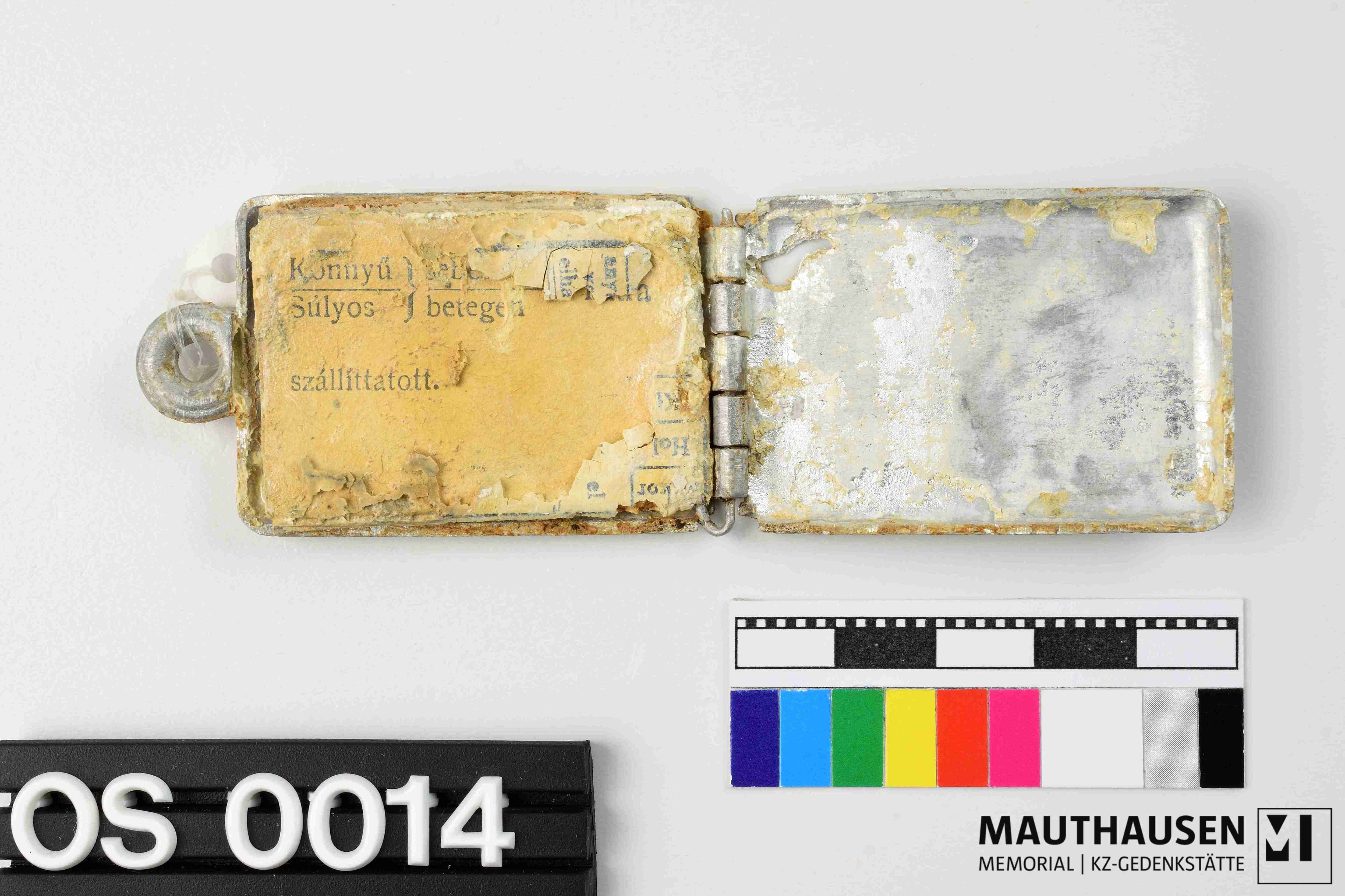 medaillonartig = rechteckig, mit Anhängevorrichtung, Verschluss fehlt. Beidseitig außen graviert: HUNGARIA, darunter ein Raster mit 10x10 Kästchen. in der ersten Spalte stehen untereinander die Ziffern 0 bis 9. Kapsel kann geöffnet werden: darin befindet