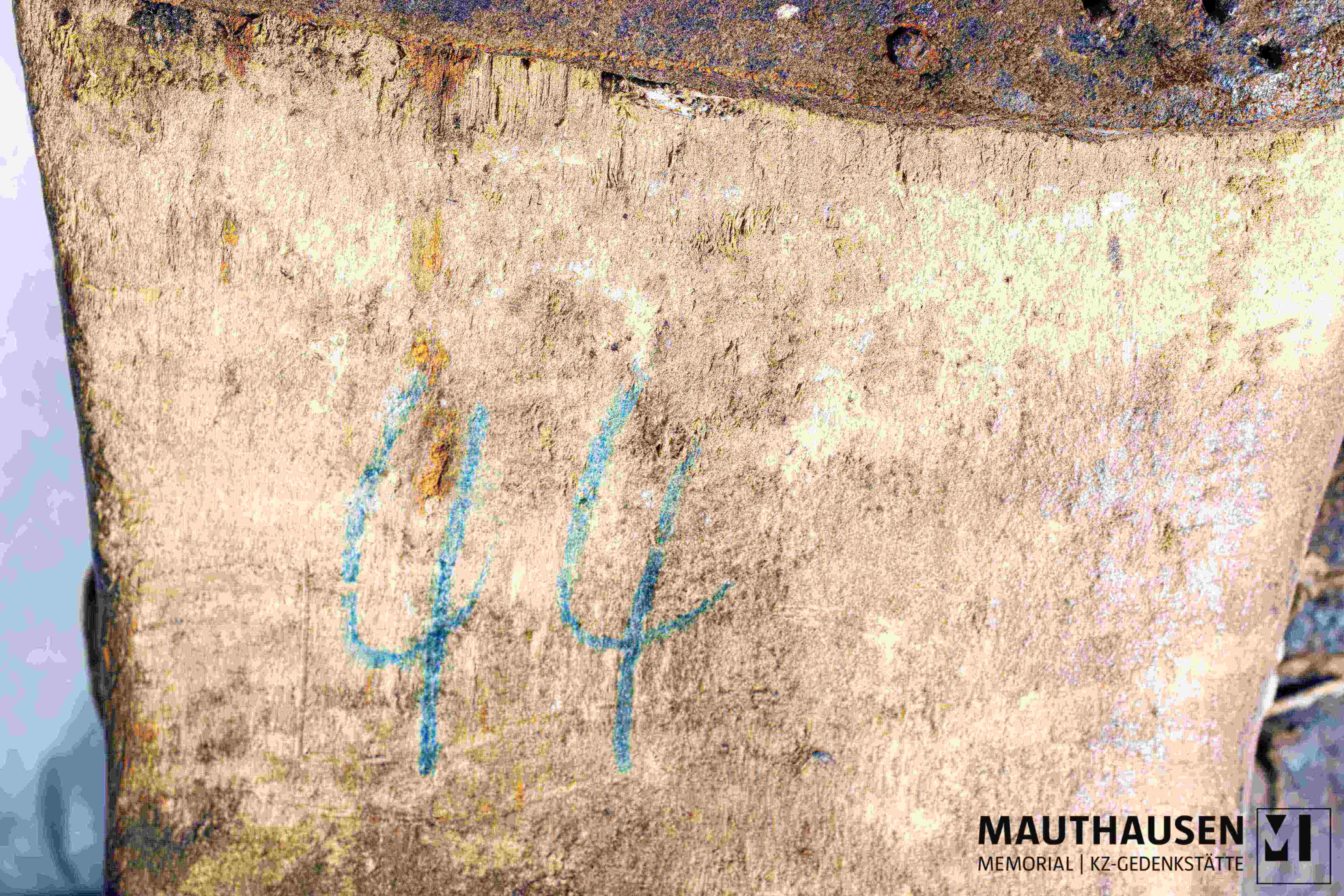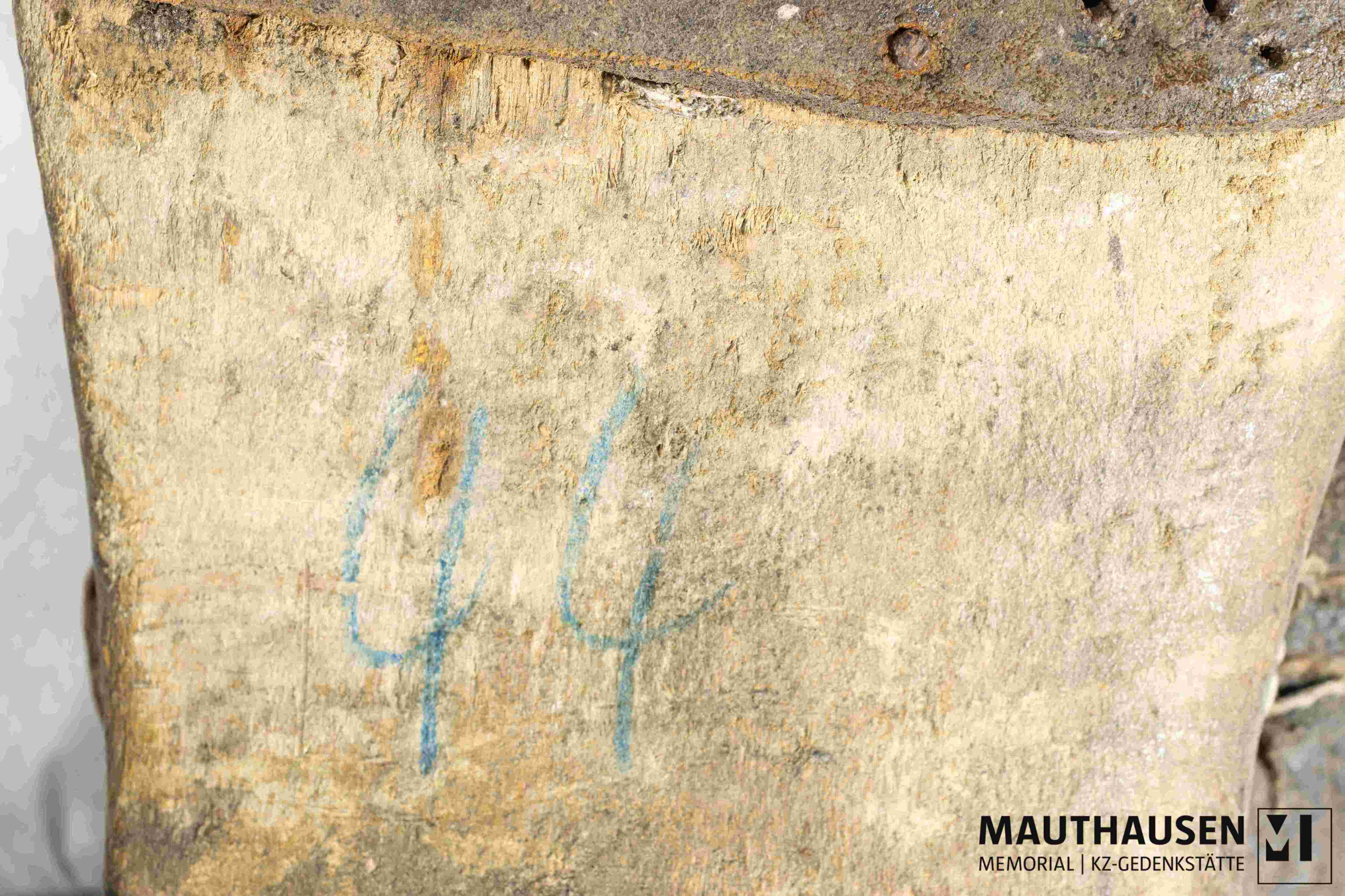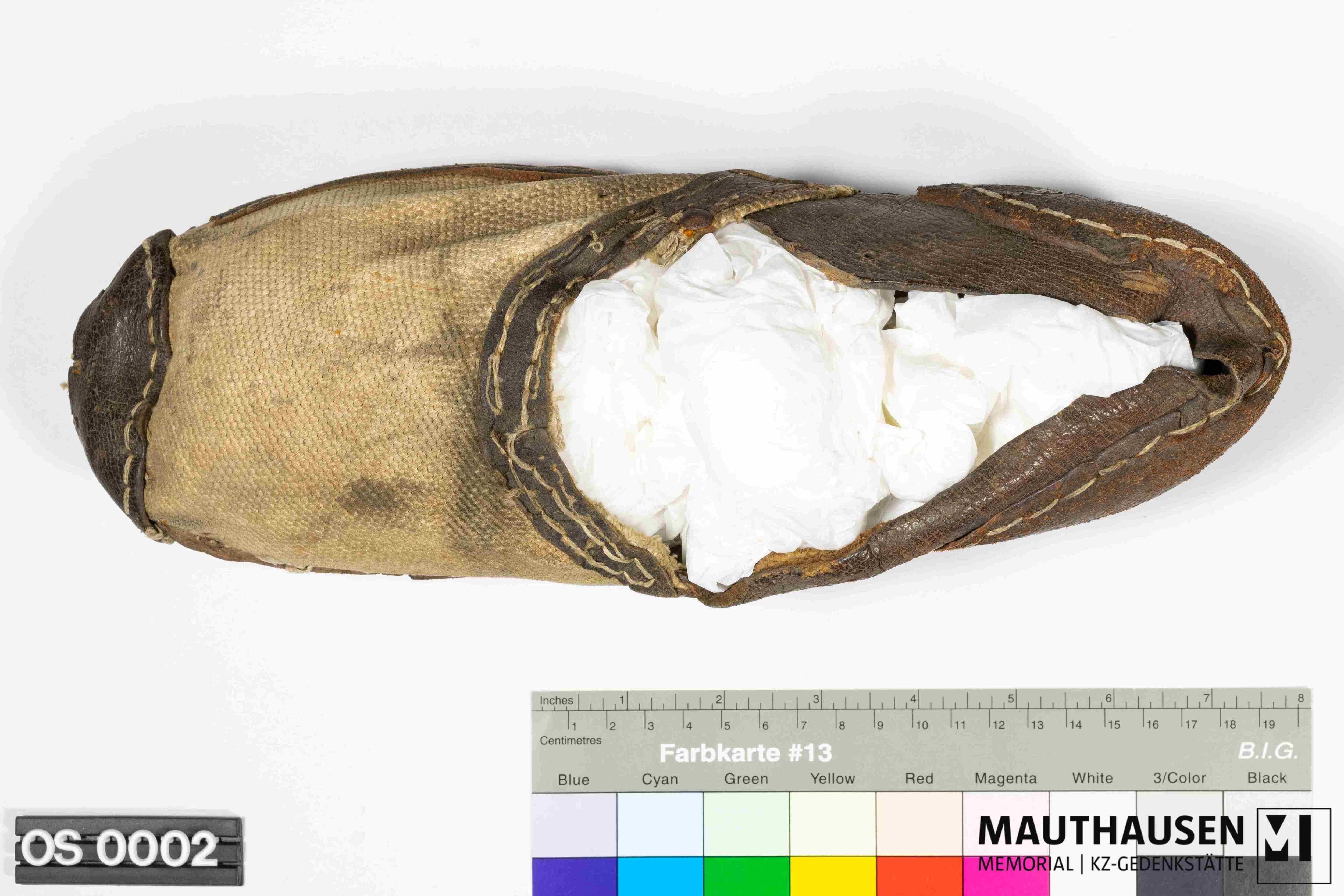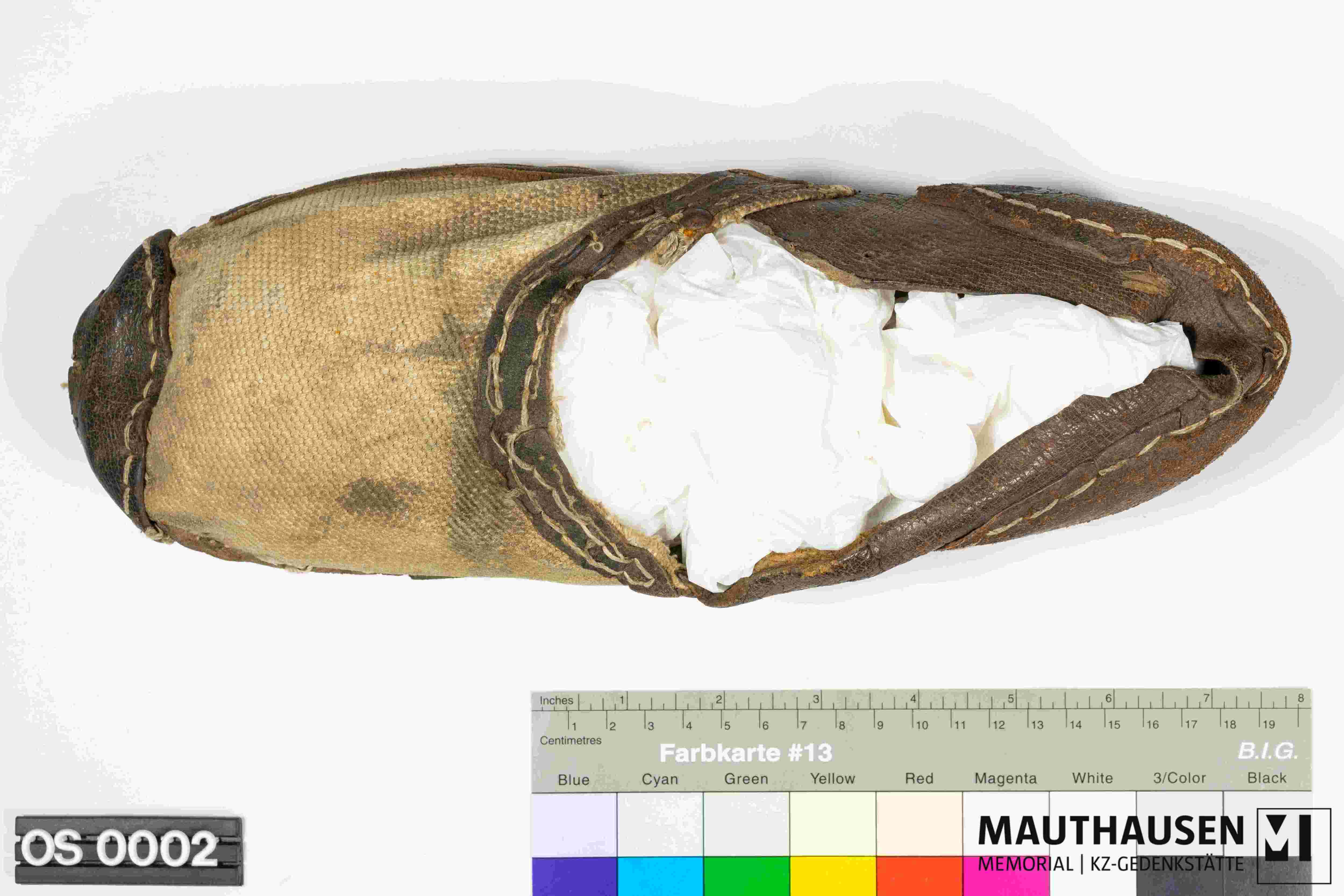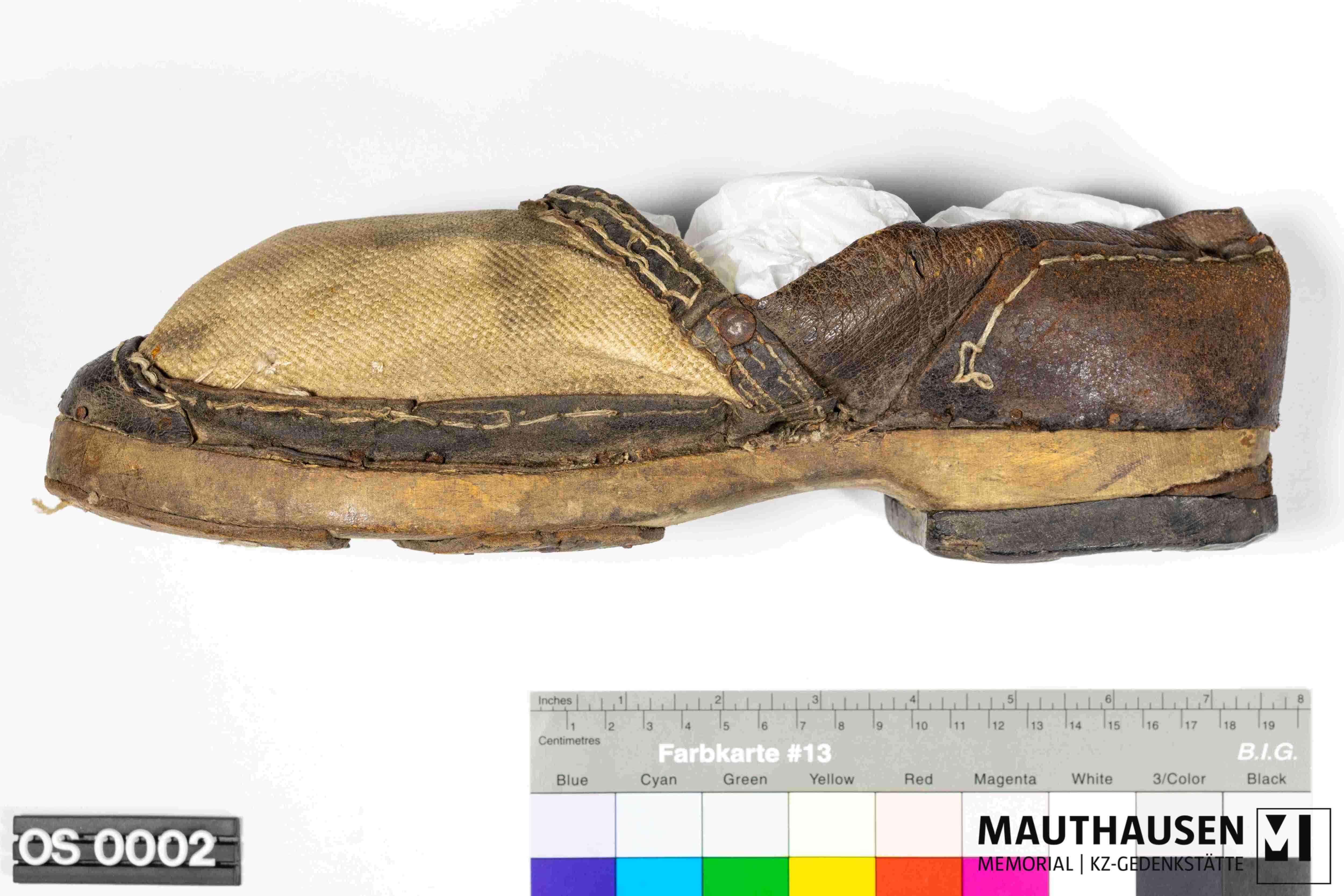 Schuh aus Textil und Leder mit Holzsoleh: Holz (Sohle); Pflanzliche Faser (Vorderblatt, Nähte); Leder (Vorder- und Hinterkappe, Sohlenbeschlag, Randverstärkung); Metall (Nägel); Reparaturen an Sohle und Schaft; am Gelenk der Sohle steht mit Buntstift die Zahl "44" geschrieben; Gebrauchsspuren; in Verformung versteift.
