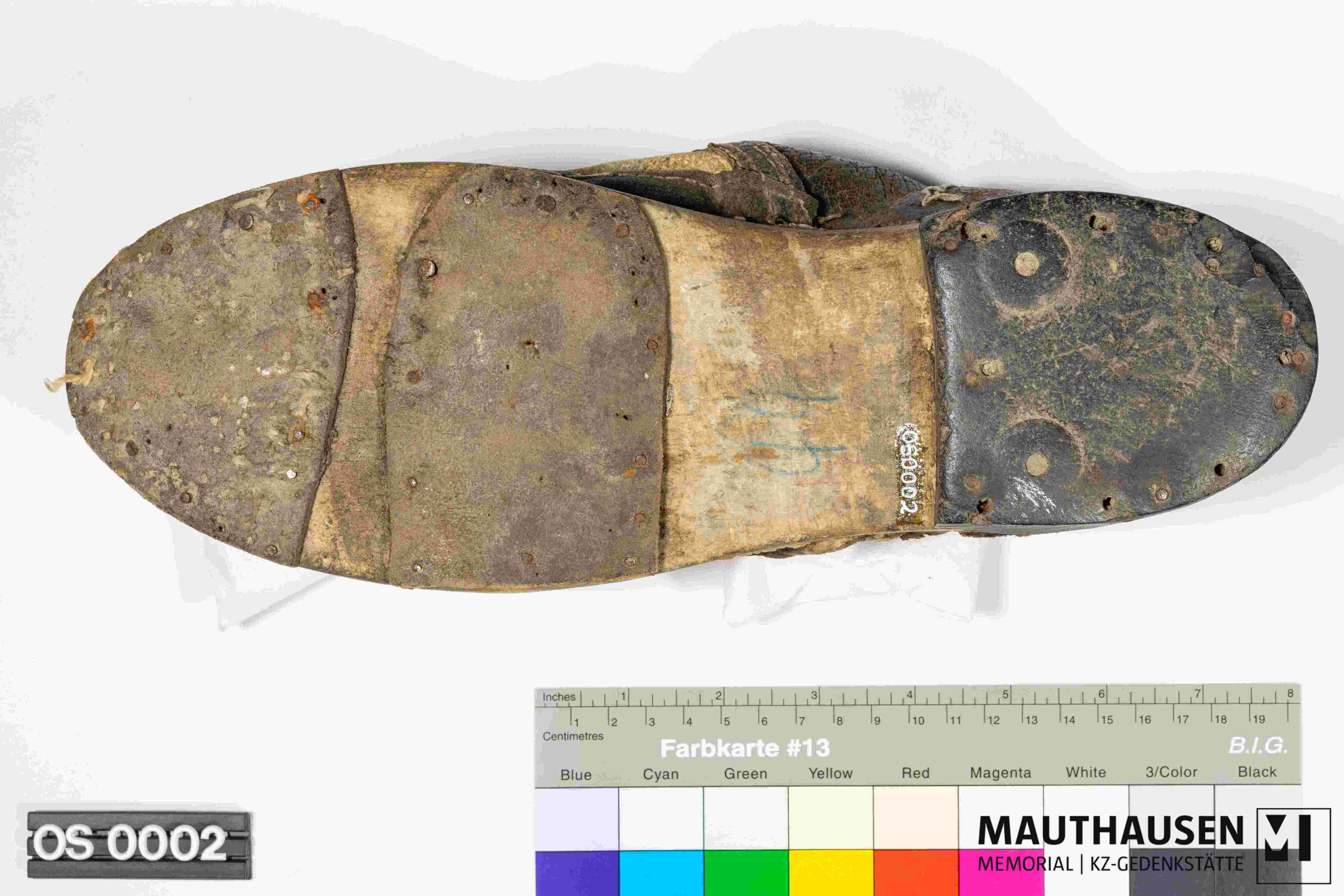 DescriptionSieht ähnlich aus dem Schuh OS0001, allerdings unterschiedliche Größen; Daten über Schuhe: fld Nr: 28 und 69 (In: Bestandsaufnahme Archiv BM.I). mit Tusche