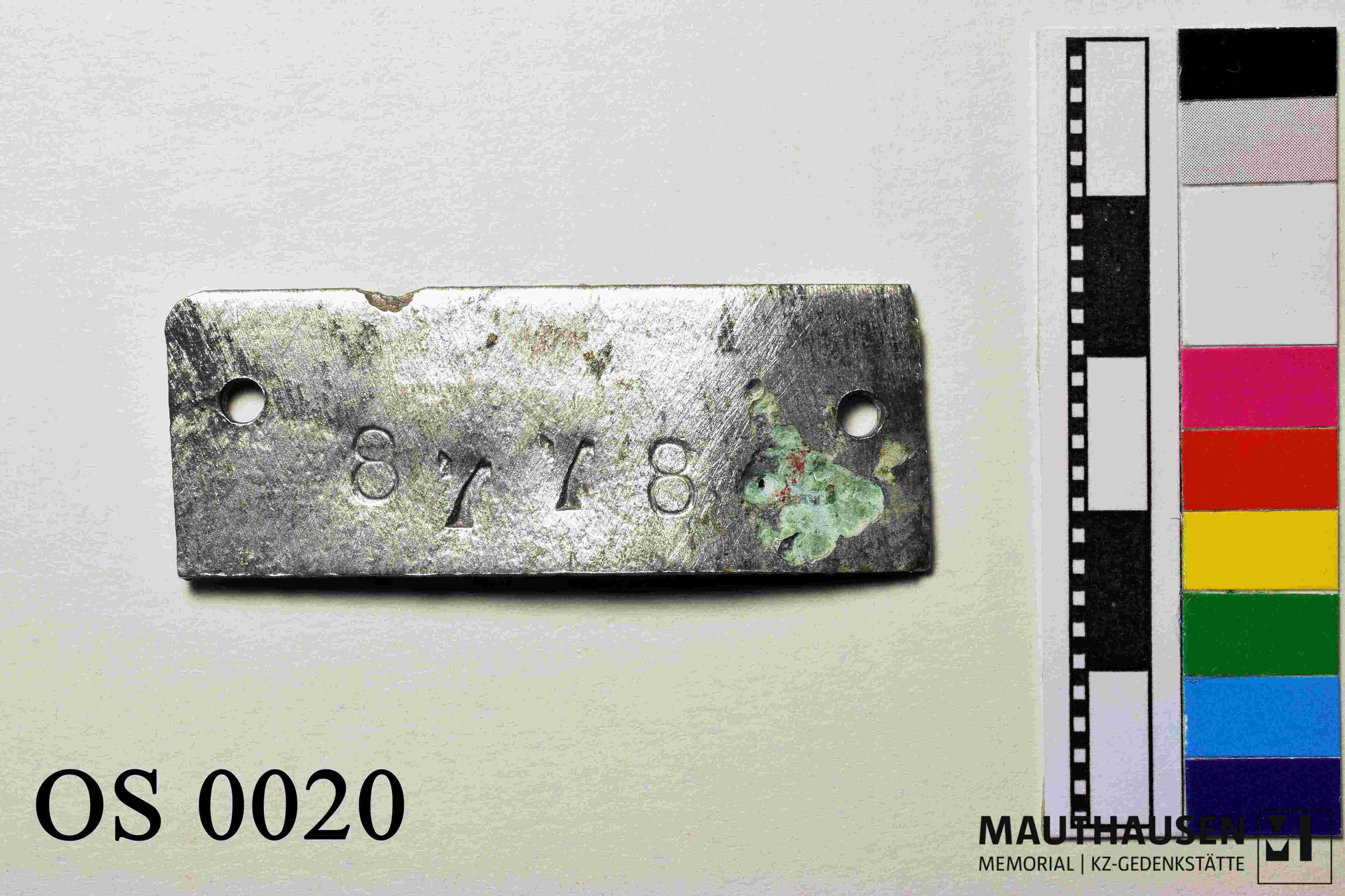 mit der Nummer 8778[?] eingestanzt. Rechteckiger Korpus. 2 kreisrunde Ausnehmungen. Korpus leicht verbogen. Kratzspuren an gesamter Oberfläche. Veränderungen (Grünspan?) va. an der Vorderseite, aber auch leicht an der Rückseite