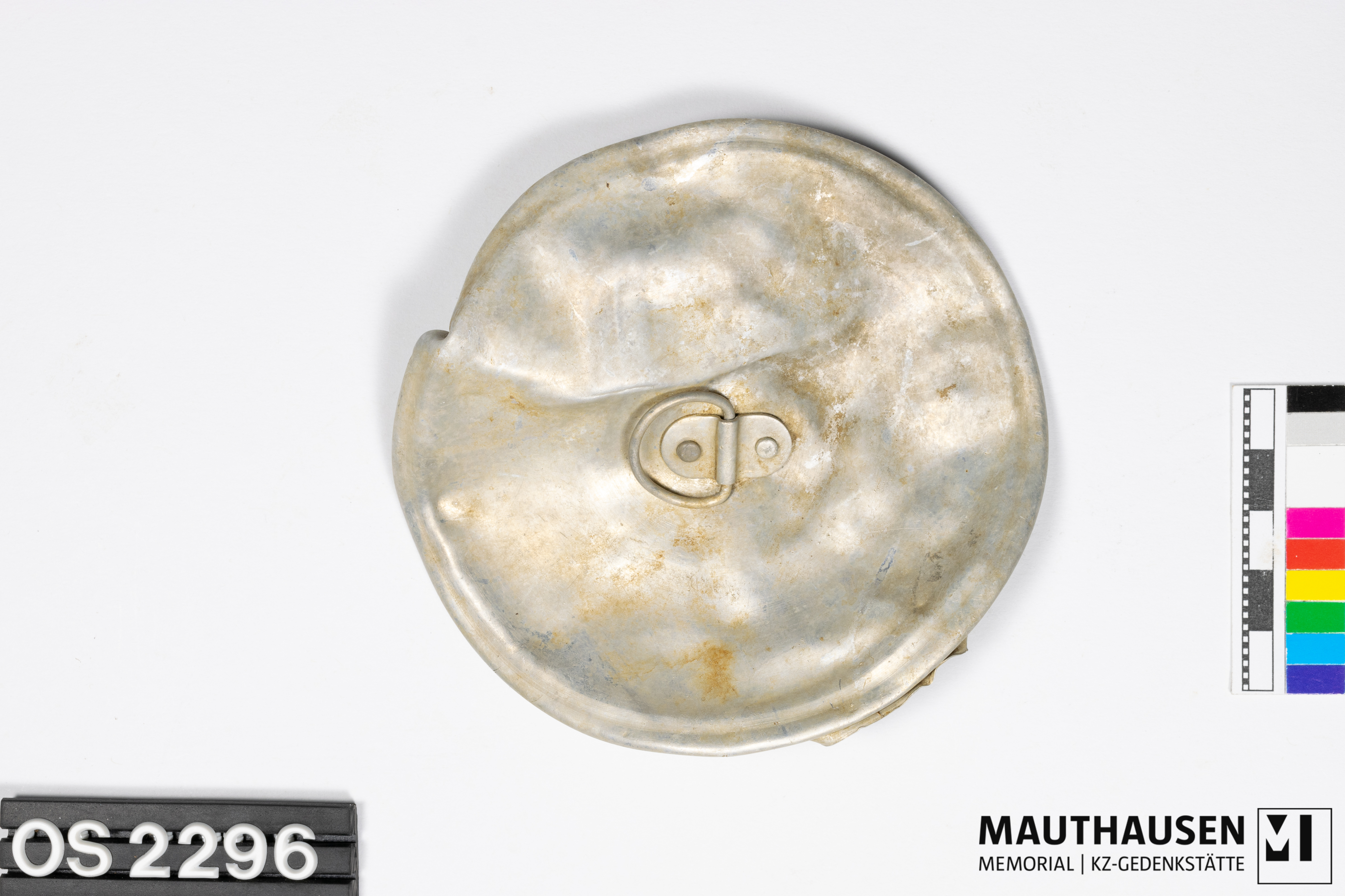Deckel mit Henkel; ursprünglich rund, deformiert; umgebogener Rand; Henkel: halbrund, beweglich, angbracht mit Blech und zwei Nieten
