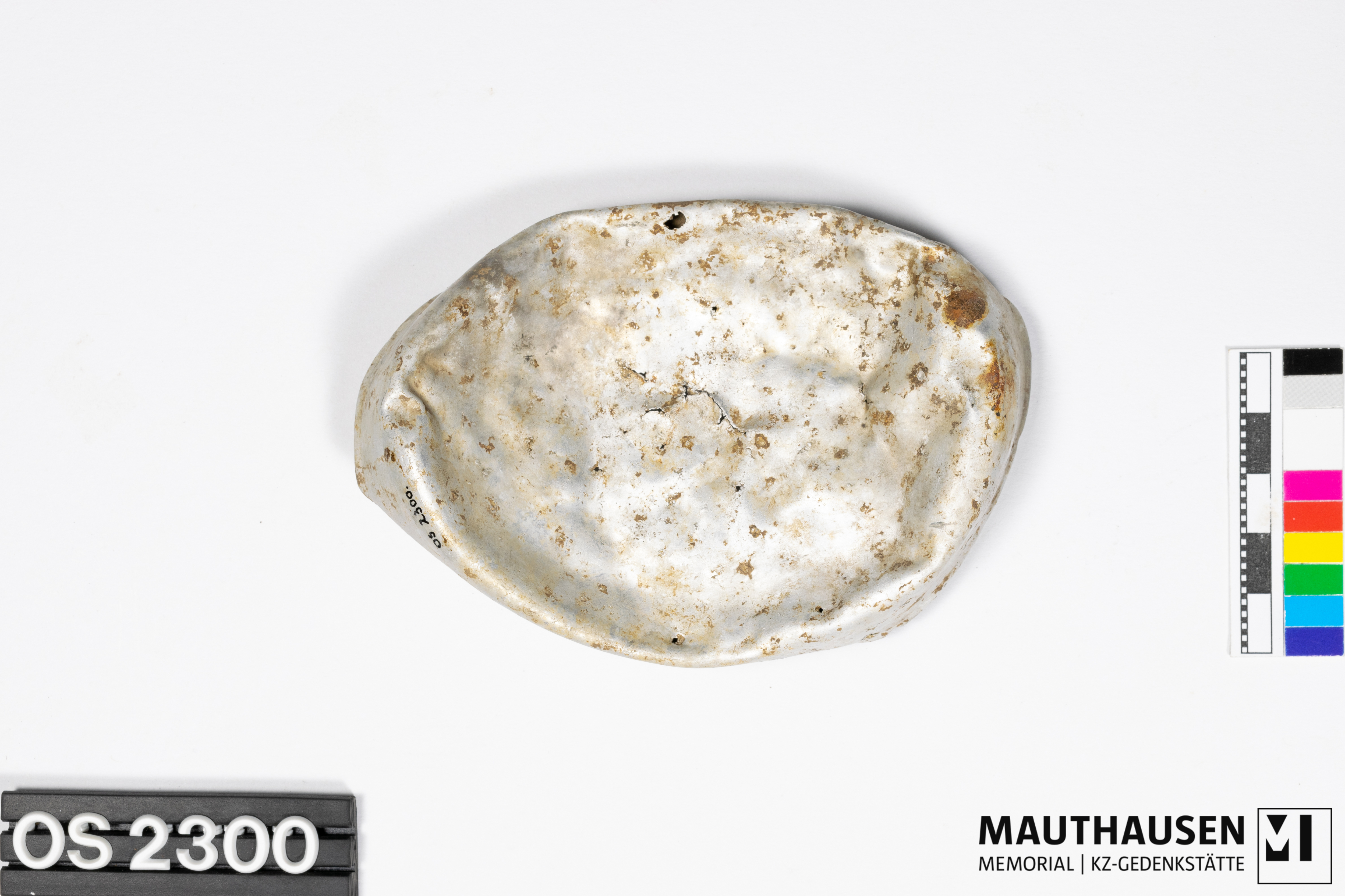 DescriptionUnterteil einer Dose; stark deformiert/eingedrückt; Form ehemals oval oder rechteckig; gerader scharfkantiger Rand; nahe Rand umlaufende erhabene Leiste (3mm Stärke); rotbraune Rückstände an der Außenseite/Boden
