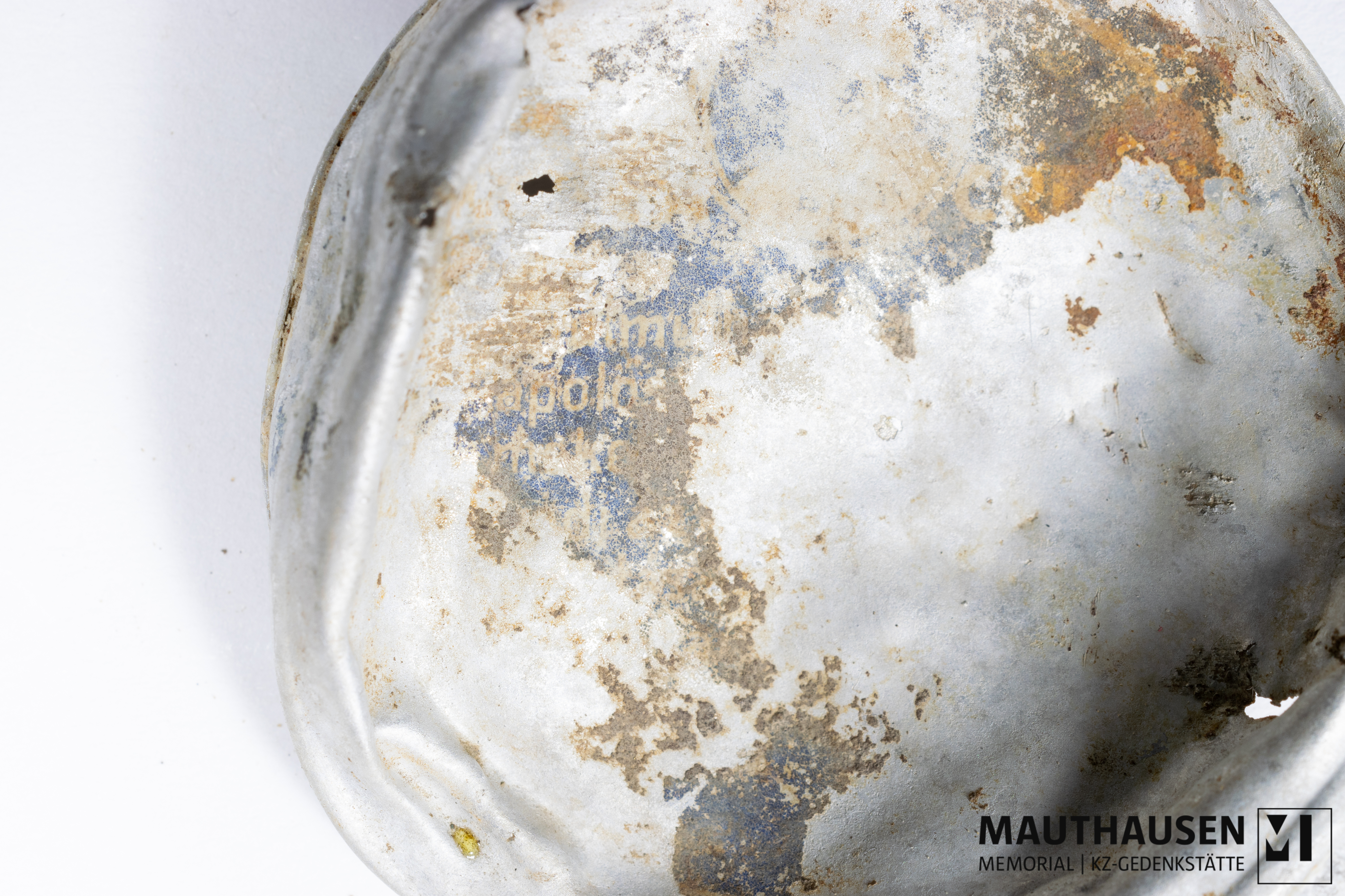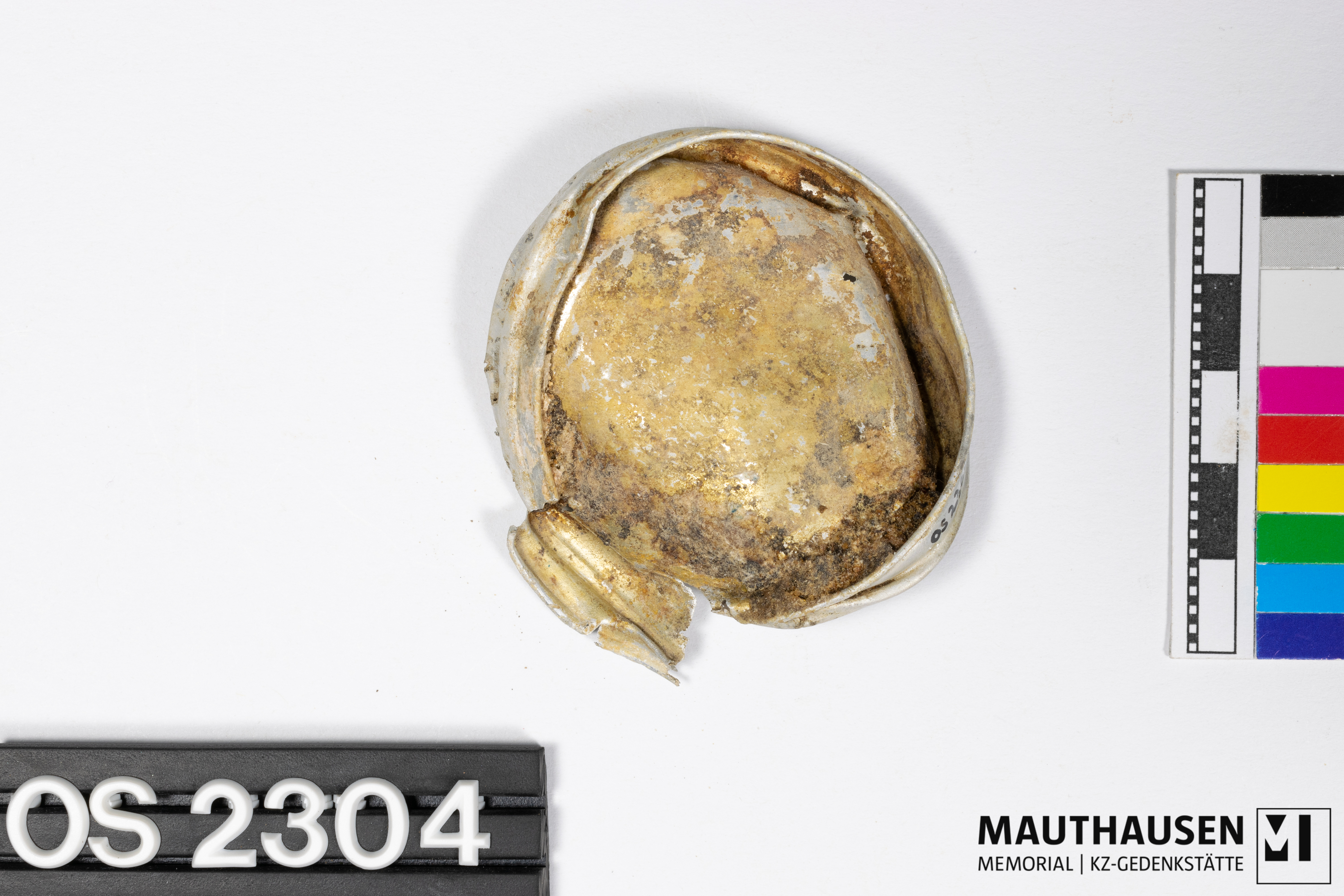 Unterteil einer Dose; zerdrückt; Form ursprünglich rund; Teil vom Rand ausgerissen; Innen: Reste des Inhalts erhalten, braune körnige feste Masse; Außen: Reste von Beschriftung und blauer Farbe