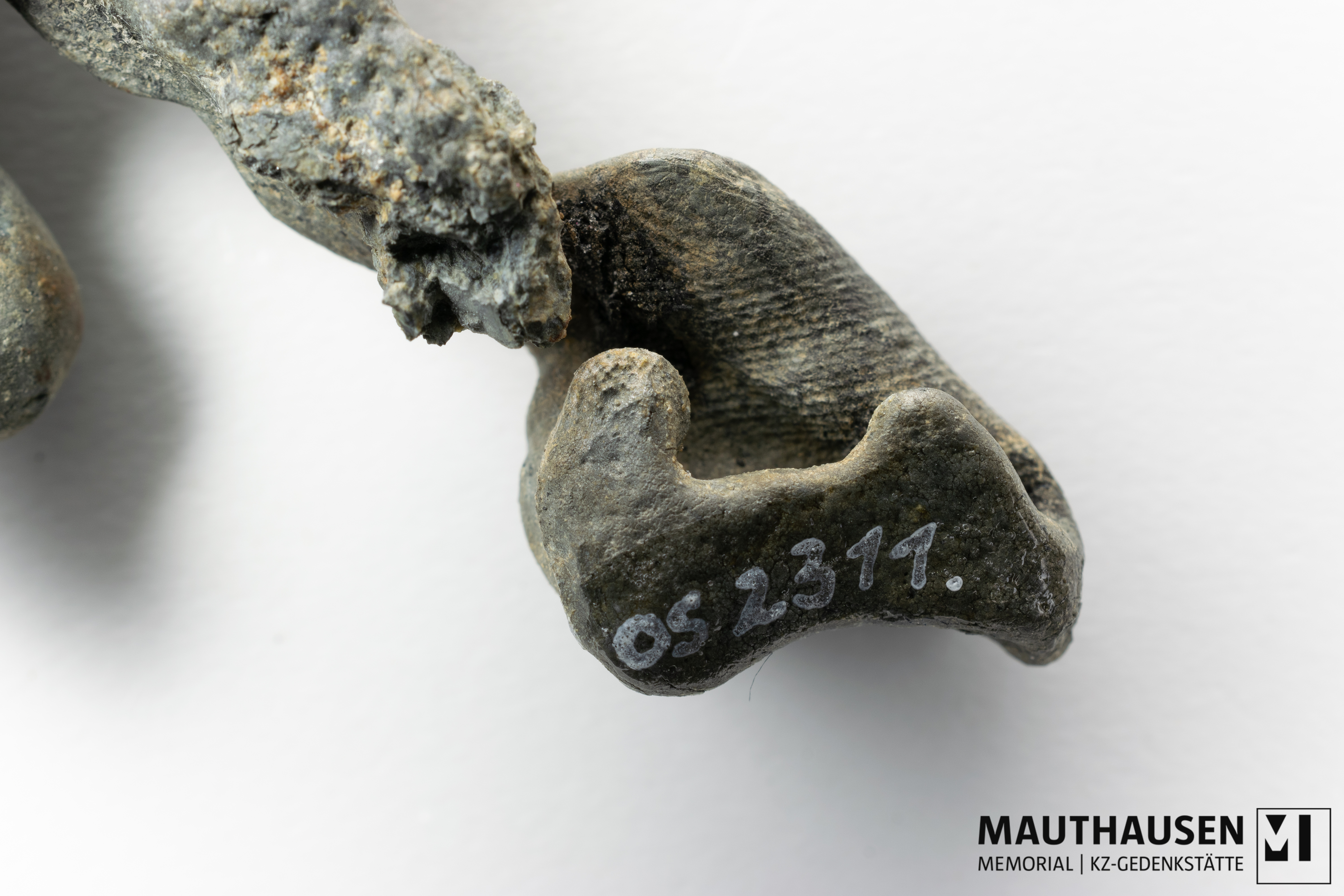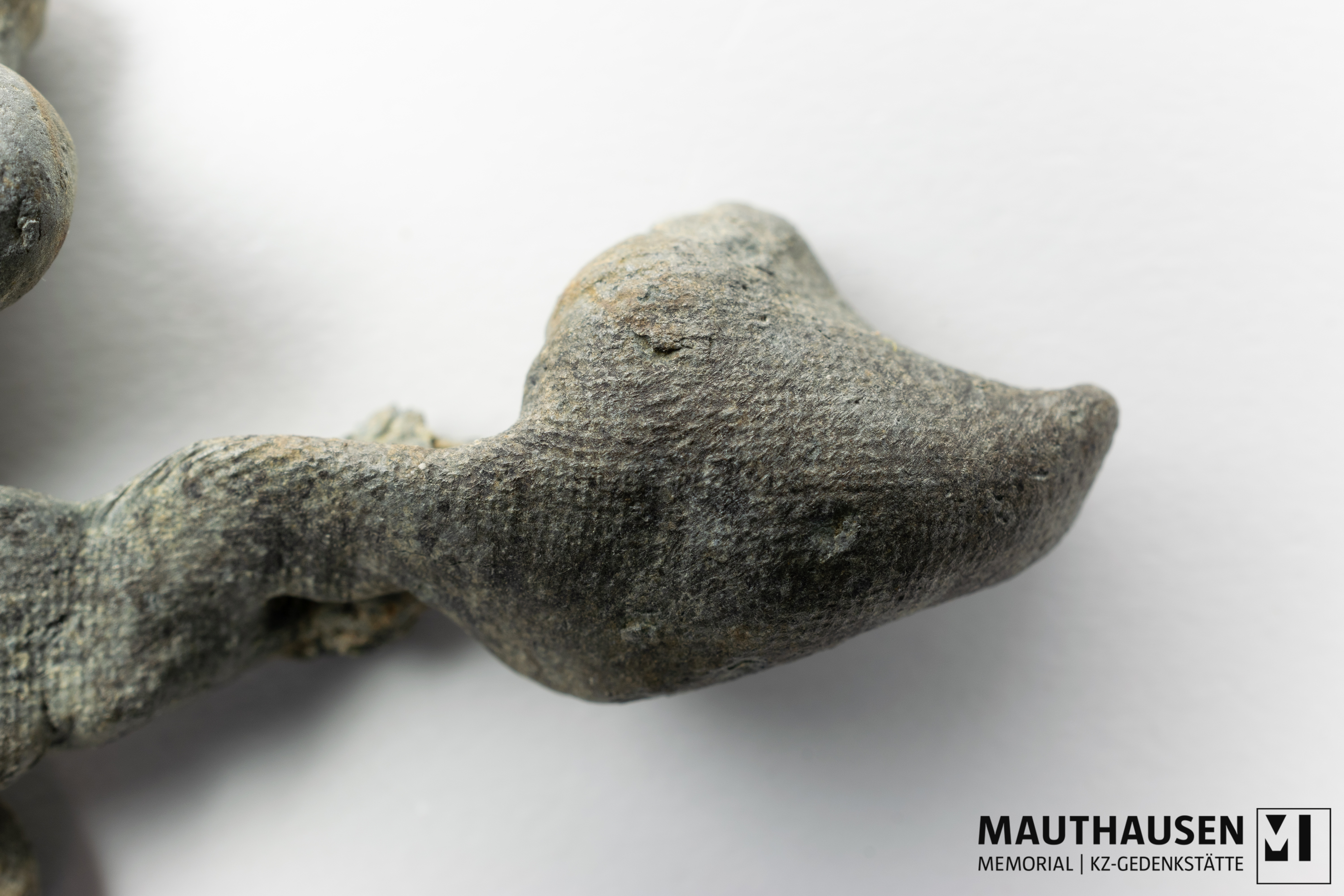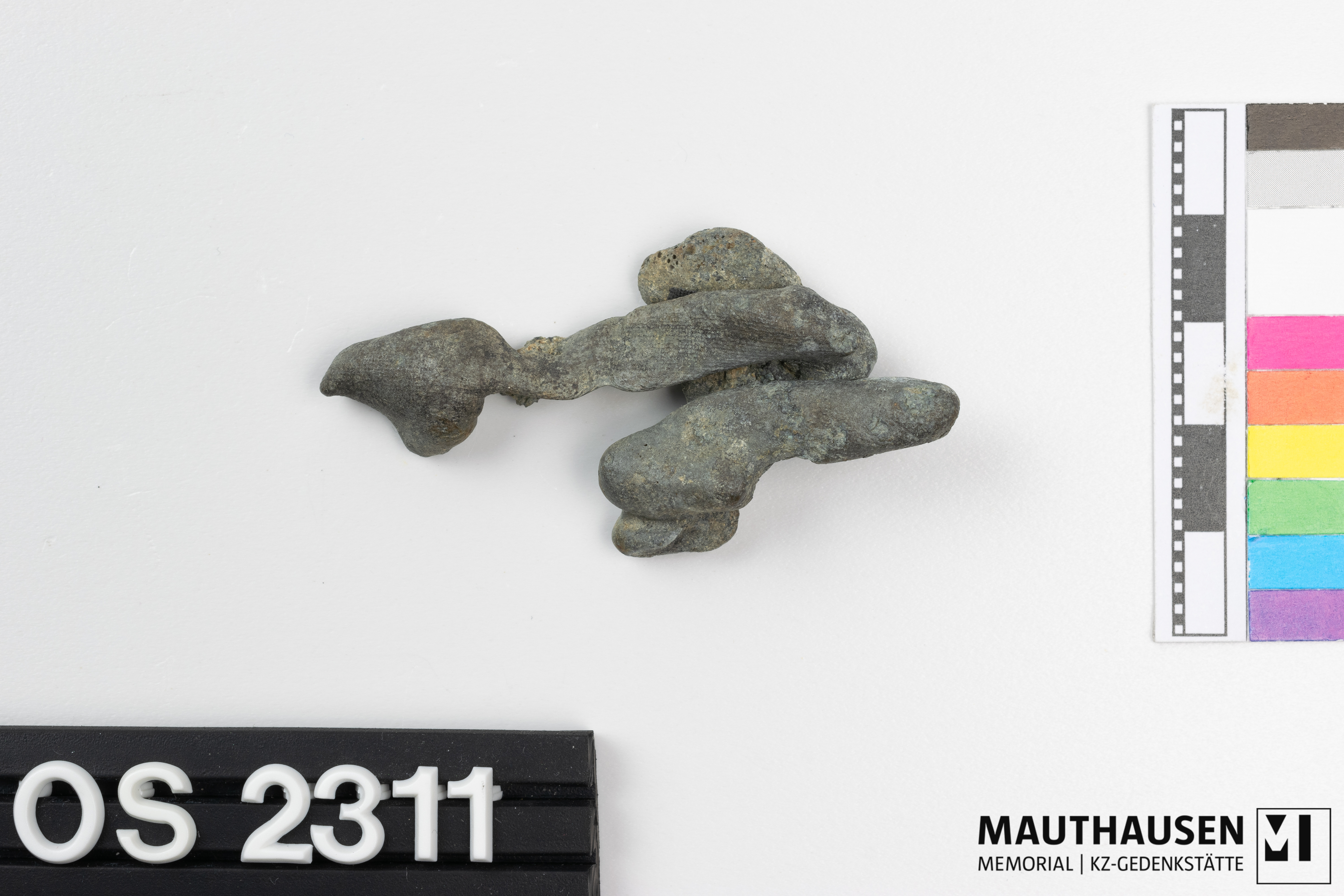 klumpenartiges Objekt; wirkt wie durch Erhitzung zusammengeschmolzen; ein Ende wirkt hakenartig; schwarze Textilreste haften an