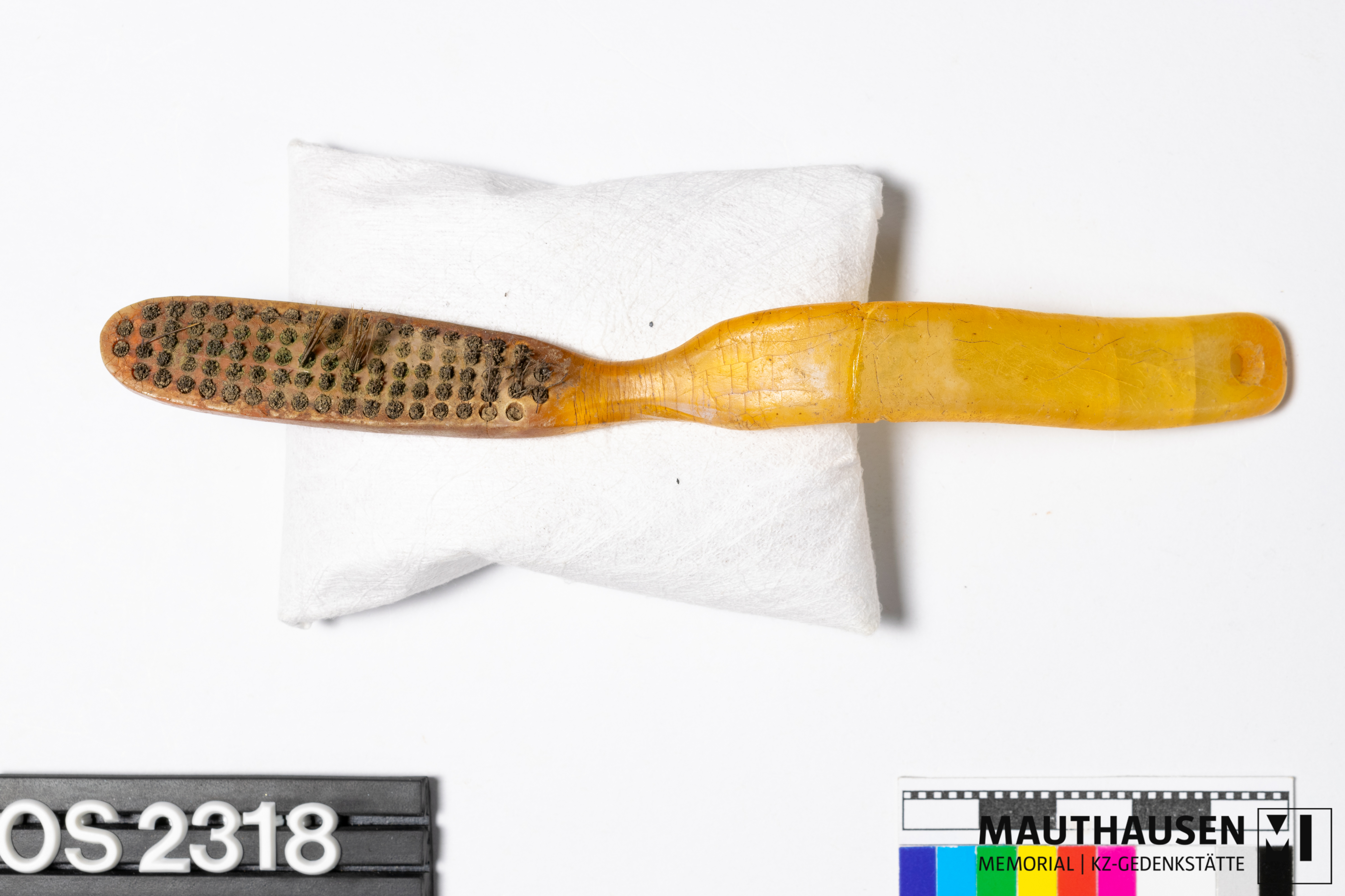 Zahnbürste; deformiert; im Bereich des Griffes stark gebogen; Kunststoff ist orangefarbig und durchscheinend/transparent, bei Kopf Farbe eher bräunlich-rötlich (gut auf Rückseite sichtbar); braune Borsten sind am Kopf erhalten, meist nur noch Ansätze aber auch einzelne längere; am Stielende runde Durchlochung; Zahnbürste ursprünglich in zwei Teile zerbrochen, im Zuge der Restaurierung geklebt