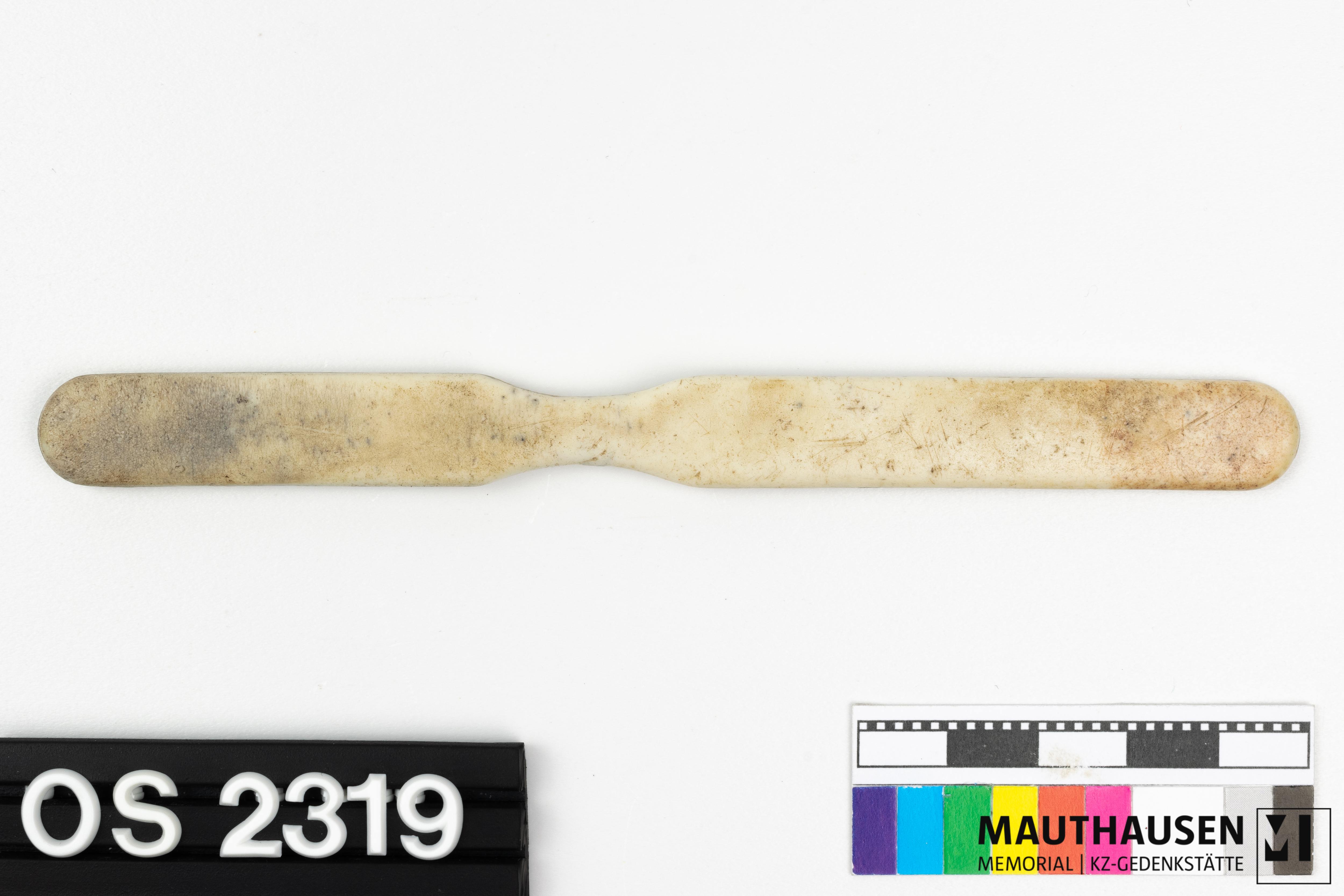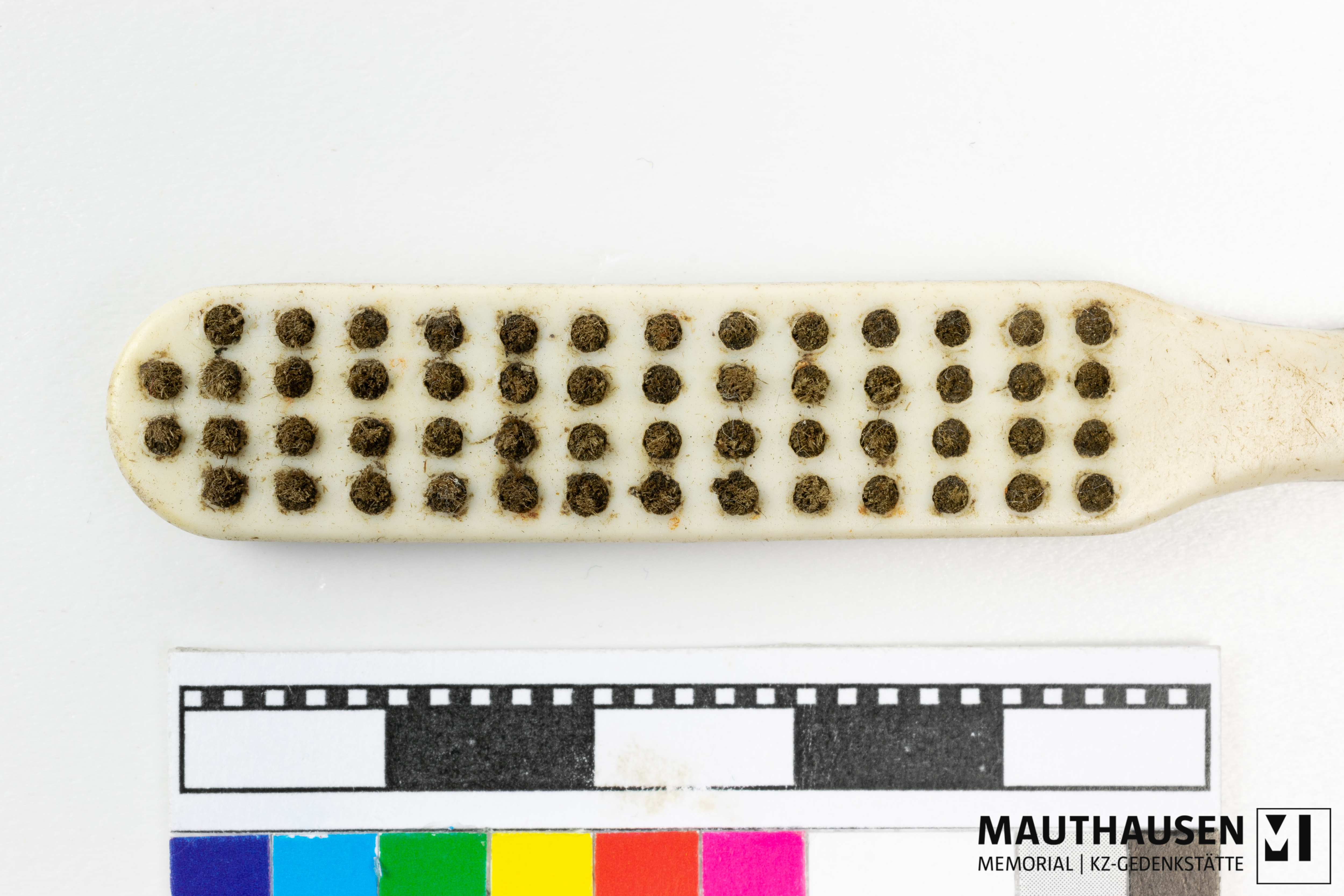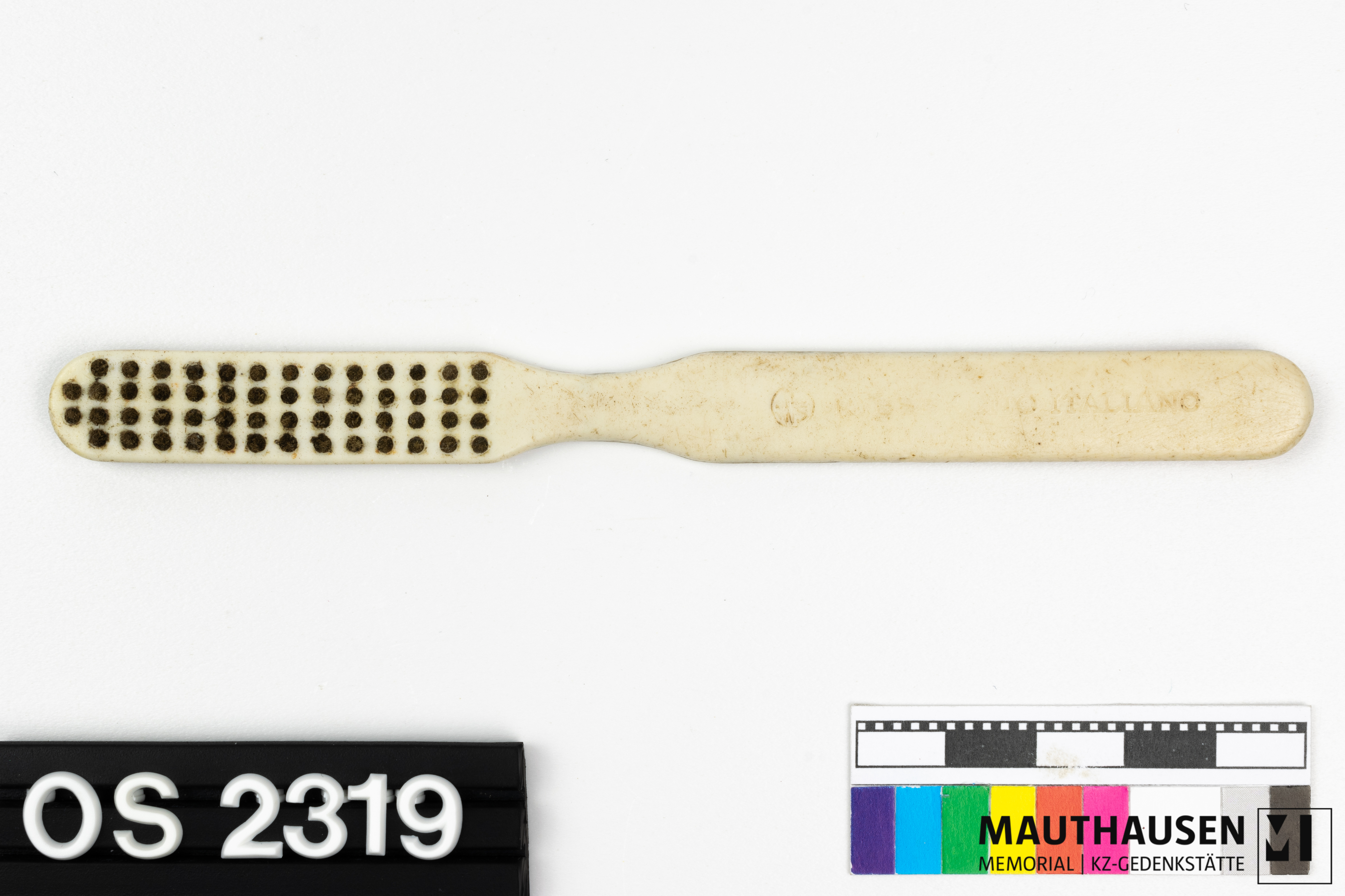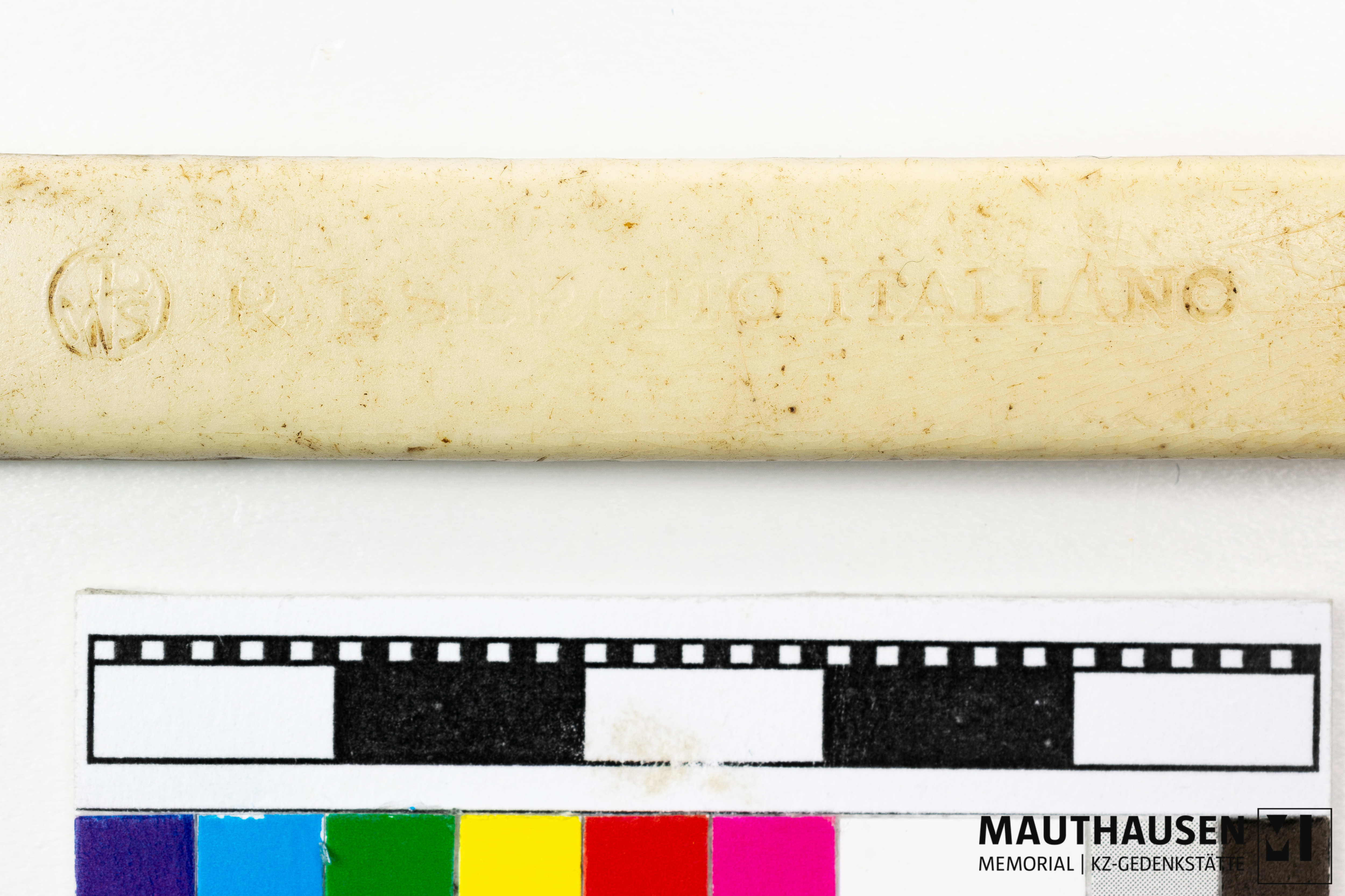Borsten vermutlich aus Schweine- oder Pferdhaar; bei Prägung "R Esercito Italiano" handelt es sich um die italienische Luftwaffe (Regio Esercito); Logo mit Buchstaben nicht identifiziert; Zahnbürste kam vermutlich mit einem italienischen Kriegsgefangenen ins Lagersystem Mauthausen