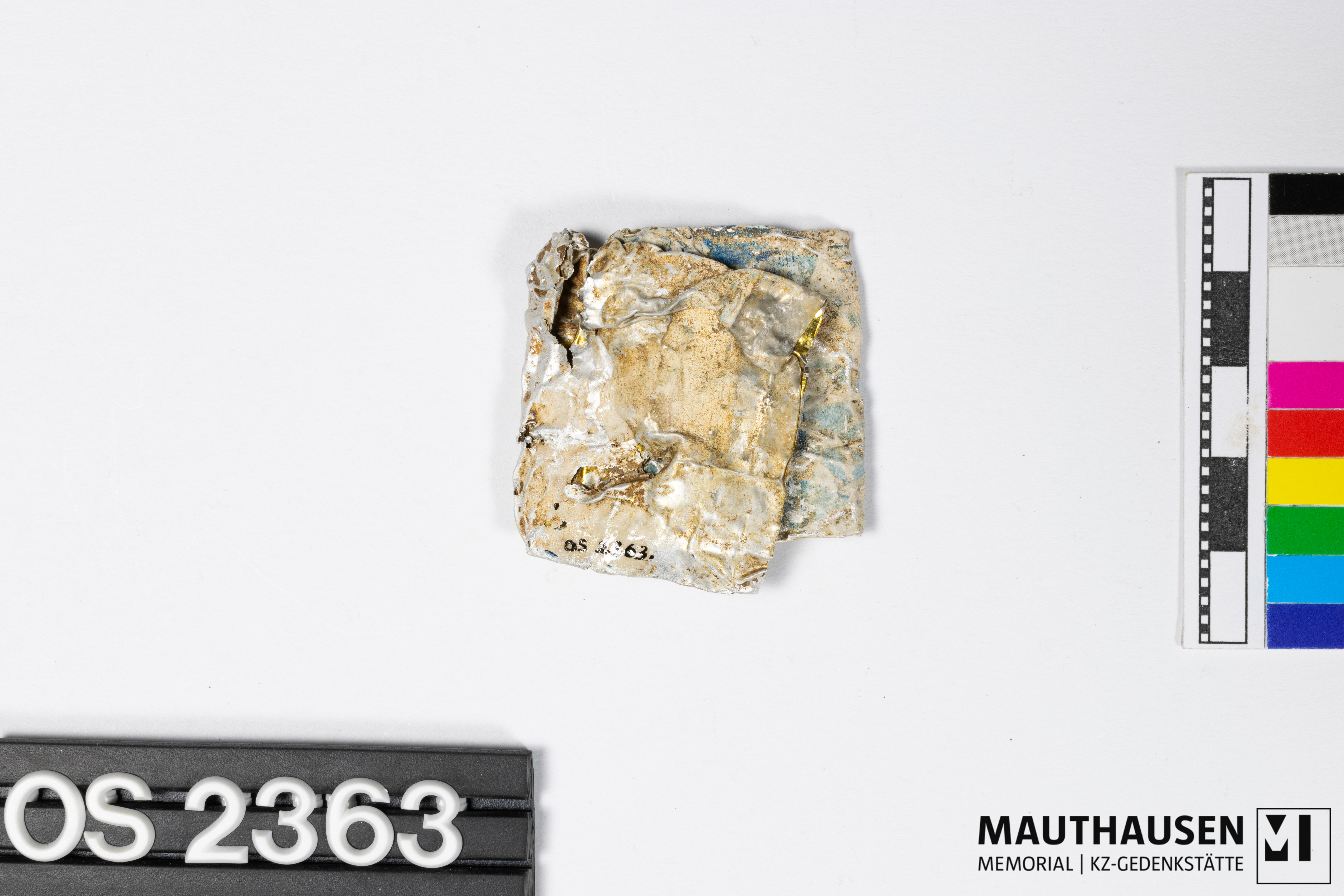 DescriptionTube; zweimal gefaltet; zusammengedrückt; Form ursprünglich zylindrisch; Enden wirken wie abgeschnitten; durch Risse ist Inneres der Tube erkennbar, Oberfläche dort goldfarben