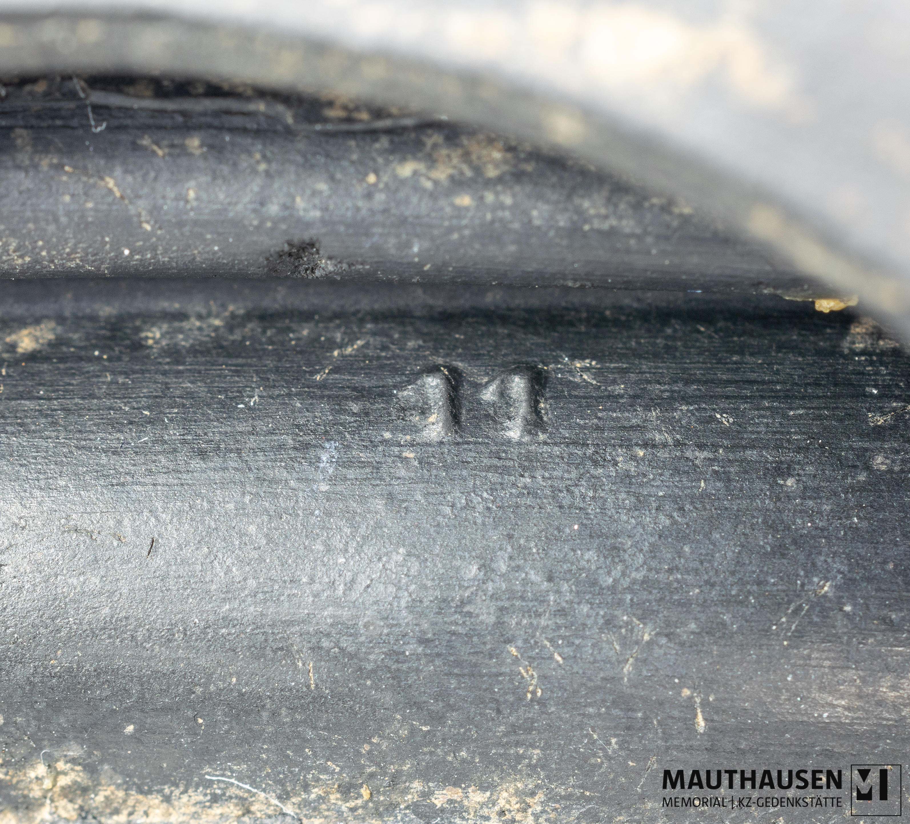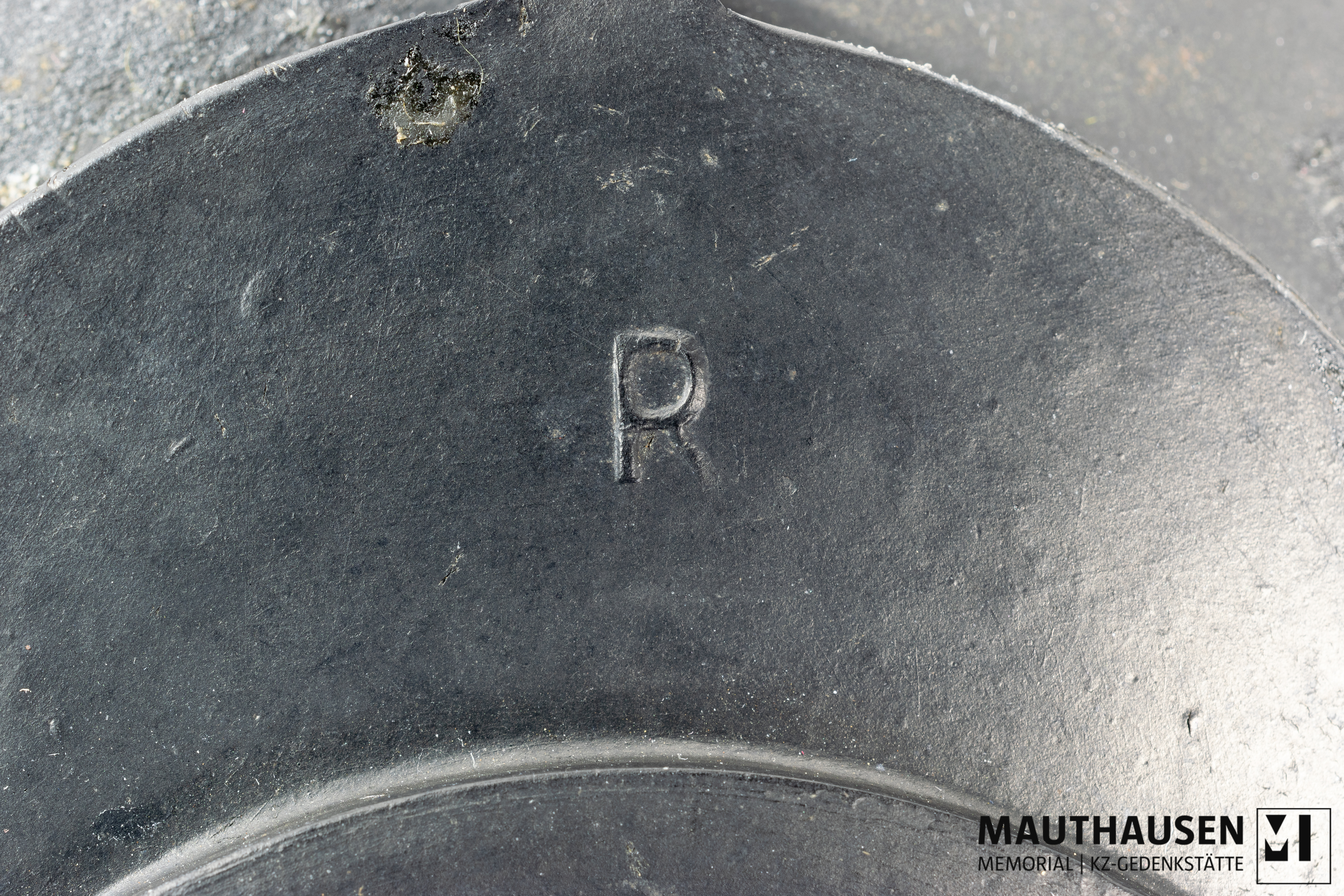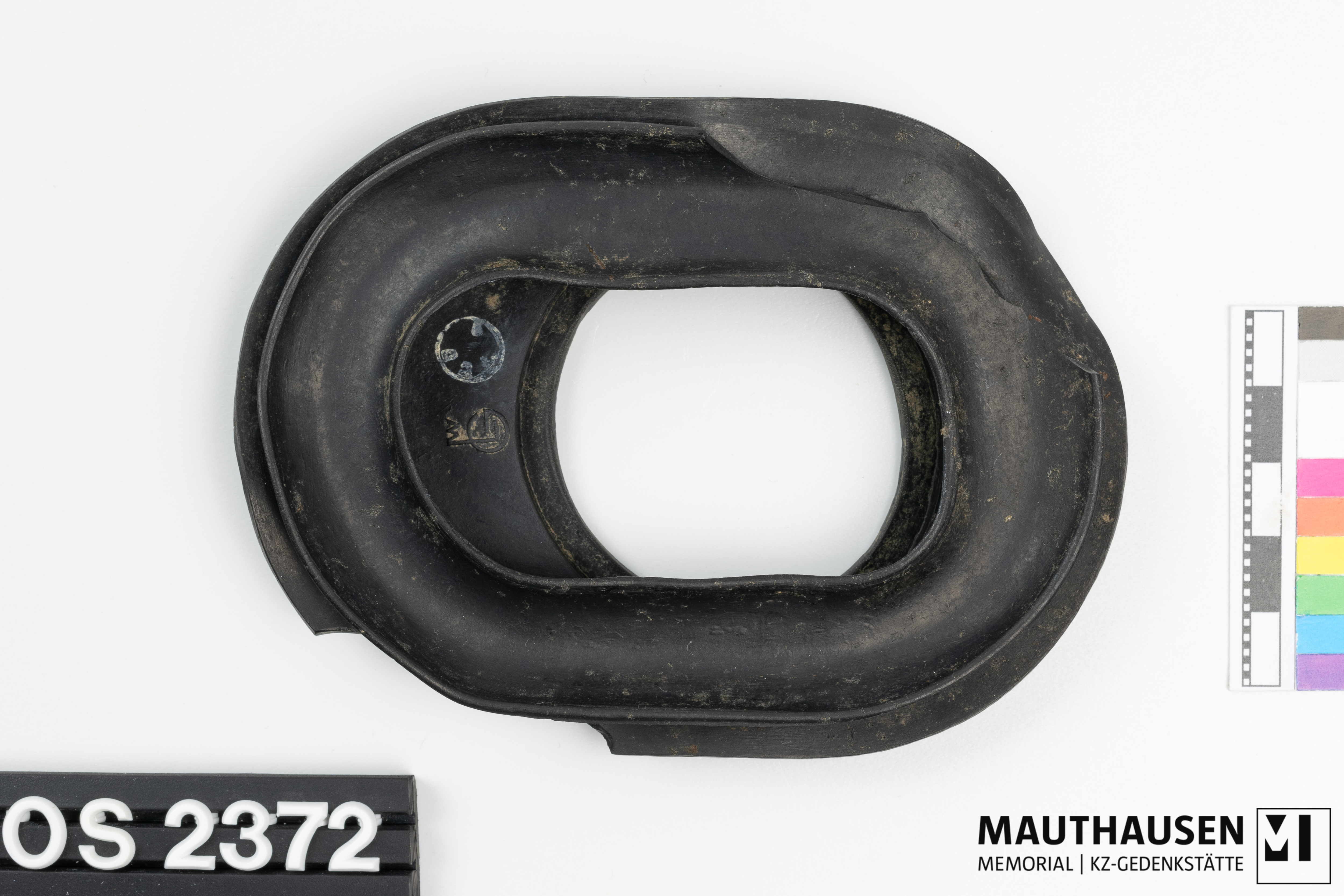 DescriptionTeil einer Gasmaske; deformiert; ovale Form; vier Lagen (von Außen nach Innen): erste Lage ist oval/rund; darunter zweite Lage länglich oval mit je einem kleinen Fortsatz an der Längsseite, eine Kerbe an Schmalseite; darunter dritte und vierte Lage lang oval