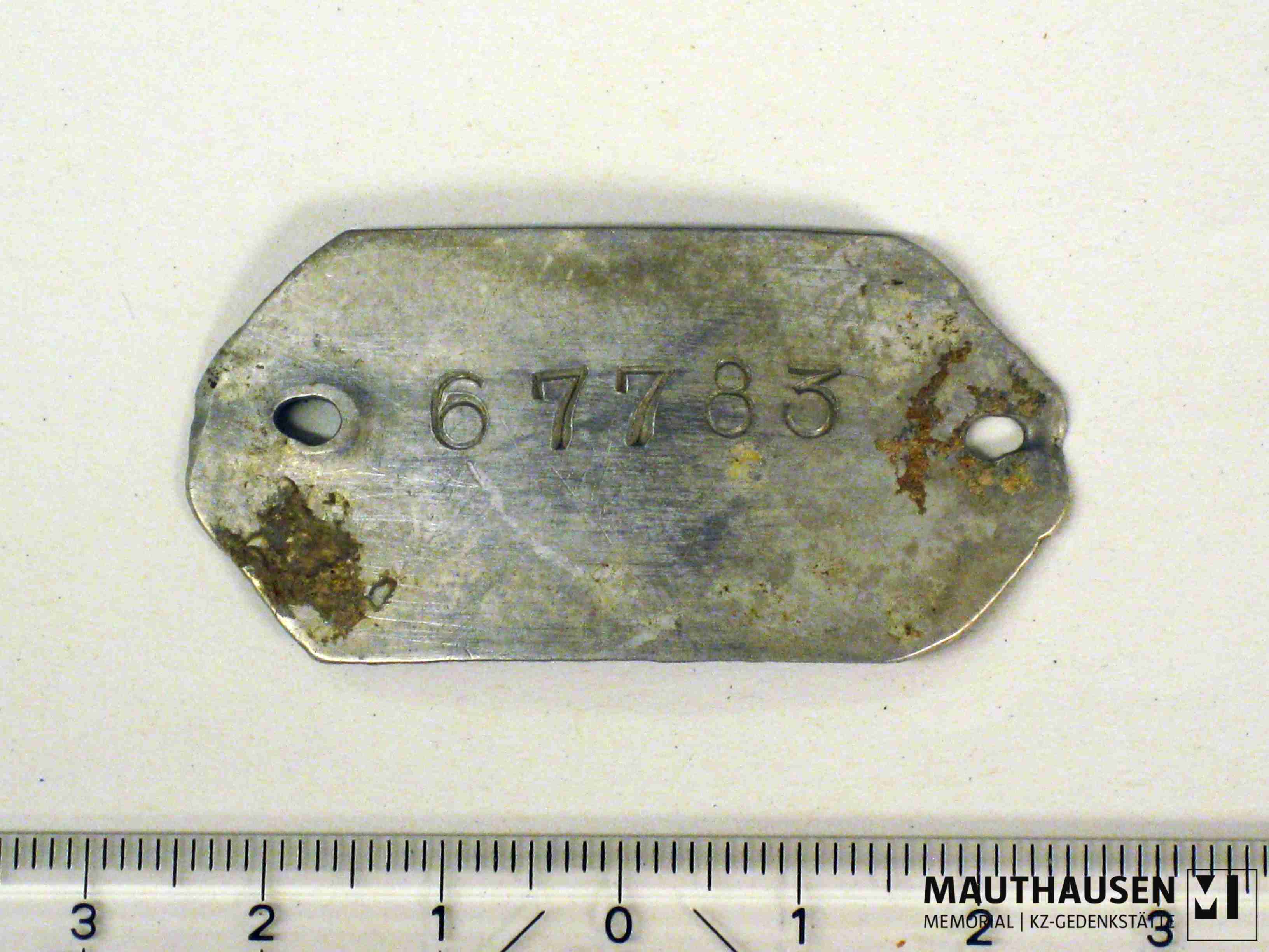 mit der Nummer 67783 eingestanzt. 2 kreisrunde Ausnehmungen. Marke leicht gebogen. leichte Veränderungen der Korpusoberfläche. Kratzspuren