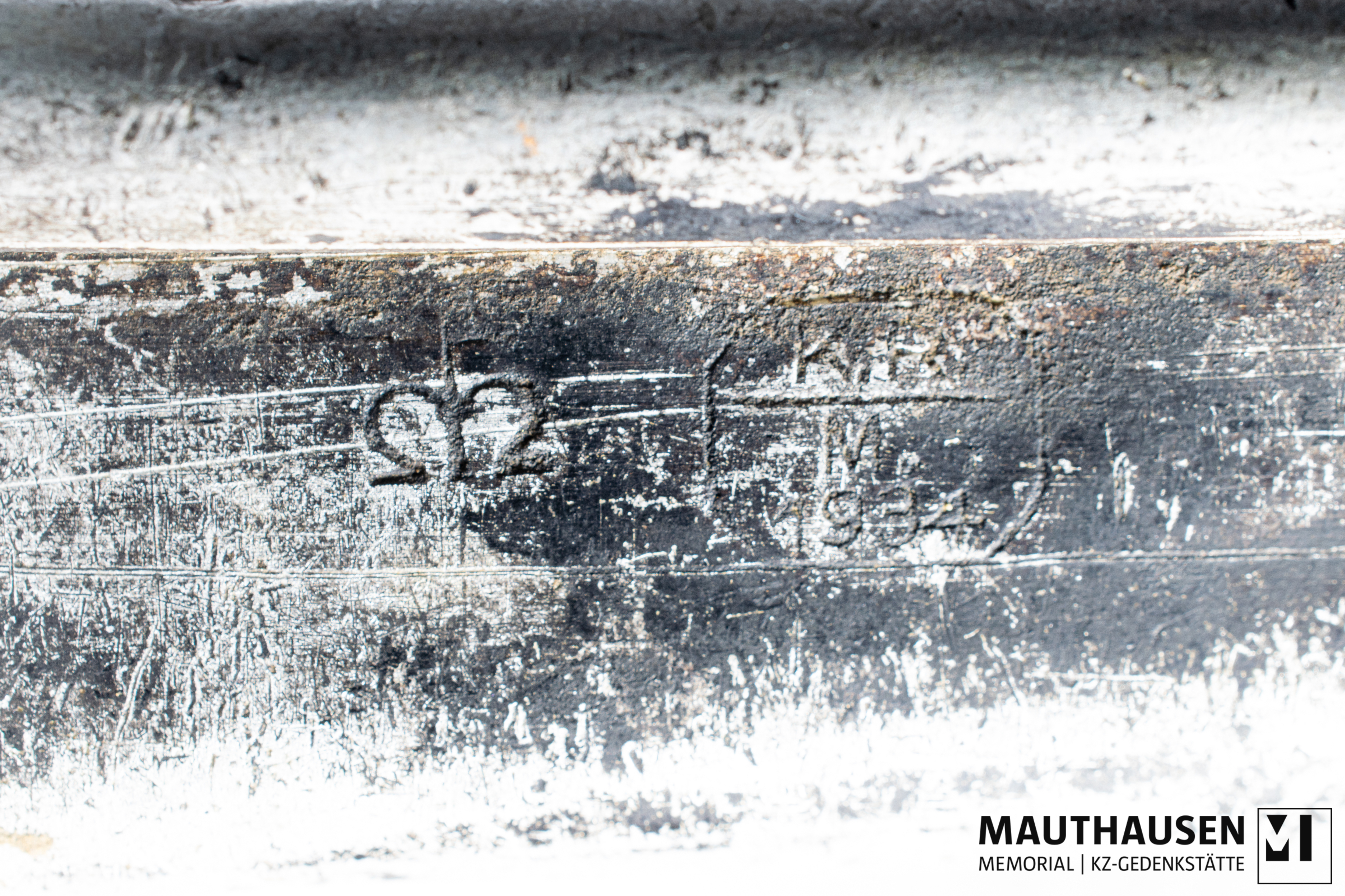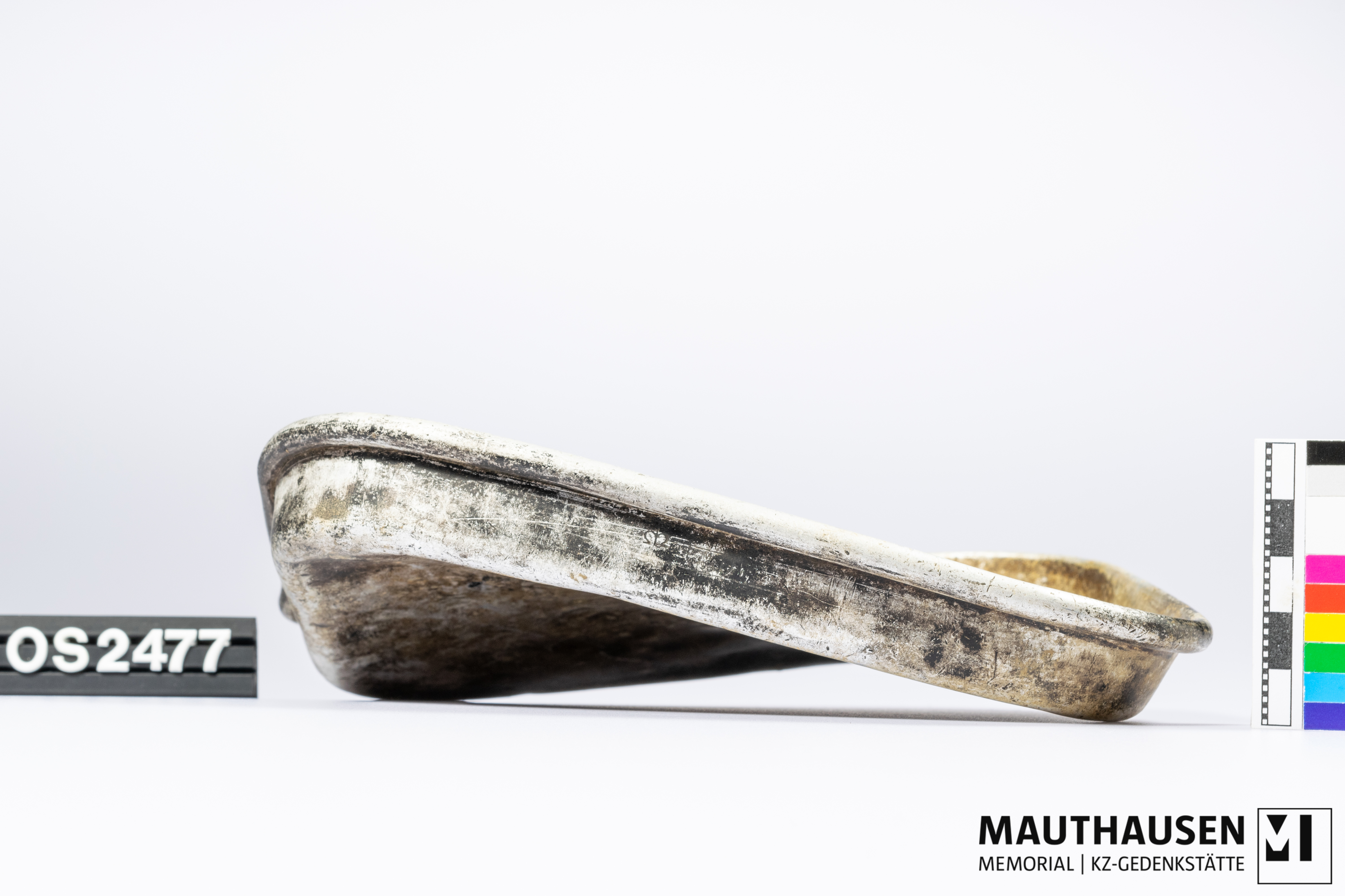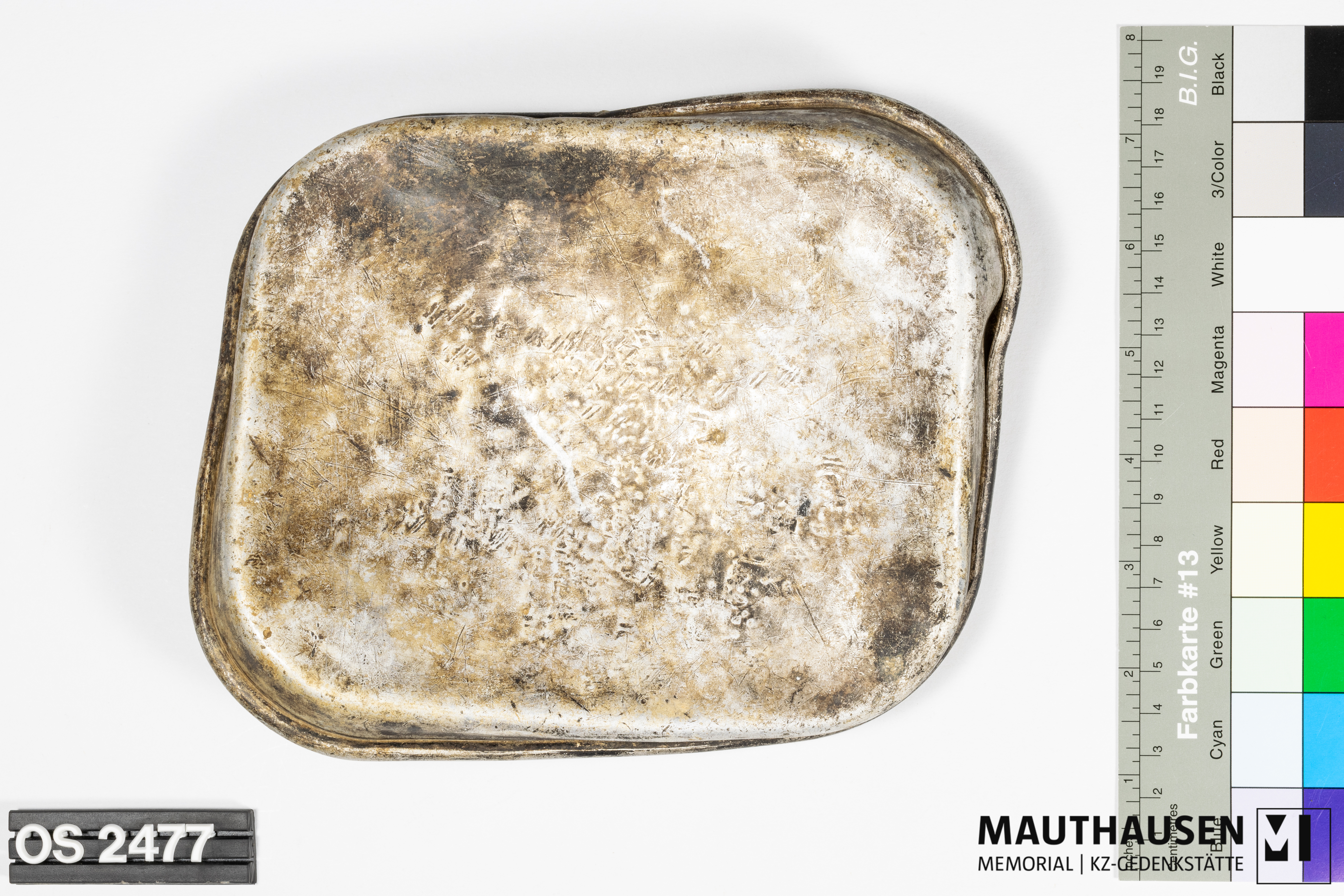 DescriptionFeldgeschirr; Aluminium; deformiert; Form ursprünglich rechteckig; eingerollter Rand; abgerundete Ecken; an einer Längsseite Innen Blech mit zwei Rundkopfnieten an der Wand befestigt; Blech einmal gefaltet, oben großer runder Durchlass; Nieten an der Außenseite sichtbar; Rußspuren; Beschriftungen an einer Längsseite unterhalb Rand punziert: links Motiv mit Buchstaben "MF", rechts daneben Ackteck, darin "K.R.", darunter waagrechte Linie, darunter "M.", darunter "1934"