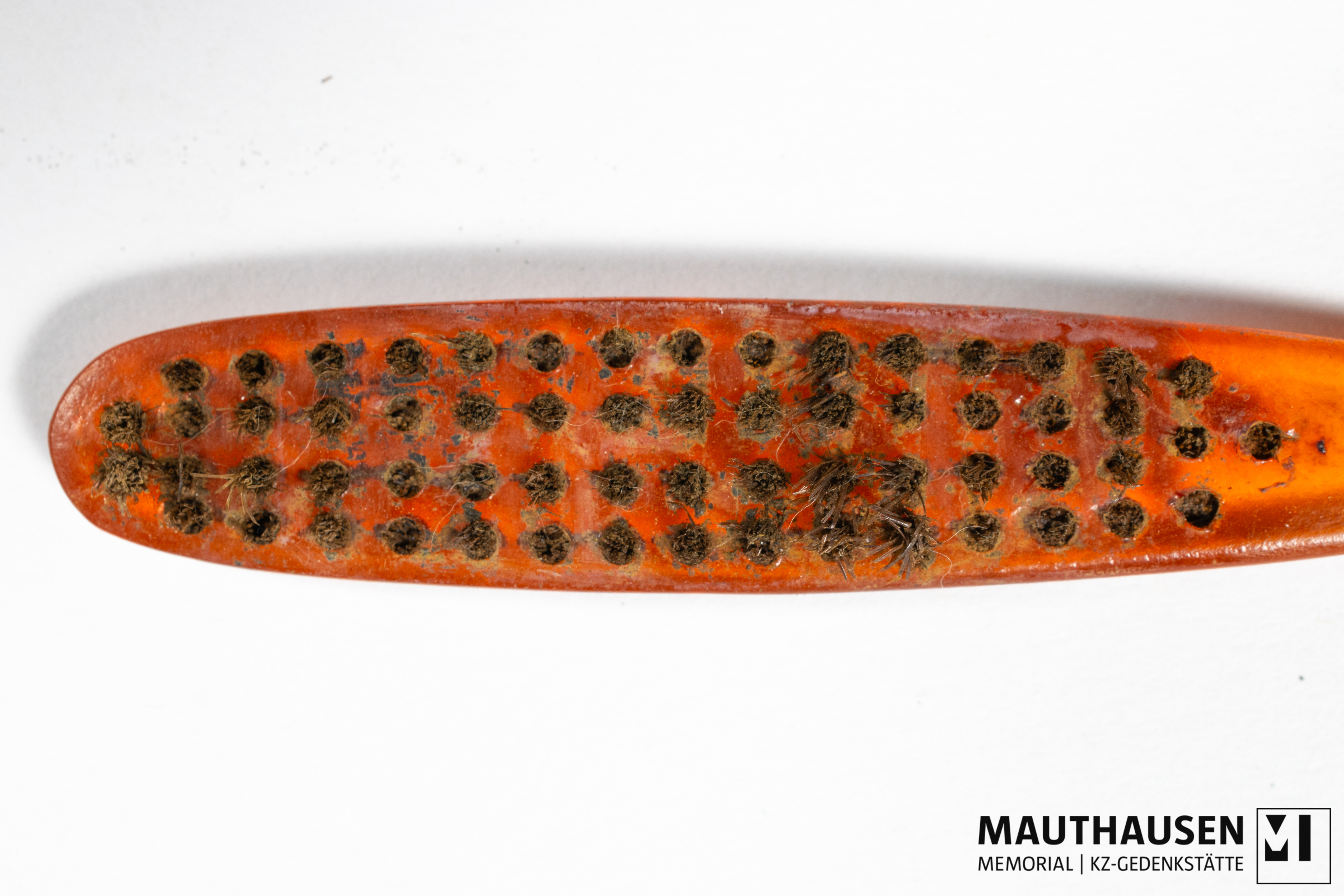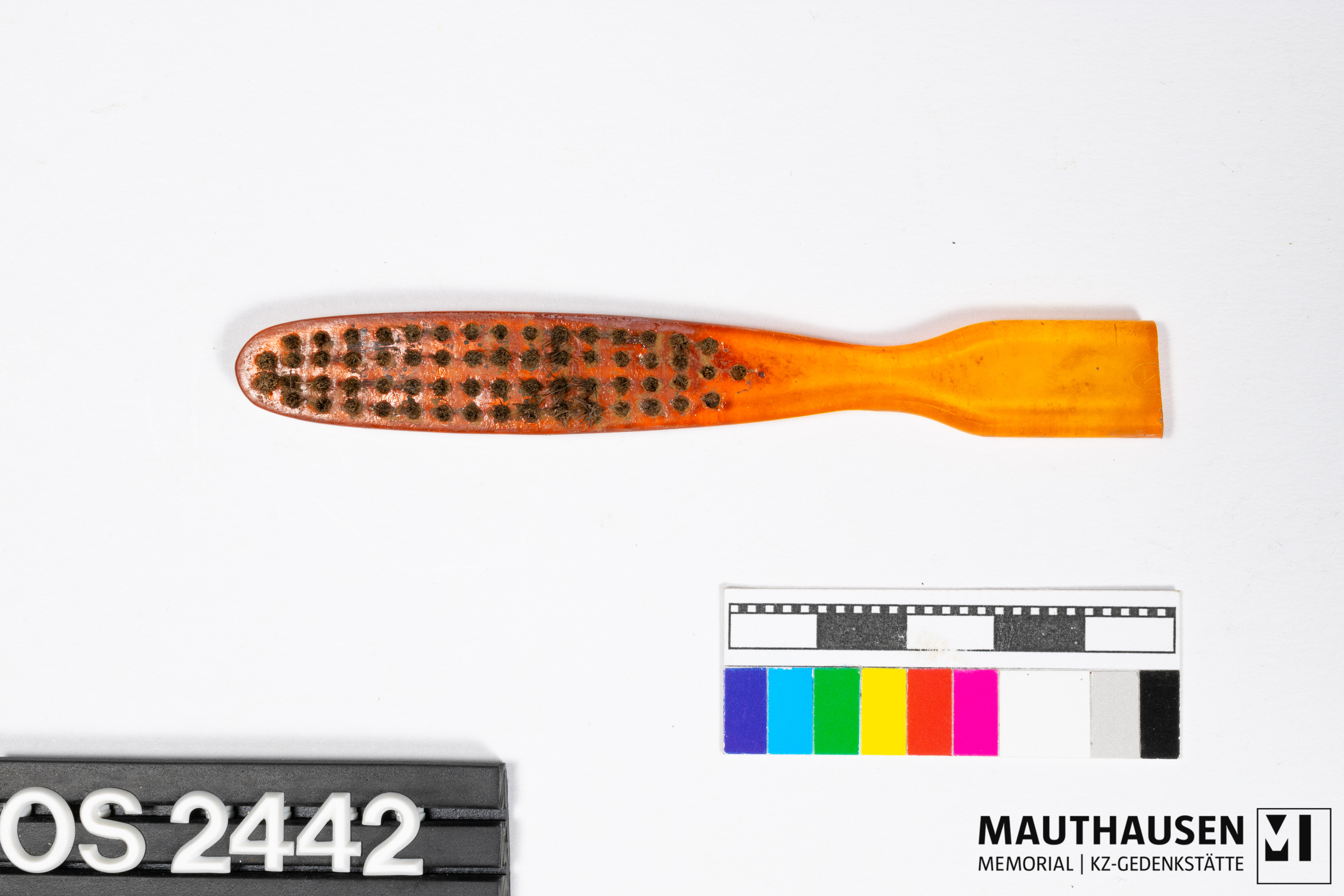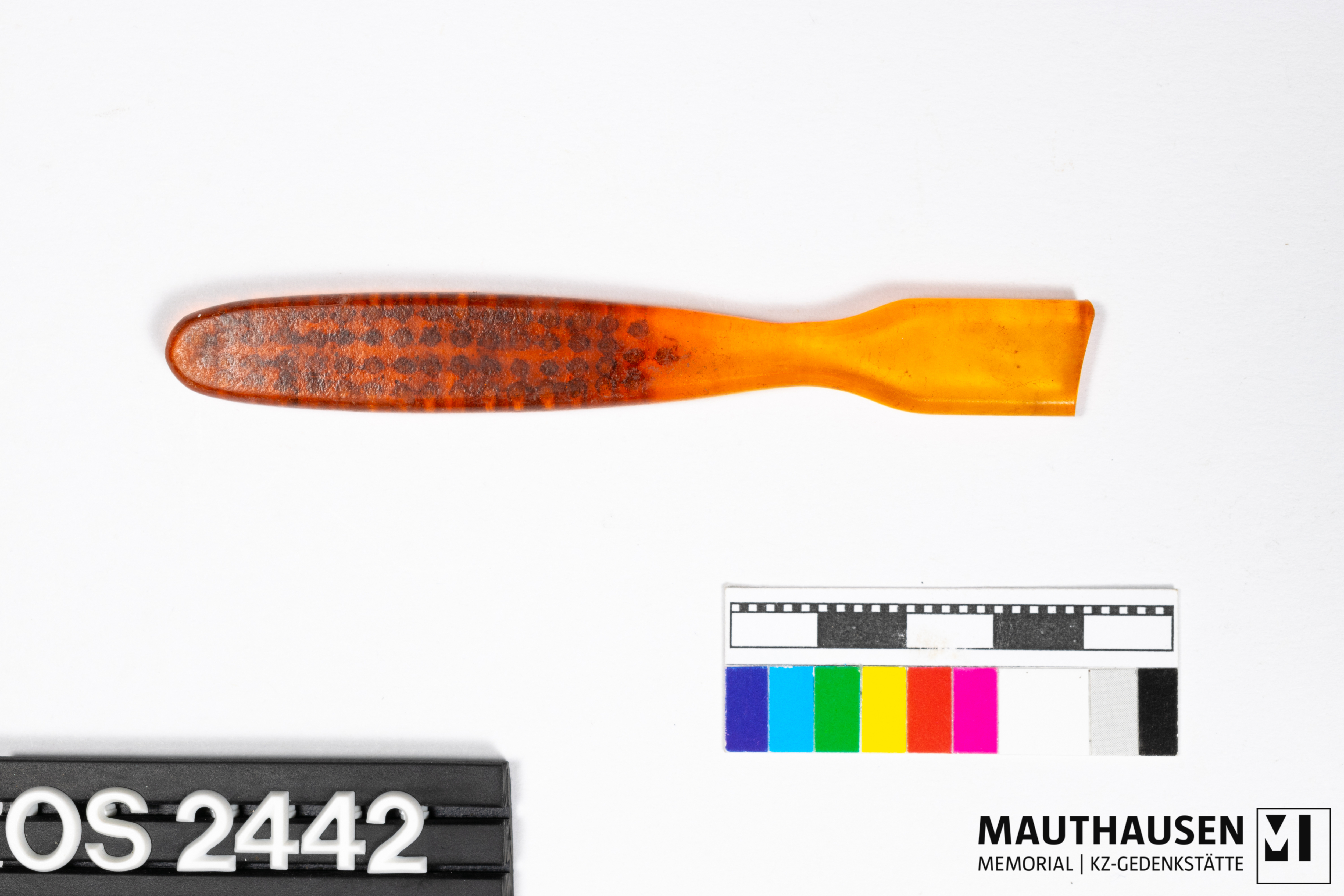 DescriptionFragment einer Zahnbürste; Kunststoff; orange-transparent; Stiel zum Teil abgebrochen; 62 Löcher für Borsten; Borsten (Schweineborsten?) aus organischem Material nur im Ansatz erhalten und teils verbogen; länglich-ovaler Bürstenkopf; Verjüngung zwischen Bürstenkopf und Stiel; Bürstenkopf und Stiel gleich breit; Runde Enden; Glatte Oberfläche; Feine Kratzer; industrielle Beschriftung an Bruchkante des Stiels sichtbar ["1"?], ["M"?], [Markenlogo?]; weitere industrielle Beschriftung "5" am verjüngenden Übergang Bürstenkopf zum Stiel.